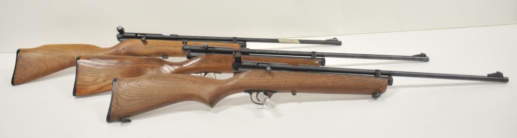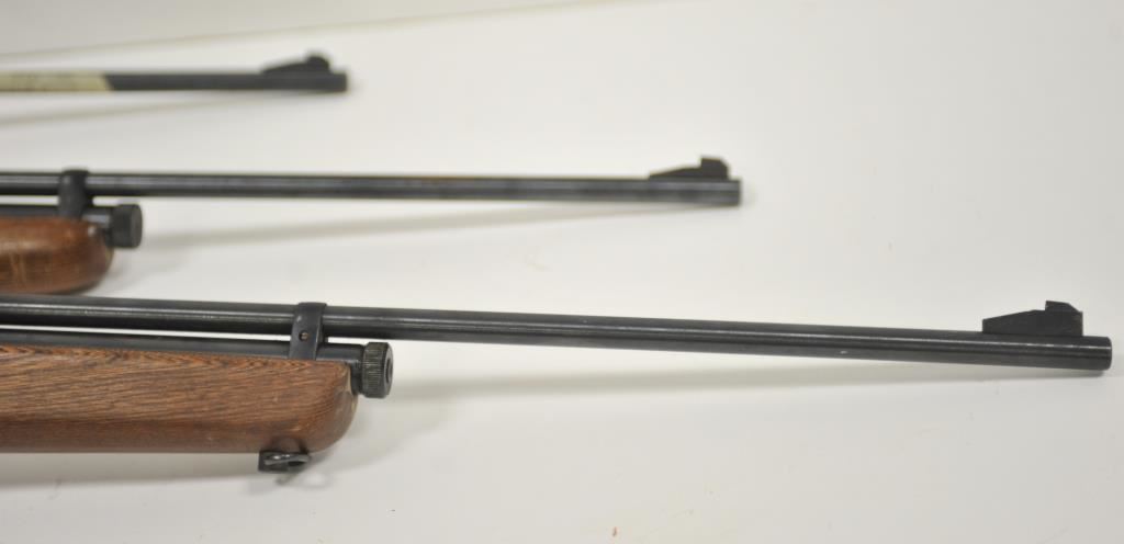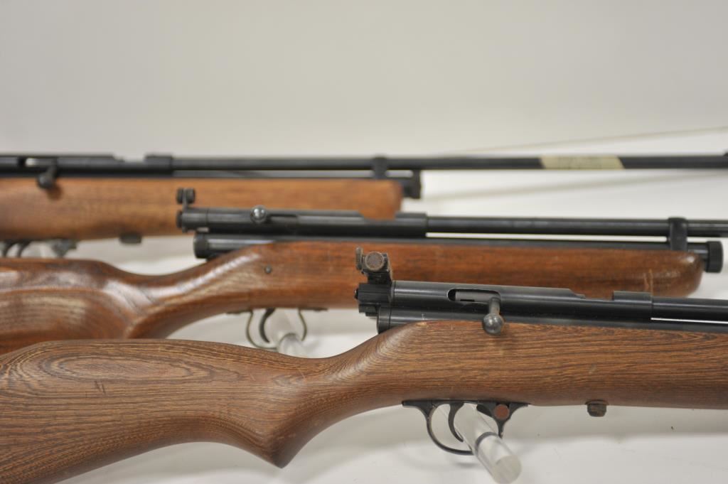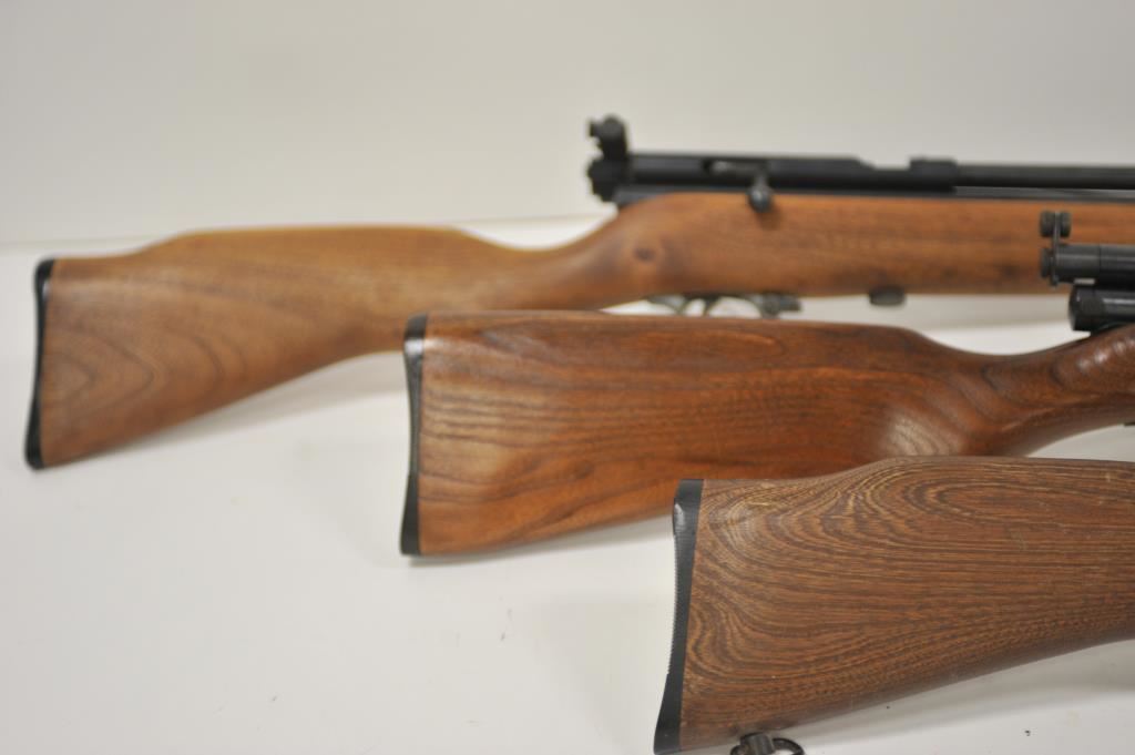 Lot of three Crosman Model 160 .22 caliber CO2 air rifles. The lot includes three rifles all with 21” barrels. All three retain the majority of their blue finish with light handling marks and surface erosion. The smooth wood stocks have mars, dents and scratches consistent with carry and use. Two rifles feature Crosman marked peep sights and the third a proprietary bolt mounted sight. Est.: $125-$250.