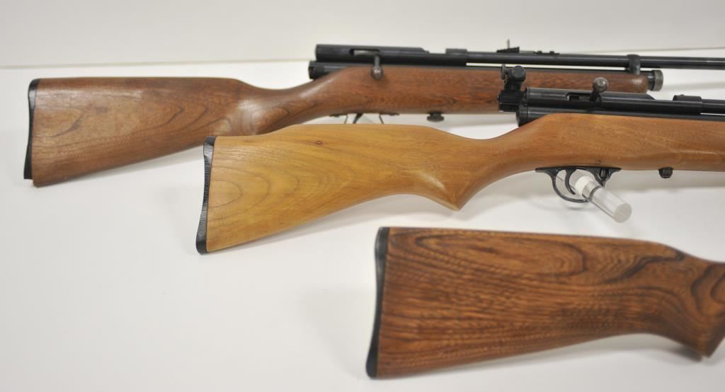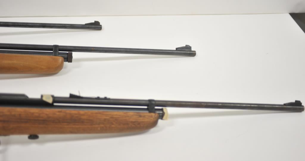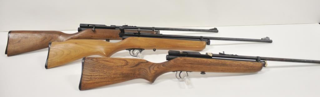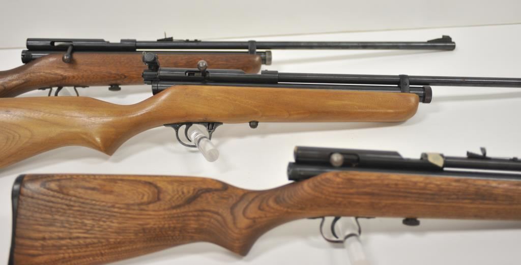 Lot of three Crosman Model 160 .22 caliber CO2 air rifles. All three are in very good overall condition with light surface rust on the barrels. One has a Crosman Model S331 peep sight added at the tang. All three rifles have wood stocks in good condition showing light to moderate wear with small mars and compressions from carry and use. Est.: $125-$250.