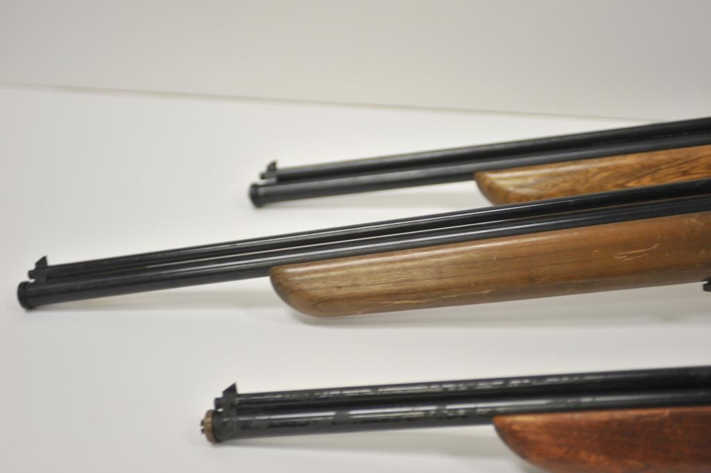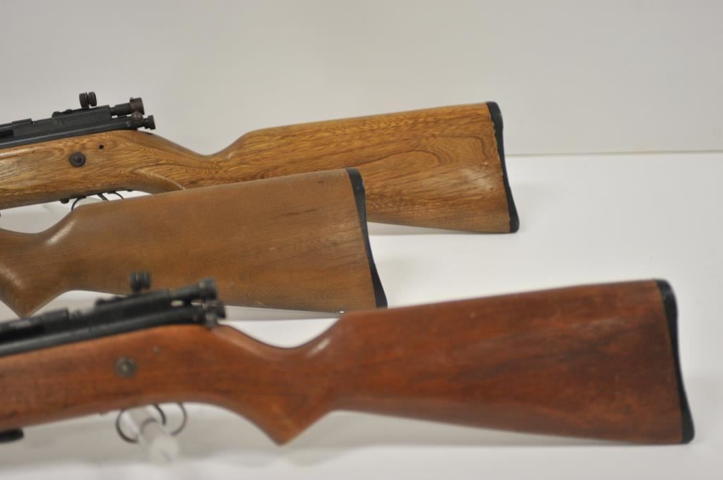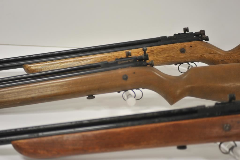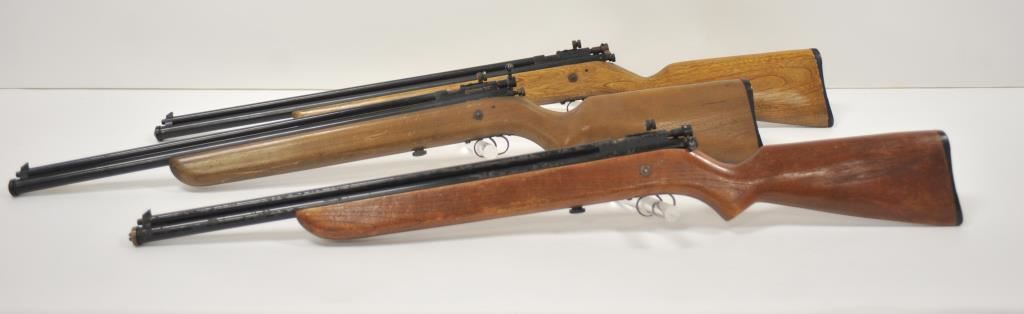 Lot of three Crosman Model 114 .22 caliber CO2 air rifles. All three rifles are in good overall condition with light surface rust to the metal surfaces. All three rifles are equipped with Crosman peep sights at the tang. The smooth wood stocks are in good condition with small mars and compressions from carry and use. Est.: $100-$200.