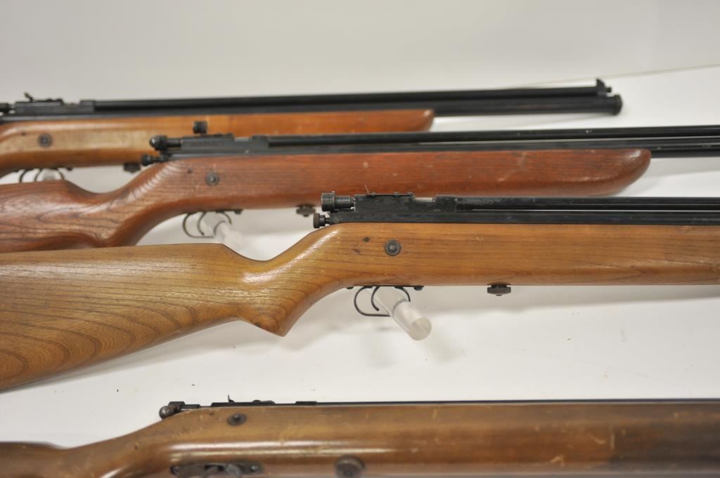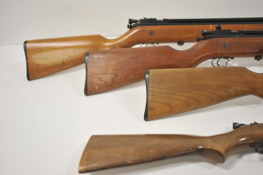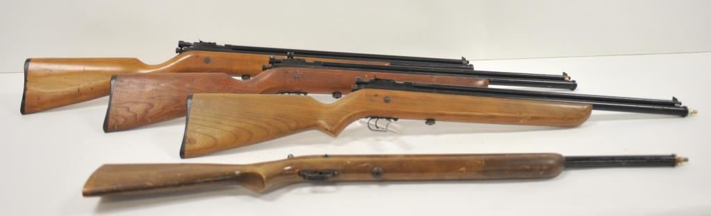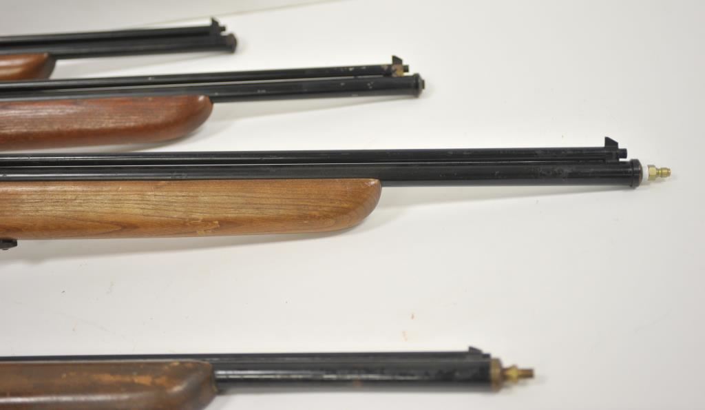 Lot of four Crosman Model 114 .22 caliber CO2 air rifles. All four are in fair to good condition with light surface rust to the metal surfaces. The smooth wood stocks show significant wear and use with scratches, dents and compressions. Est.: $100-$200.