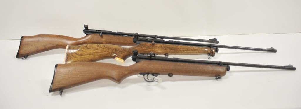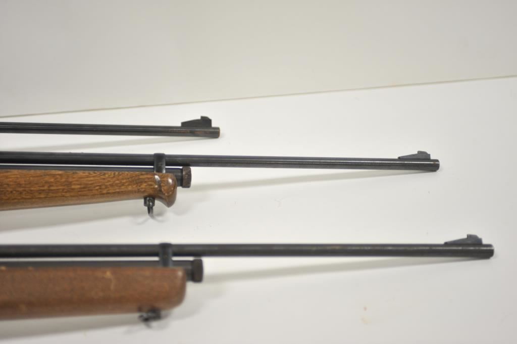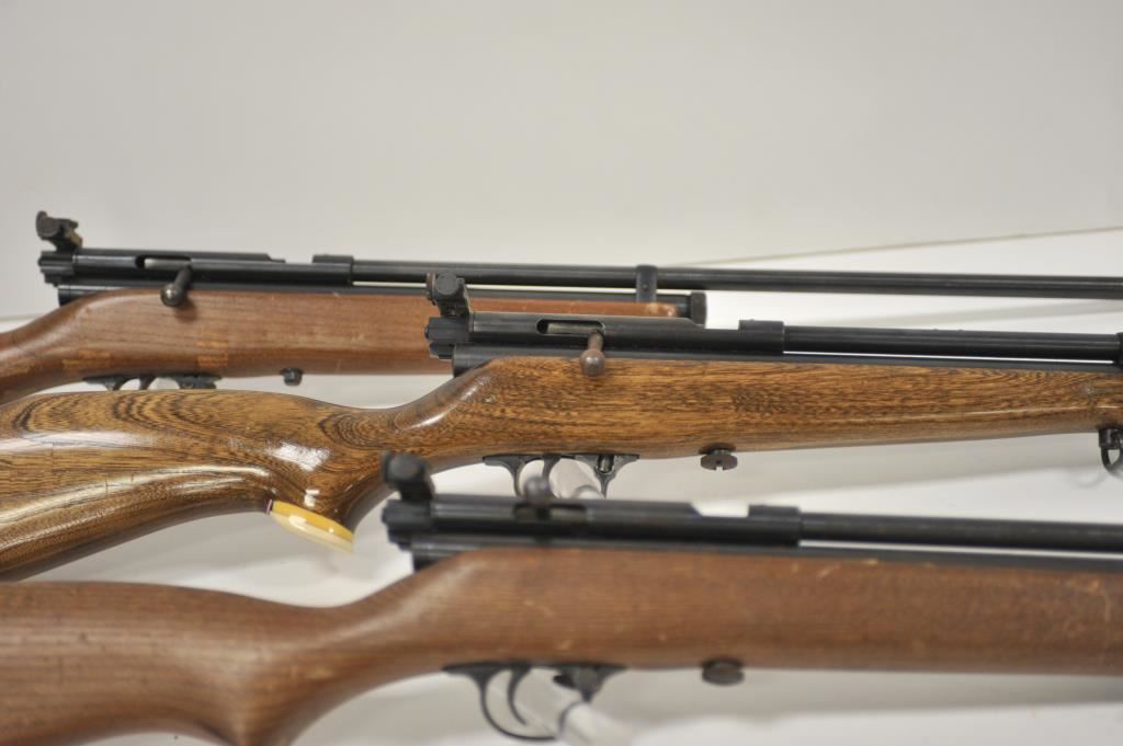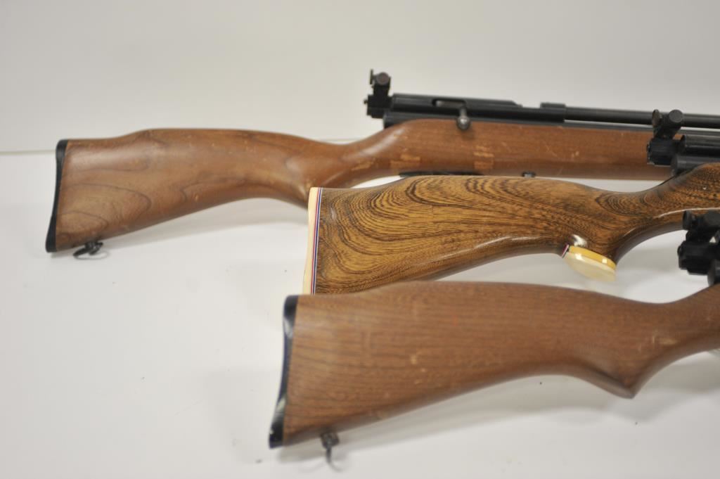 Lot of three Crosman Model 160 .22 caliber CO2 air rifles. All three are in good overall condition with light to moderate surface rust on the metal parts due to poor storage. All three rifles have Crosman brand peep sights added at the tang. All three rifles have wood stocks showing significant wear with dents, scratches and compressions. One of the rifles has been re-stocked with a custom wood stock with a Schnabel fore end. Est.: $75-$150.