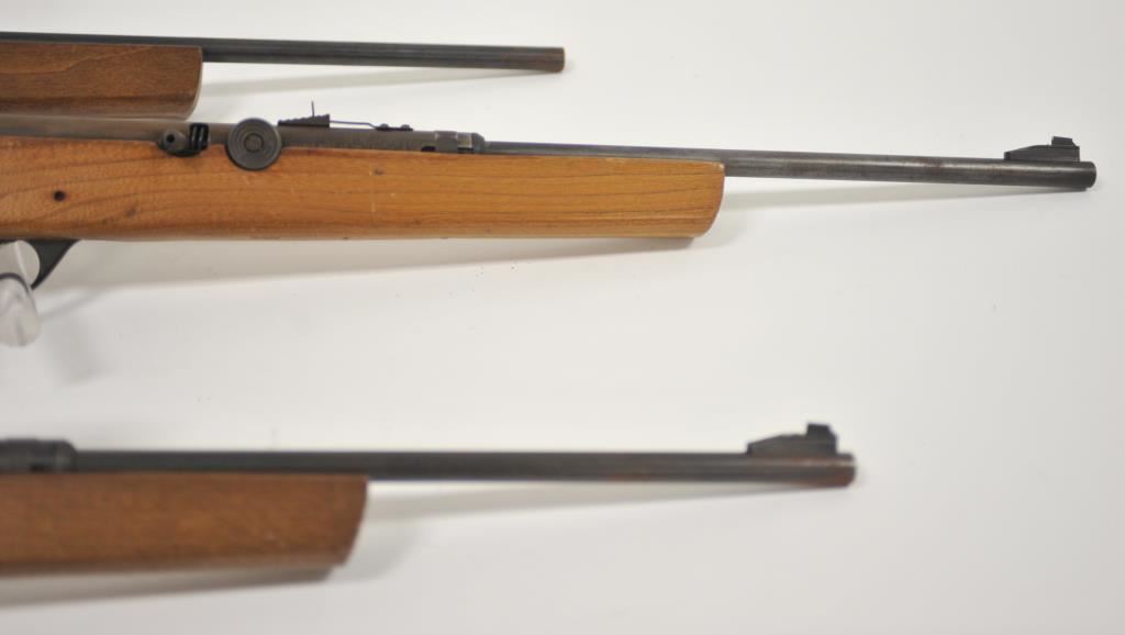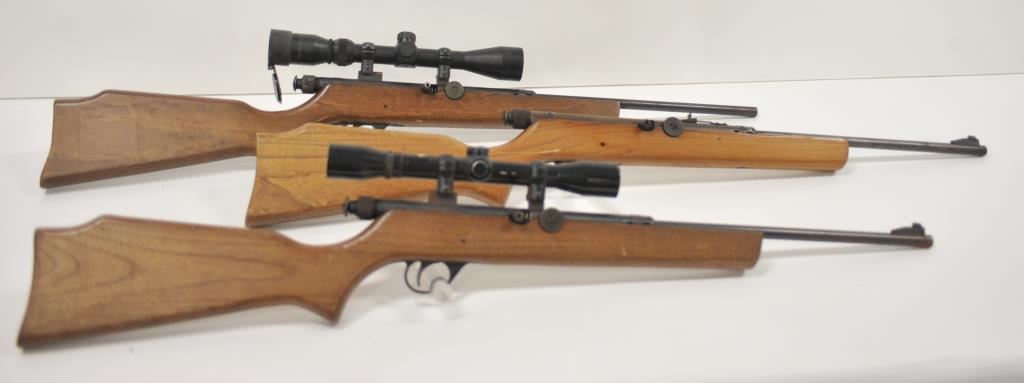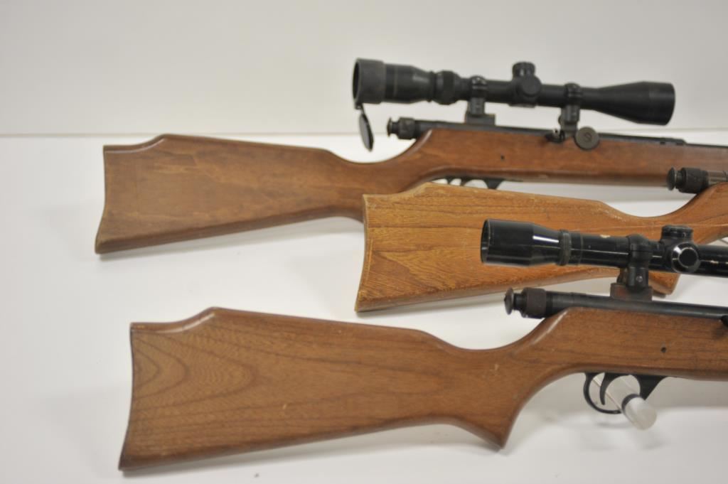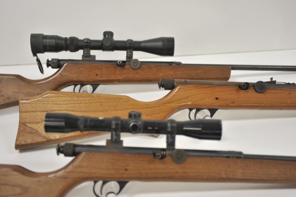 Lot of three Crosman Pell Master 700 single shot .22 caliber CO2 air rifles. The three rifles are in fair overall condition. The metal surfaces retain a significant amount of their blue finish with light surface rust on the barrels. The smooth wood stocks are in good condition with mars and compressions. One of the stocks is split at the fore end. One of the rifles is scoped with a Barska 3 x 9 x 40 variable power rifle scope while another has a fixed 4x Foremost rifle scope. Est.: $100-$200.