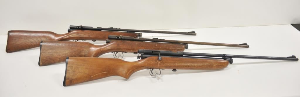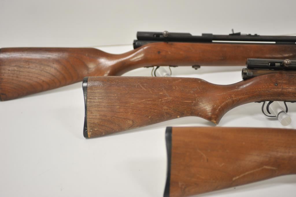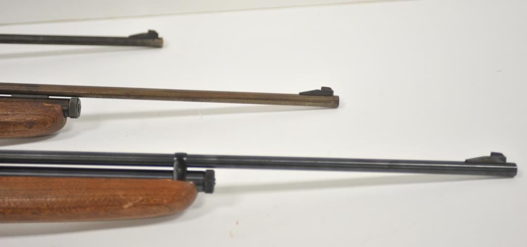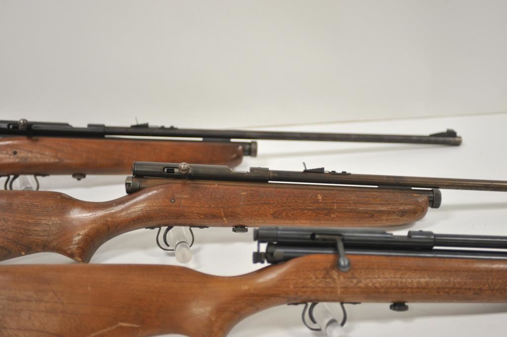 Lot of three Crosman Model 160 .22 caliber CO2 air rifles. All three are in good overall condition with light to moderate surface rust on the metal parts due to poor storage. All three rifles have wood stocks showing significant wear with dents, scratches and compressions from carry and use. Est.: $75-$150.