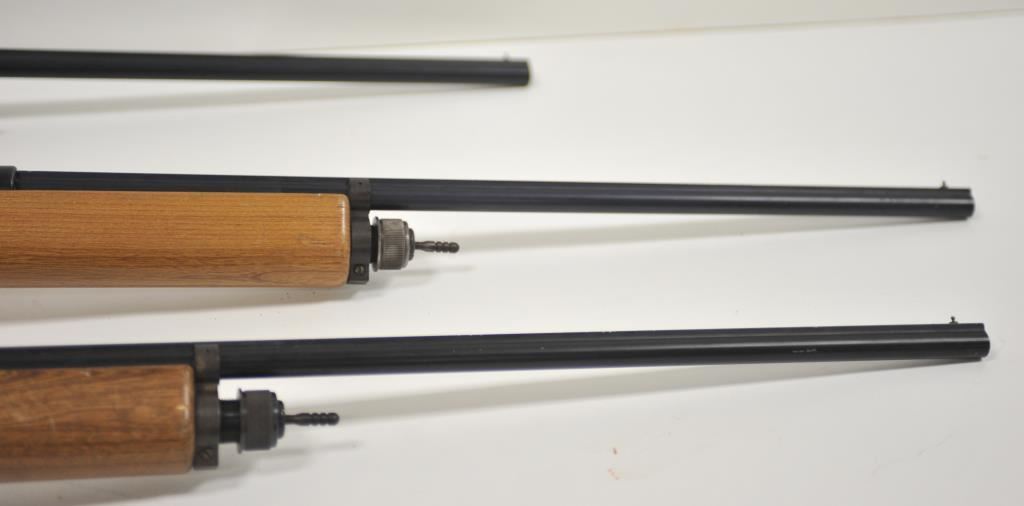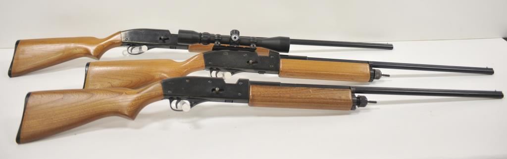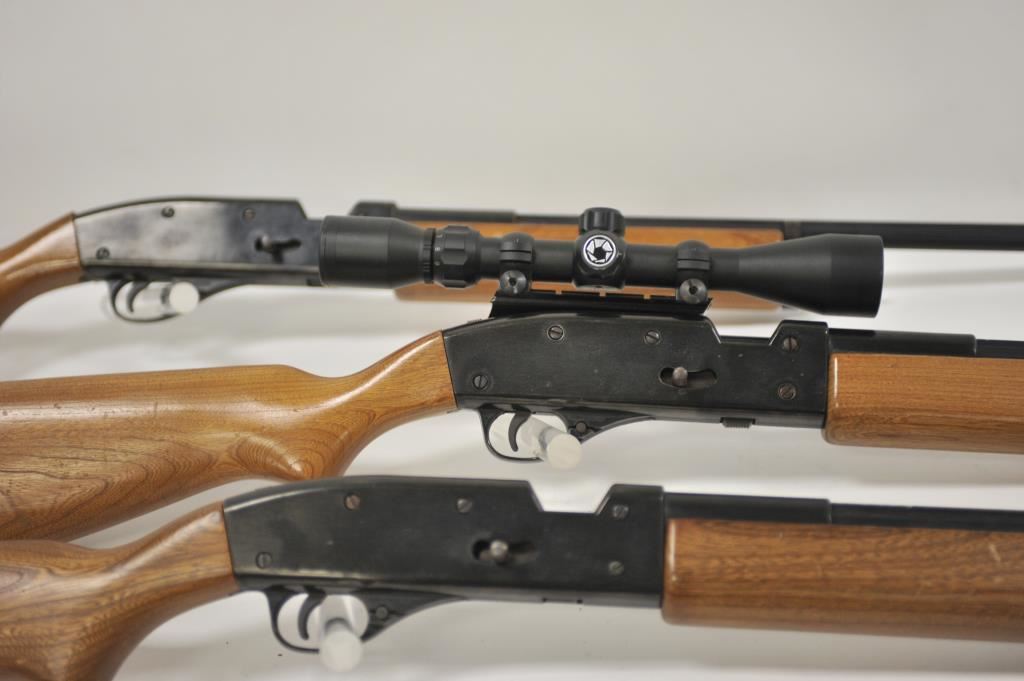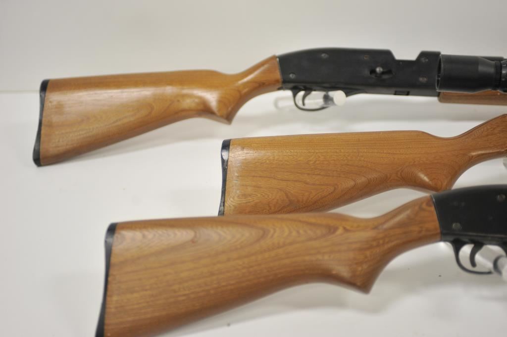 Lot of three Trap Master 100 CO2 powered shotguns. All three shotguns are in good overall condition with 26” barrels with a full-length rib. The shotguns have smooth wood stocks which are in good condition with plastic butt plates. One of the shotguns is topped with a Barska 3 x 9 variable power scope. Est.: $100-$200.