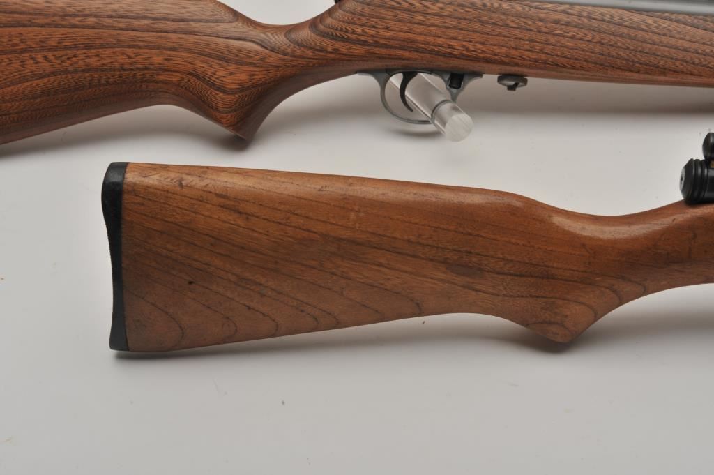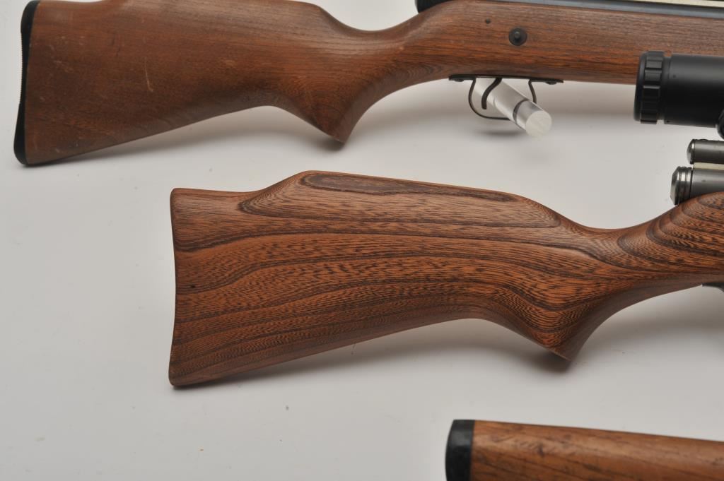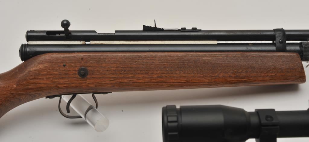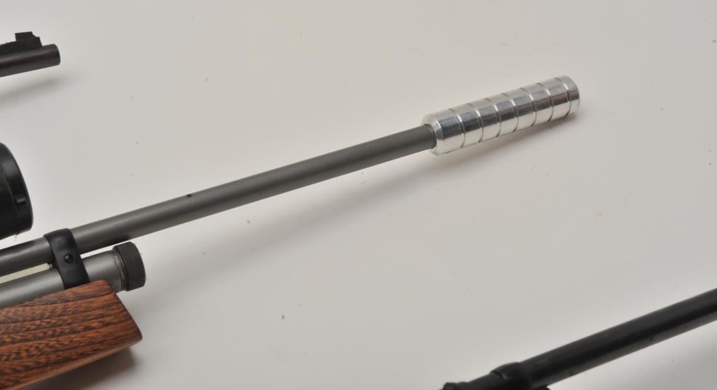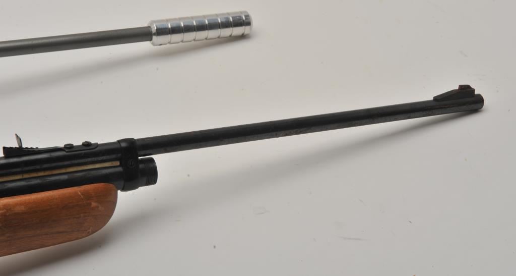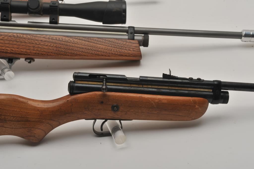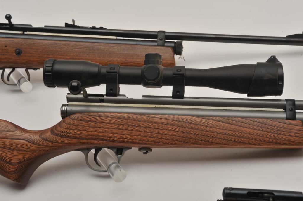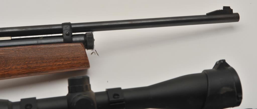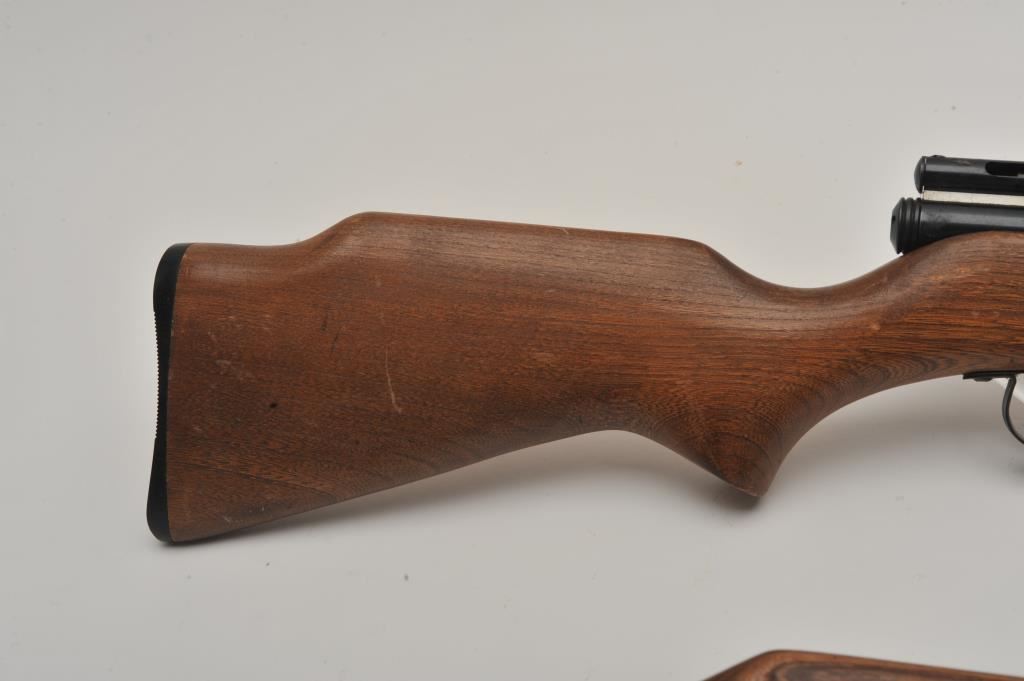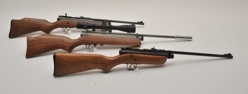 Lot of three J.C. Higgins Model 22 .22 caliber CO2 air rifles. All three rifles are in good overall condition with 18” barrels. Two are finished in blue, while the third is matte stainless with a 2” muzzle break added. All three have smooth wood stocks with numerous dents, scratches and compressions. One rifle is topped with a UTG fixed power scope. Est.: $75-$150.
