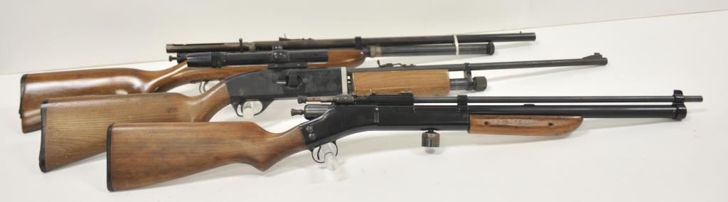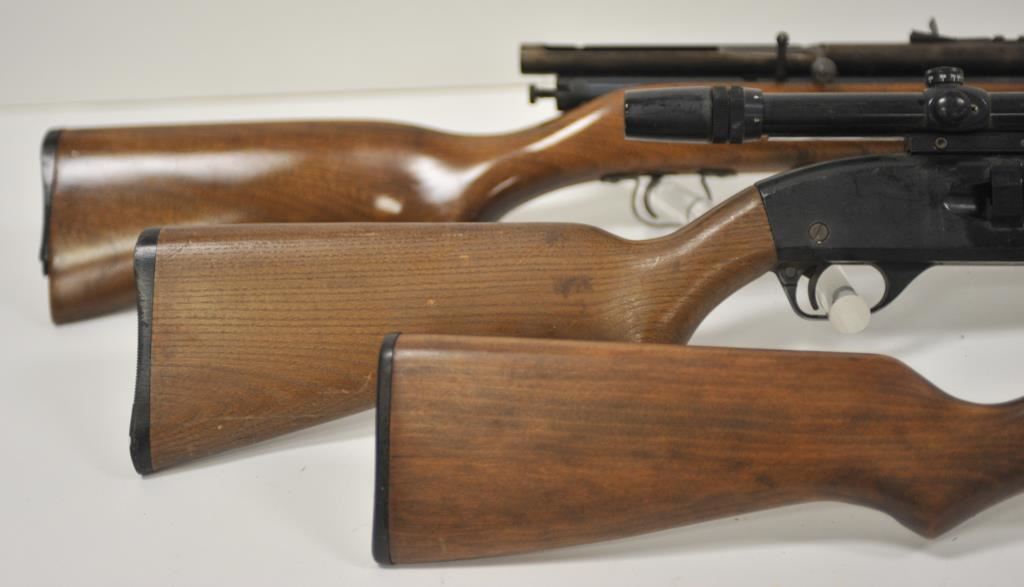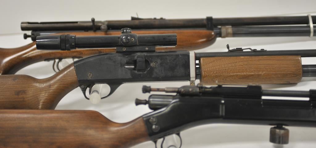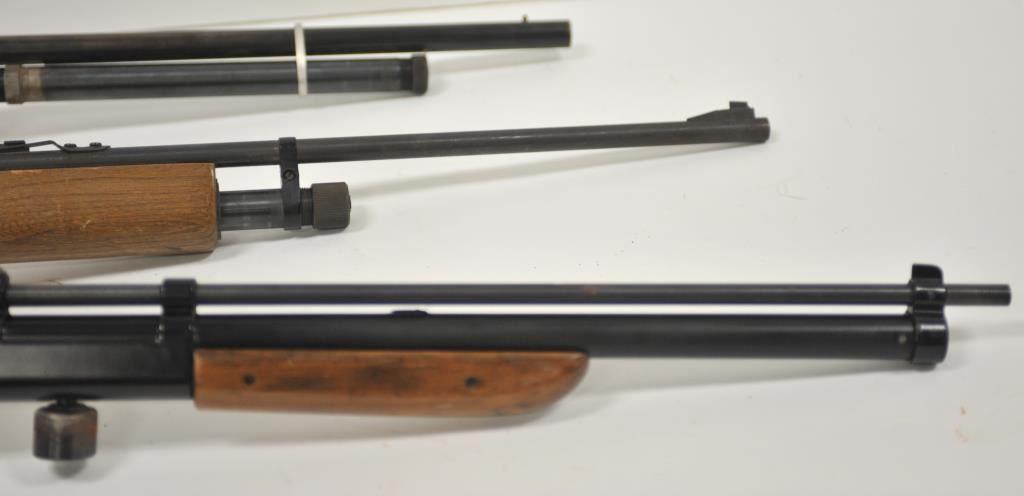 Lot of two CO2 air rifles and a tranquilizer dart rifle. The lot includes a Crosman Model 622 .22 caliber air rifle with a 23” barrel. The metal surfaces retain the majority of their blue finish with light surface rust. The smooth wood stocks are in good condition and rifle is topped with a Bushnell 3 x 7 Custom .22 scope. The second air rifle is unmarked, with a 21” barrel with light to moderate surface rust and a smooth wood stock. The lot also includes a “CAP-CHUR PROJECTOR” tranquilizer dart rifle by Palmer Chem. & Equip. Co. The rifle shows light to moderate surface rust on the metal surfaces due to poor storage. The smooth wood stock is in good condition. Est.: $100-$200.