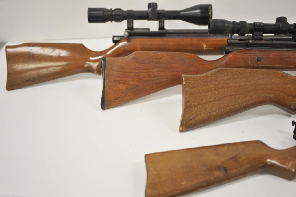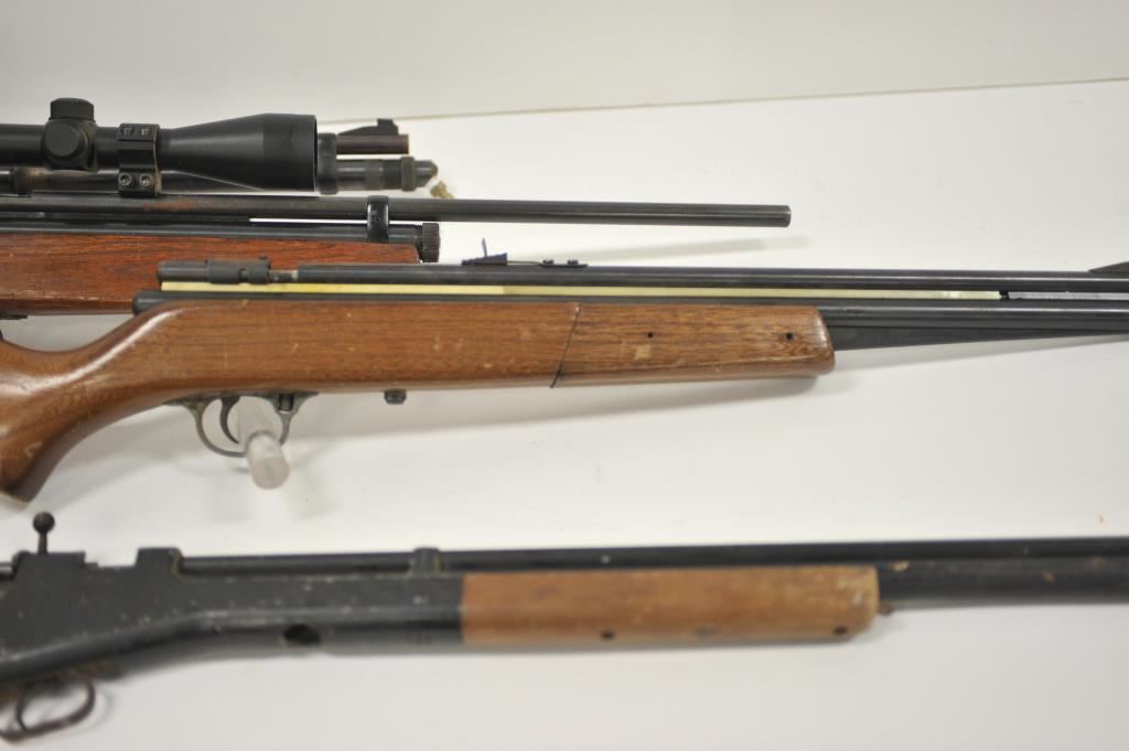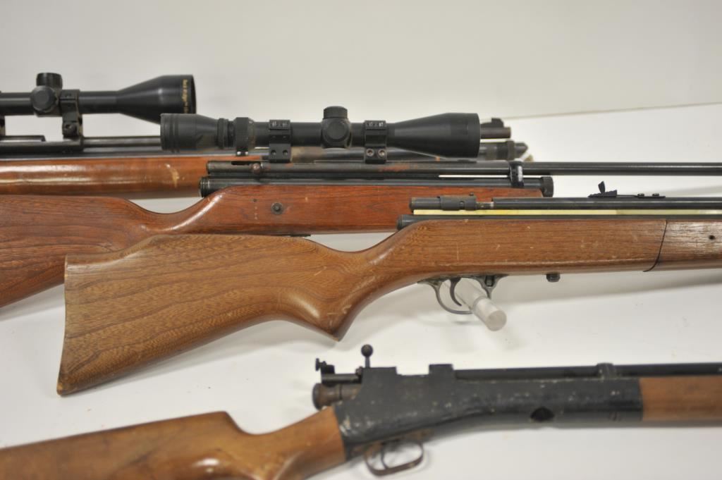 Lot of four assorted air rifles. The lot includes a Sears pump model missing the bolt, a JC Higgins .22 caliber CO2 rifle, vintage Crosman Arms and Taiyo Juki “BOBCAT” air rifle with steel CO2 canister and topped with a Buck Ridge 3 x 9 x 50 variable power scope. All rifles are in fair condition with surface rust on the metal parts and wood stocks showing heavy wear. Est.: $50-$100.