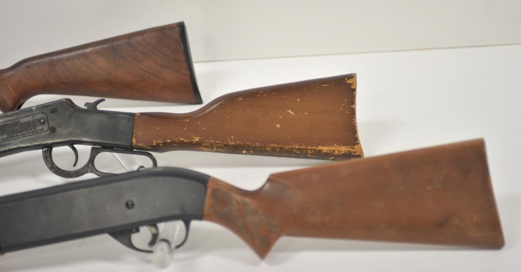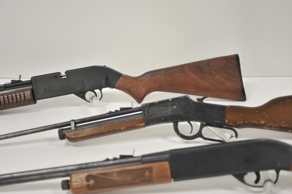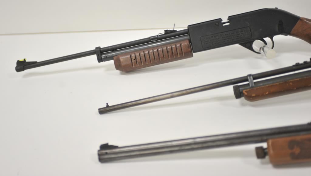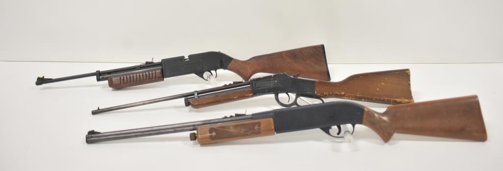 ): Lot of three assorted air rifles. The lot includes a Hanh Super BB repeater lever action BB rifle in good overall condition. A Crosman Model Powermatic 500 semi-automatic CO2 BB rifle in good overall condition and a 760 Pump master pump BB rifle in good condition as well. Est.: $50-$100.