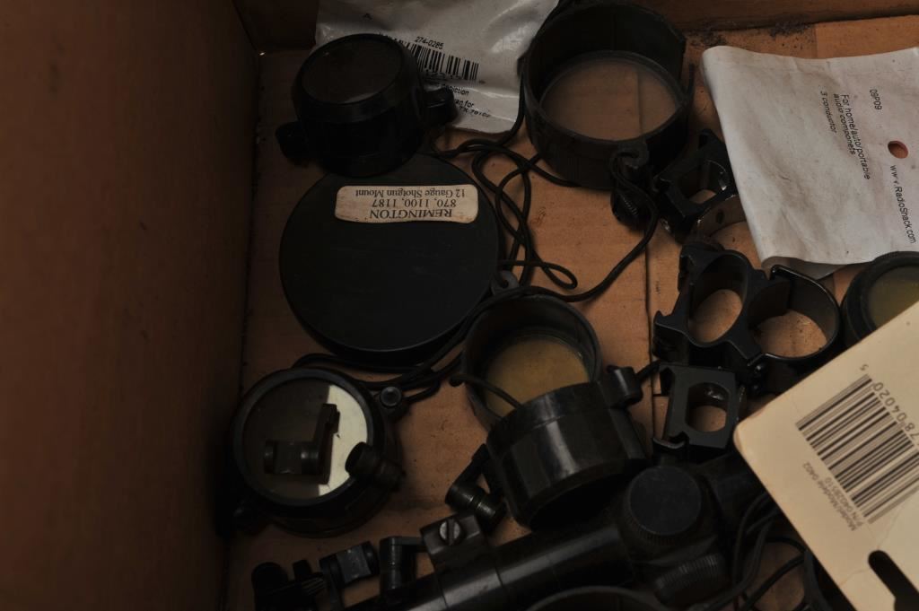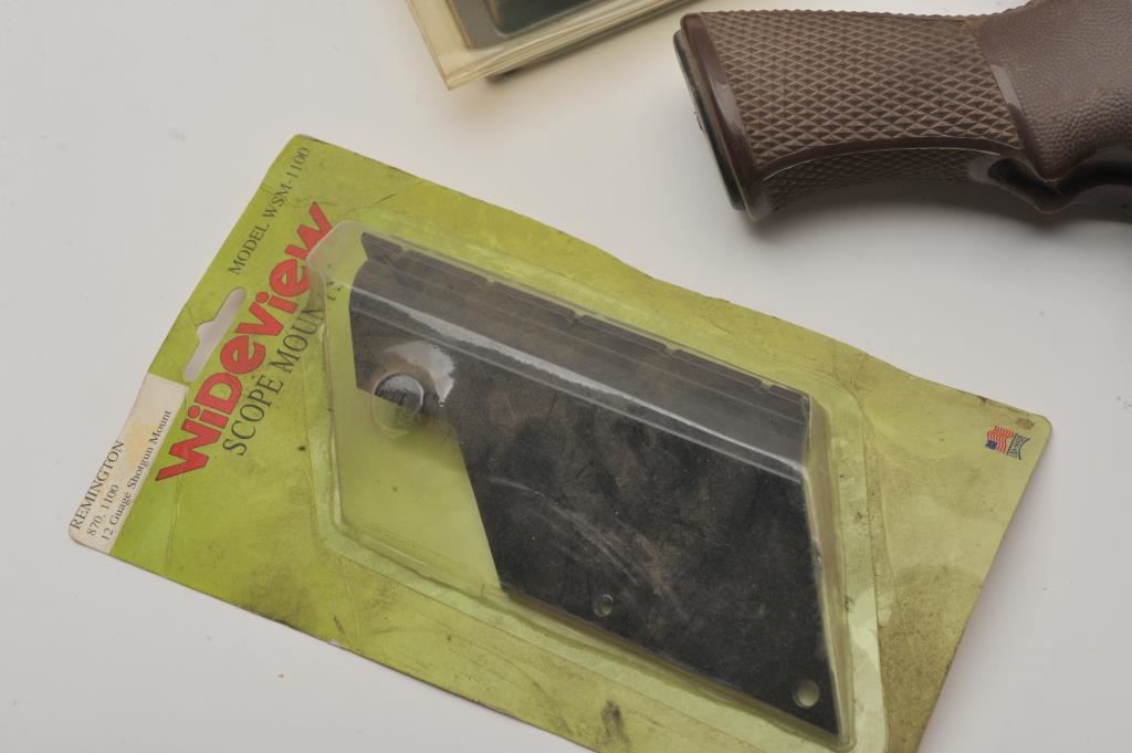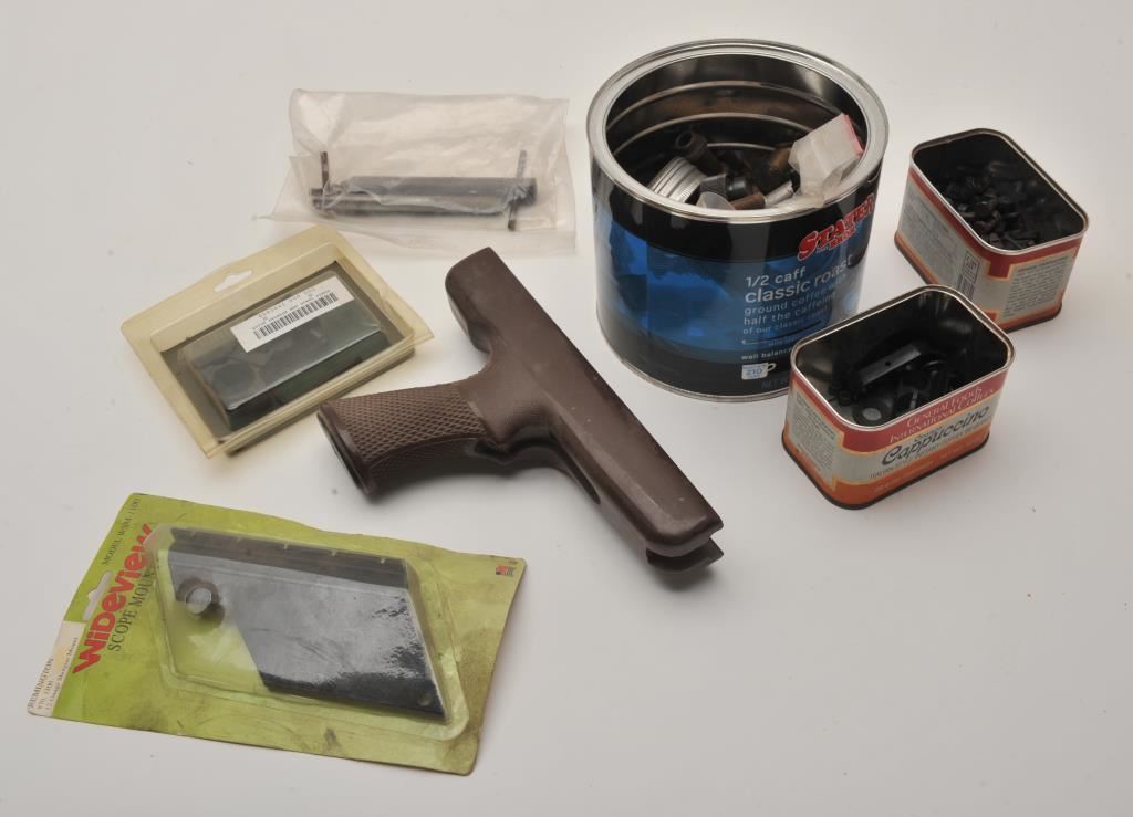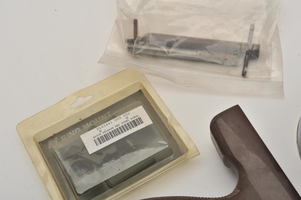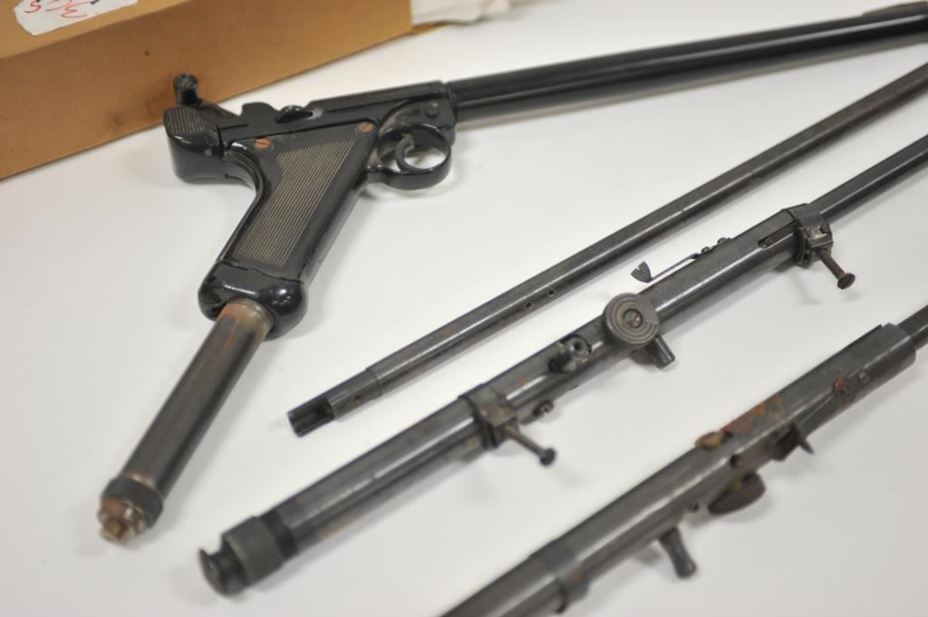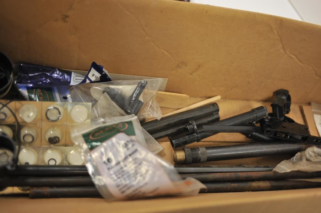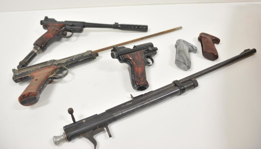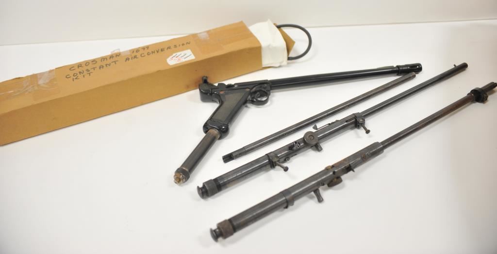 Bonanza lot of air rifle barreled actions, parts and accessories. The lot includes barreled actions, barrels, air pistol actions and scope covers. Additionally, the lot includes a Schimel Model P-22 air CO2 air pistol with a 16” barrel including the muzzle break. The lot further includes a Crosman 1077 constant air conversion kit still in the box. Est.: $100-$200.