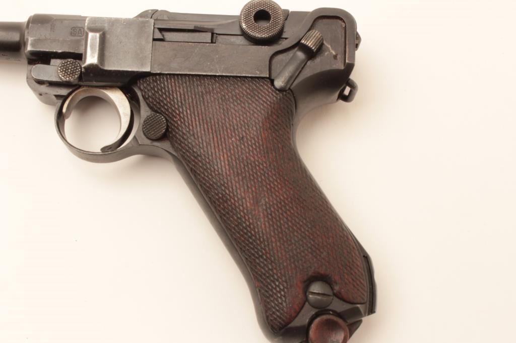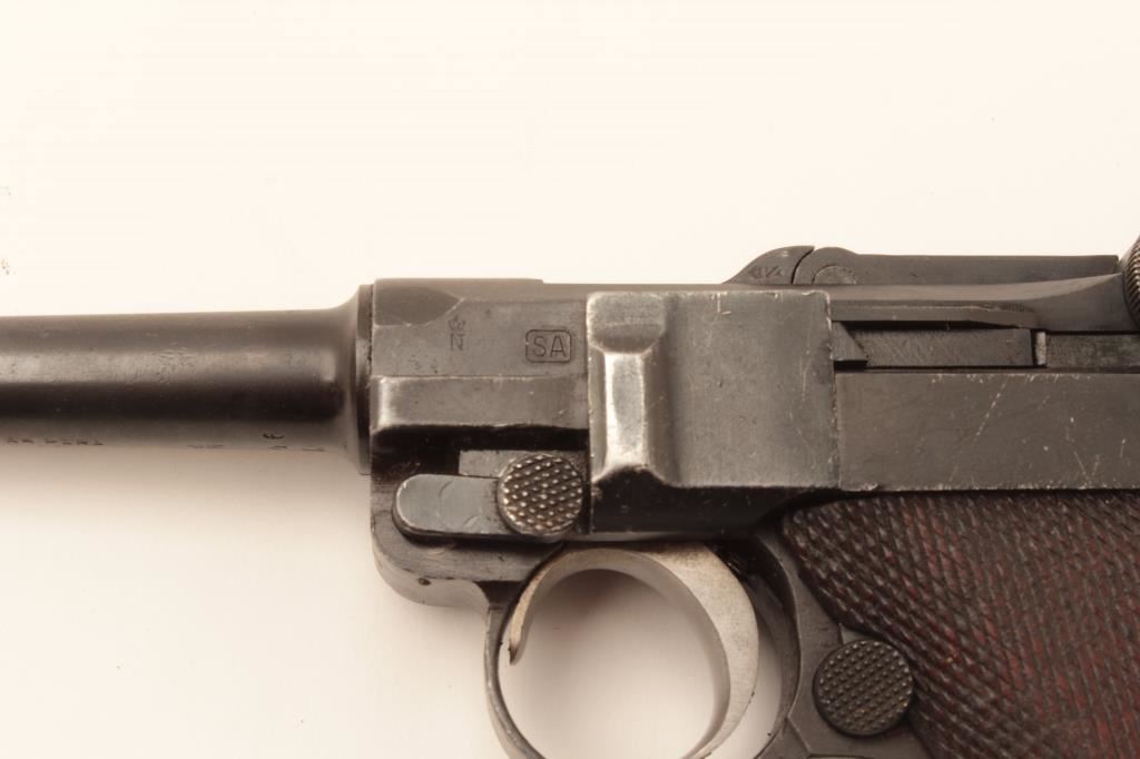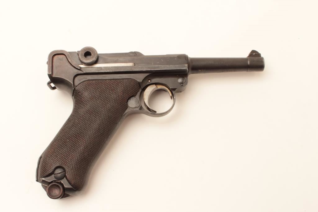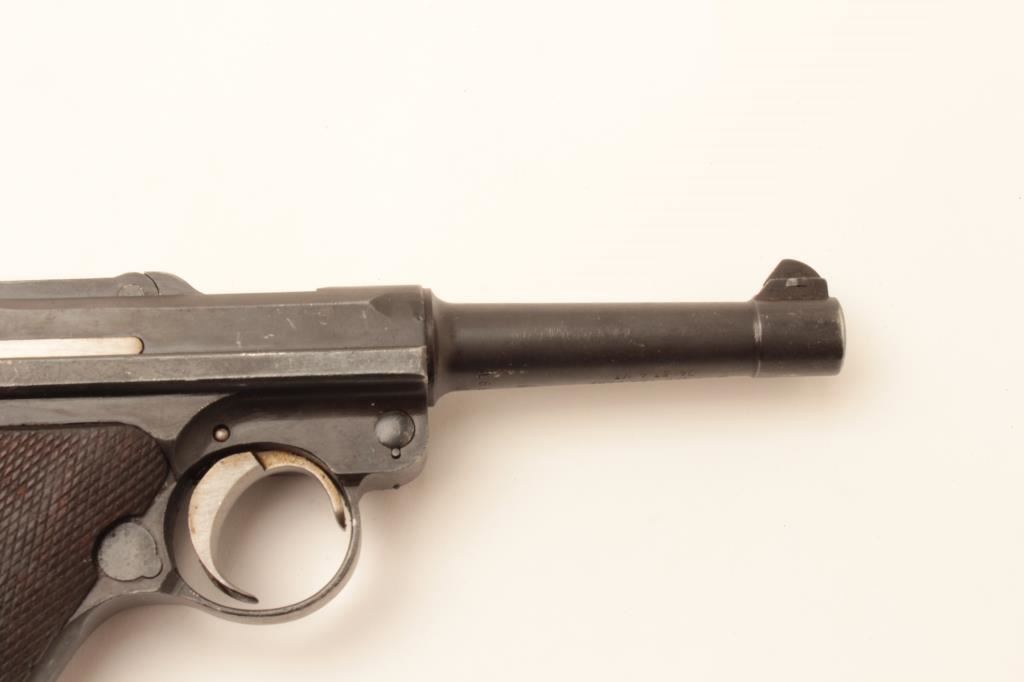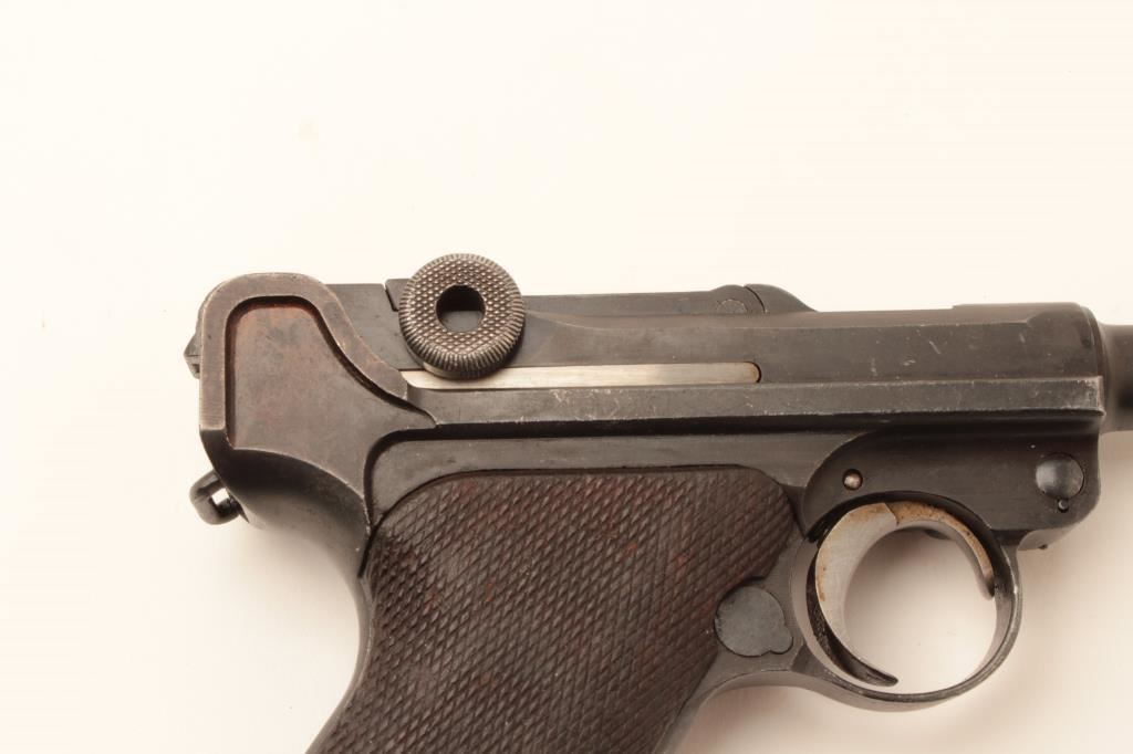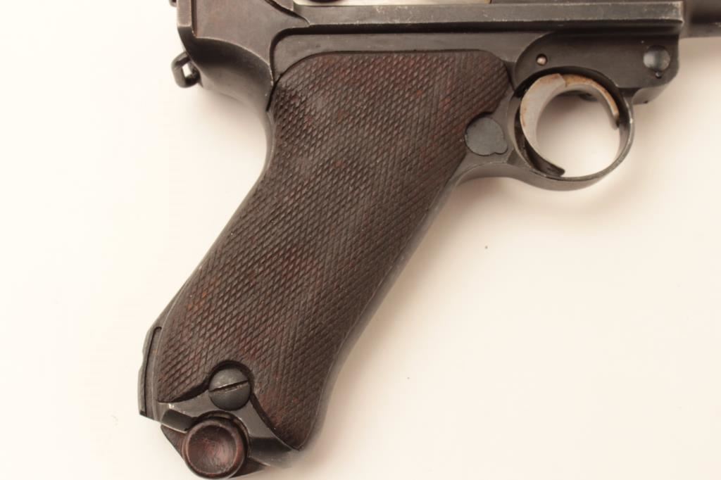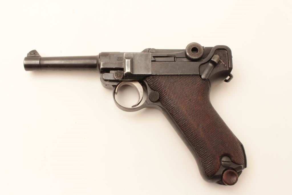 Rebuilt DWM Luger semi-automatic pistol, 7.65mm caliber, 3.75” barrel, blued finish, checkered wood grips, import-marked and SA-marked on left side of barrel assembly, S/N 1646, mis-matched small part numbers; overall fair to good condition with a good bore, good action, good grips. (C&R/PPT). Est.: $300-$600.