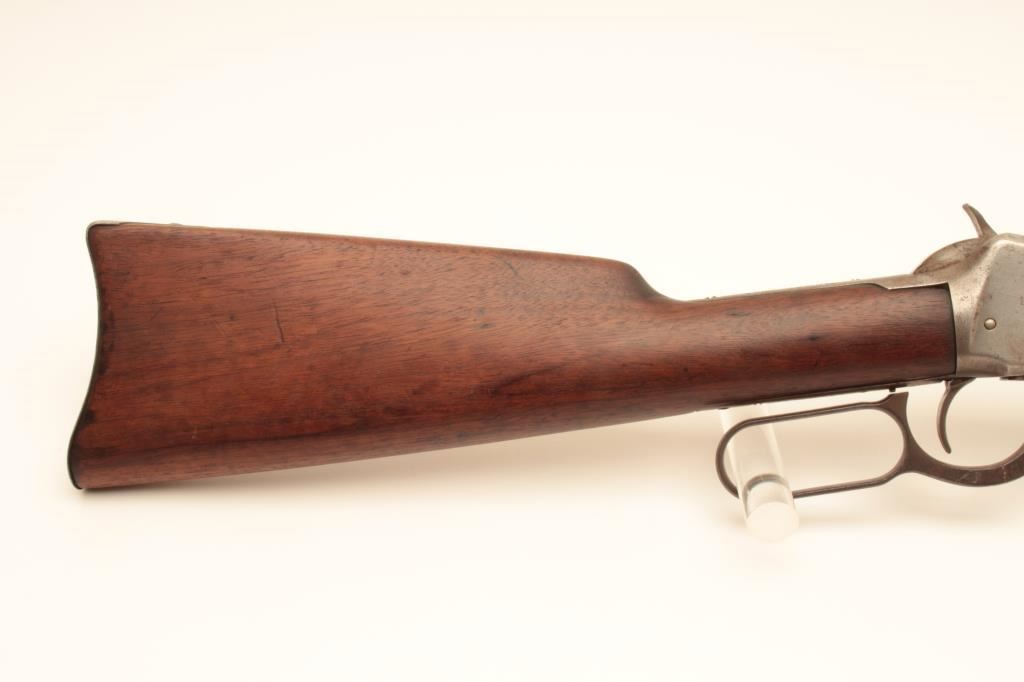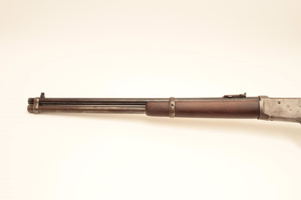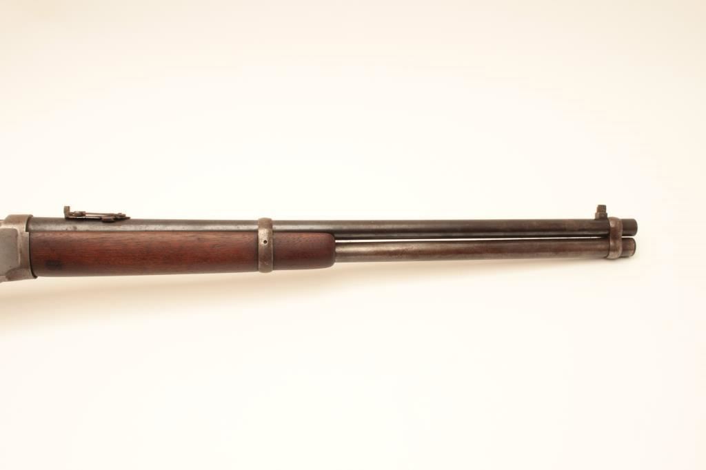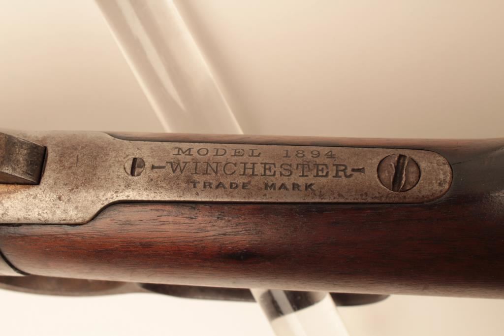 Winchester Model 1894 lever action carbine, .30 W.C.F. caliber, 20” barrel, blued finish, wood stocks, S/N 273977; considerable remaining blued finish on barrel with scattered surface spots of erosion, good bore, good action, good markings and overall good wood stocks. (C&R/PPT). Est.: $600-$1,200.