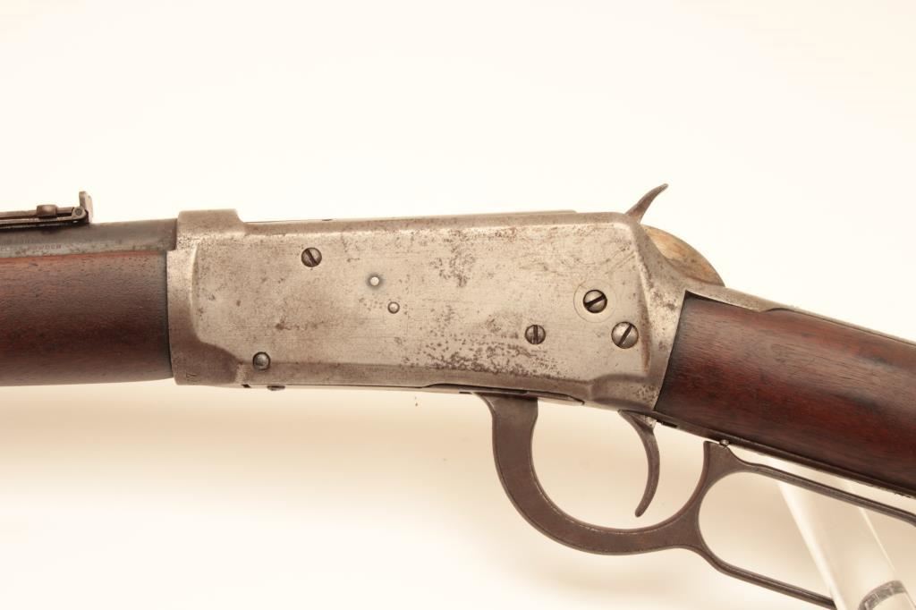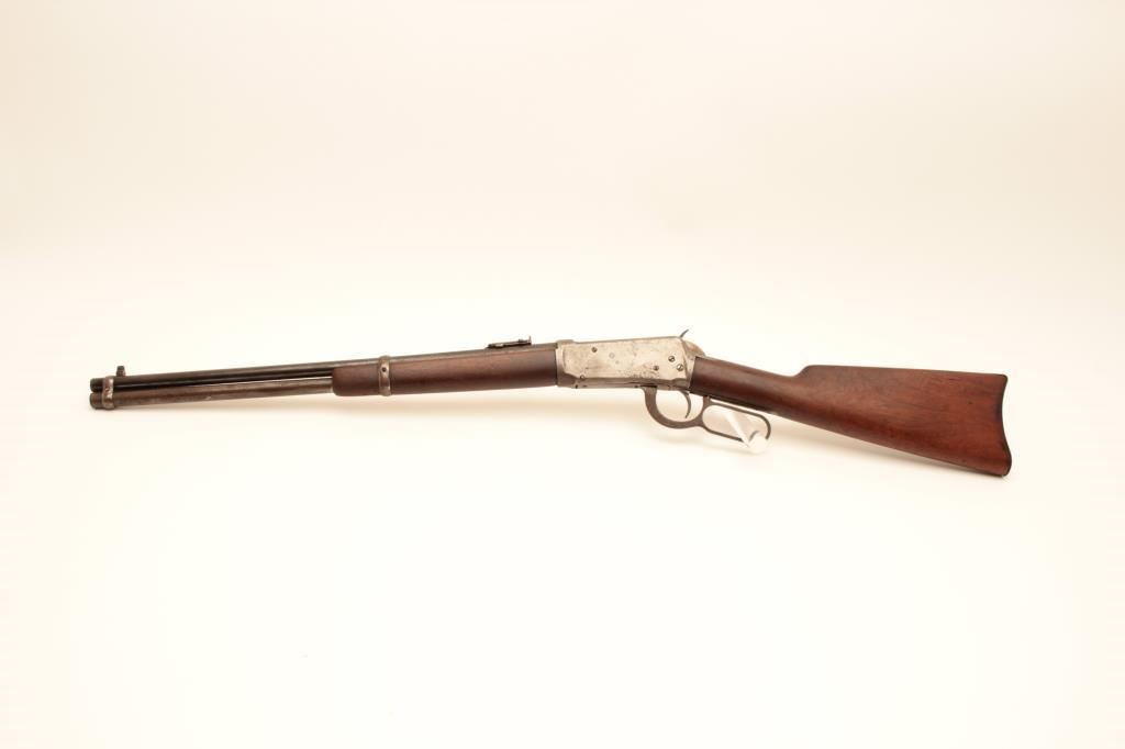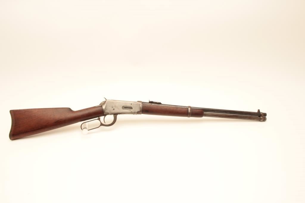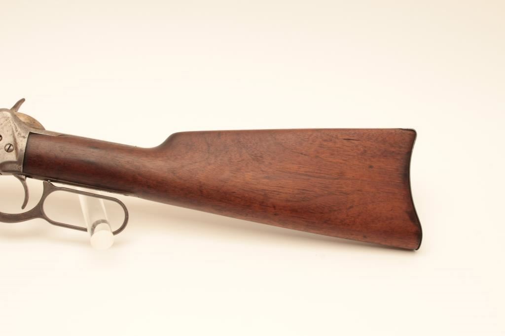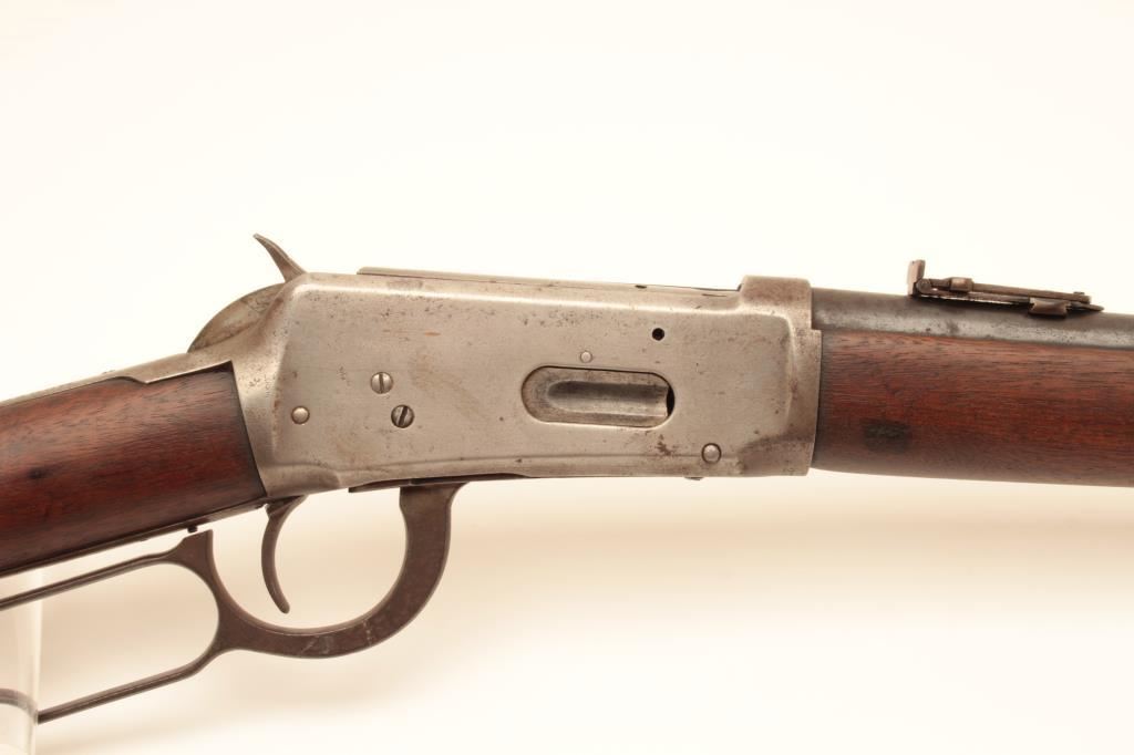 Winchester Model 1894 lever action carbine, .30 W.C.F. caliber, 20” barrel, blued finish, wood stocks, S/N 273977; considerable remaining blued finish on barrel with scattered surface spots of erosion, good bore, good action, good markings and overall good wood stocks. (C&R/PPT). Est.: $600-$1,200.