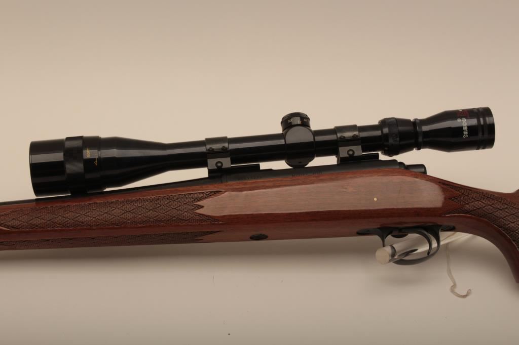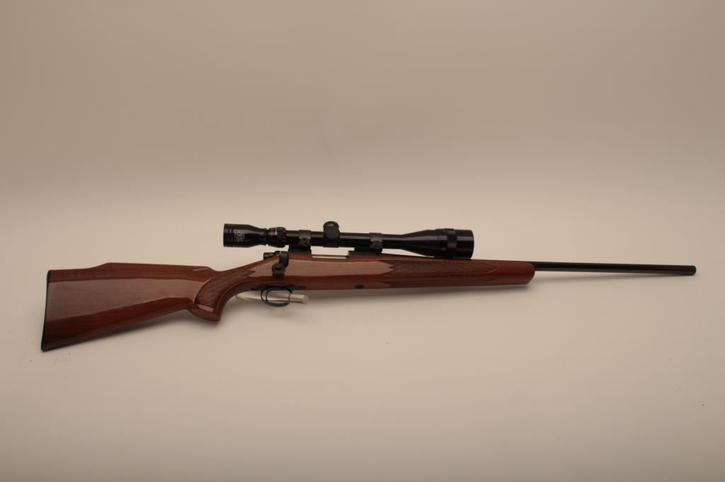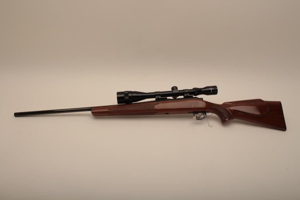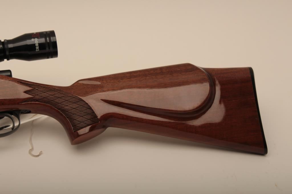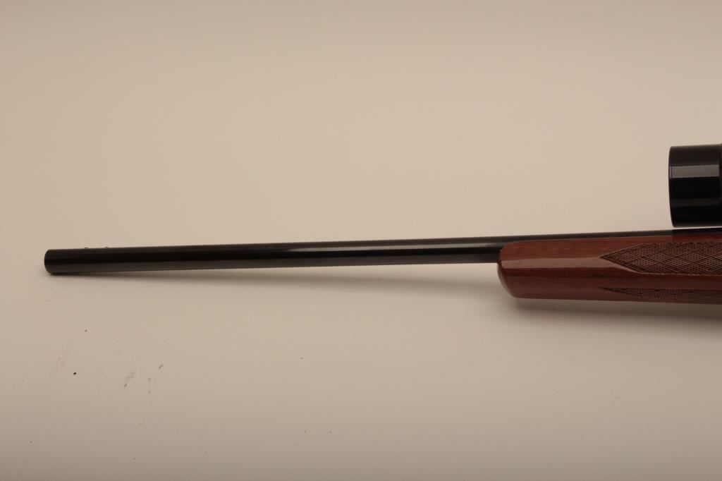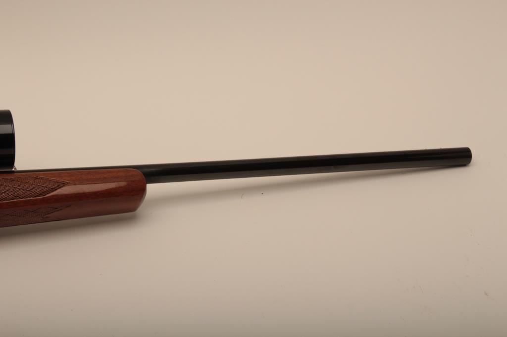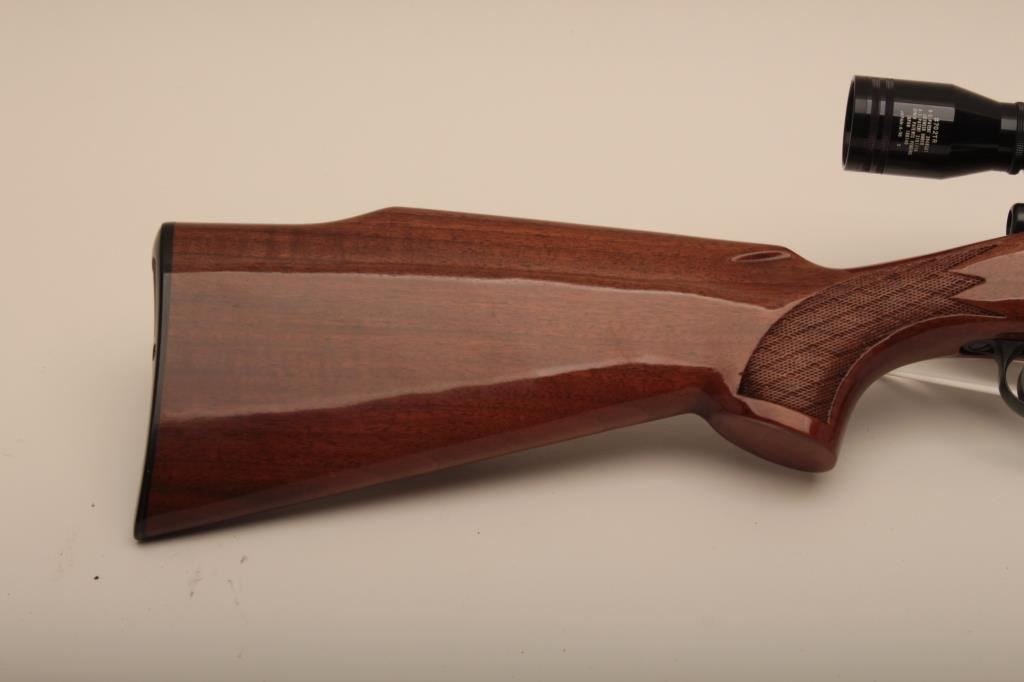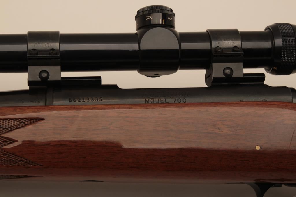 Remington 700, #B6213335, .22-250, 24" barrel, jeweled bolt, blued finish, walnut stock with plastic checkered butt plate. Rifle is in near fine condition overall, retaining 96-98% original finish, stock shows minor mars from storage and use. Bore is mirror bright, action is crisp. Mounted with an Tasco 6-18x40 scope. Original box included. (Modern) Est. $350-700