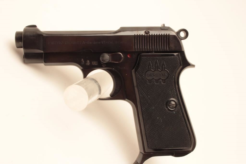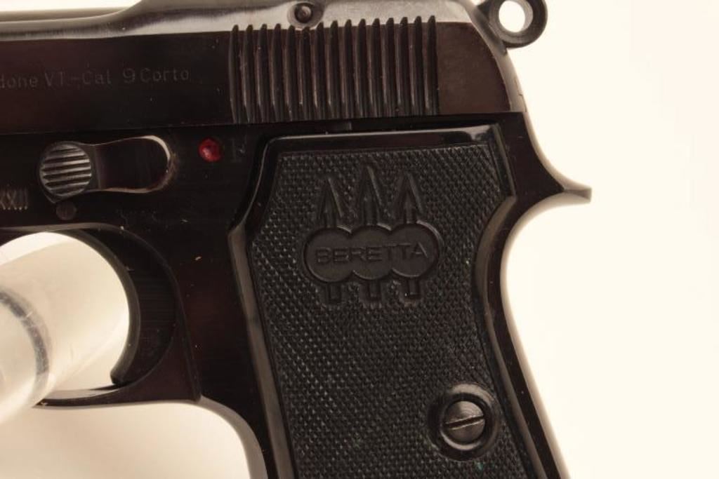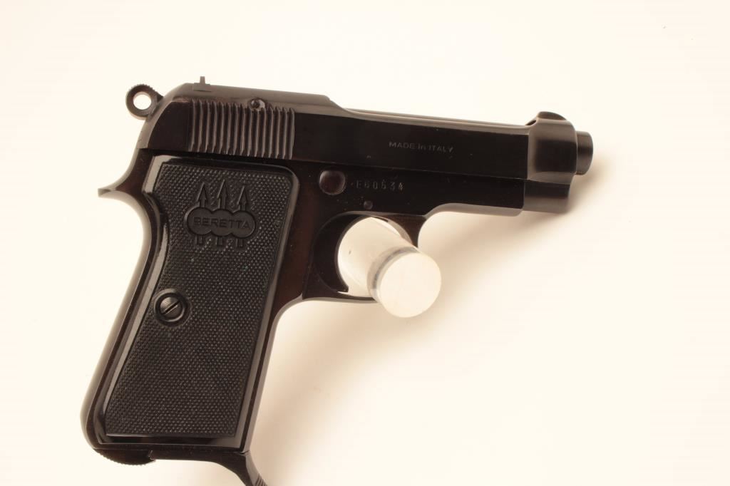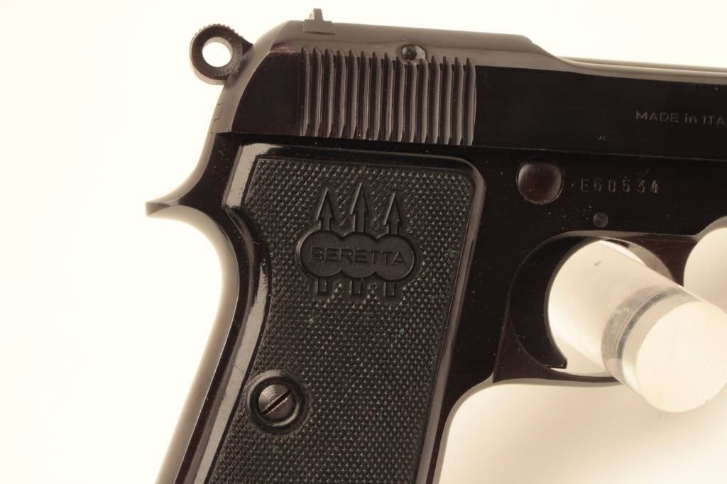 Beretta 1934, #E60534, .380 cal, 3 3/8" barrel, blued finish with fixed sights and checkered logo grips. Pistol is in fine condition overall, very good bore, tight action, retaining 95-97%+ original finish, grips are very good plus with no chips or cracks. Includes one correct magazine. (C&R / PPT) Est $350-700