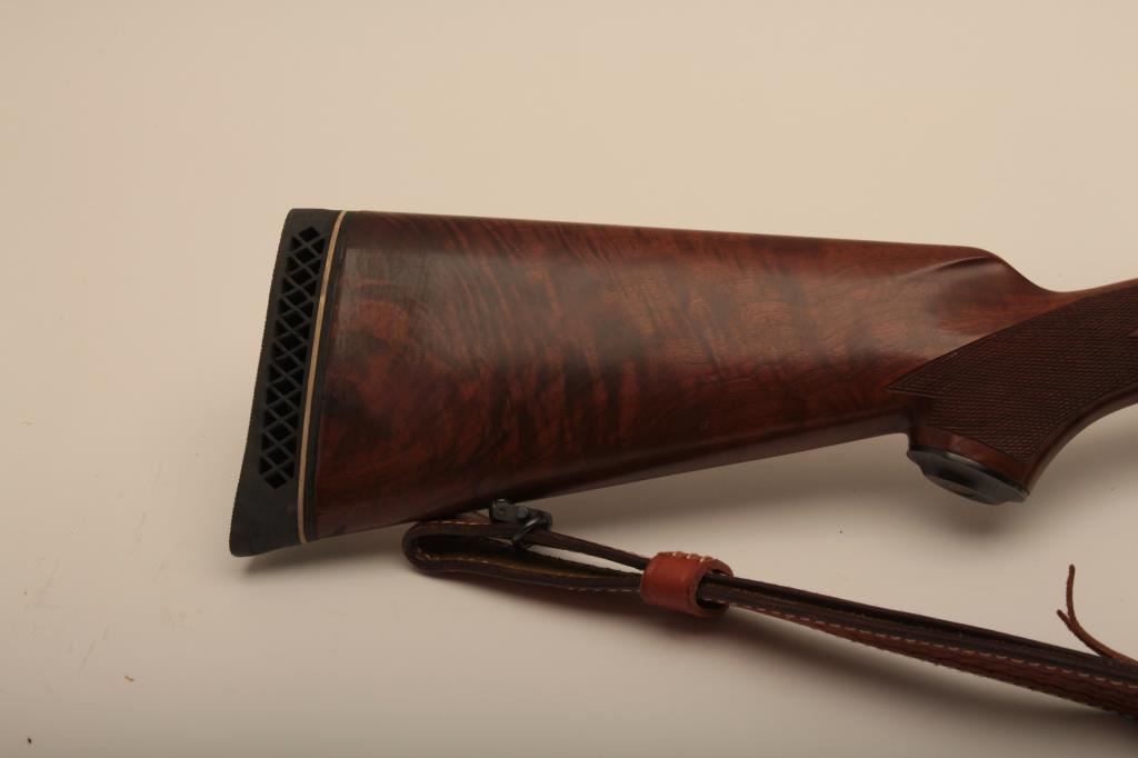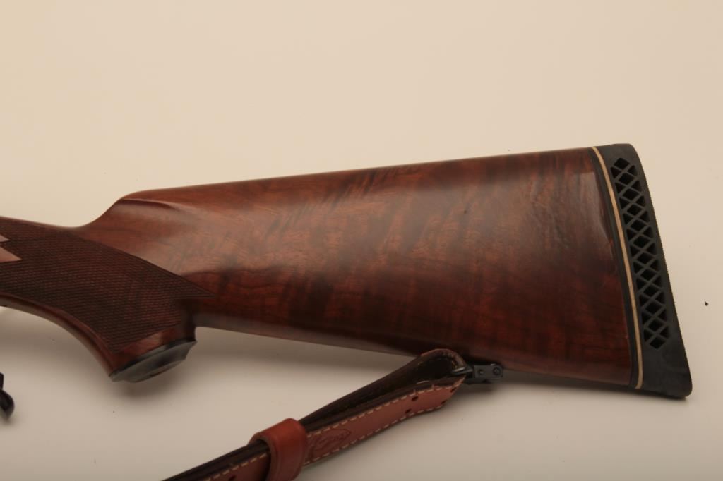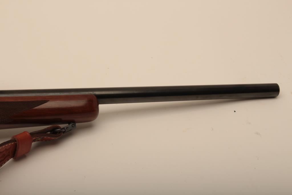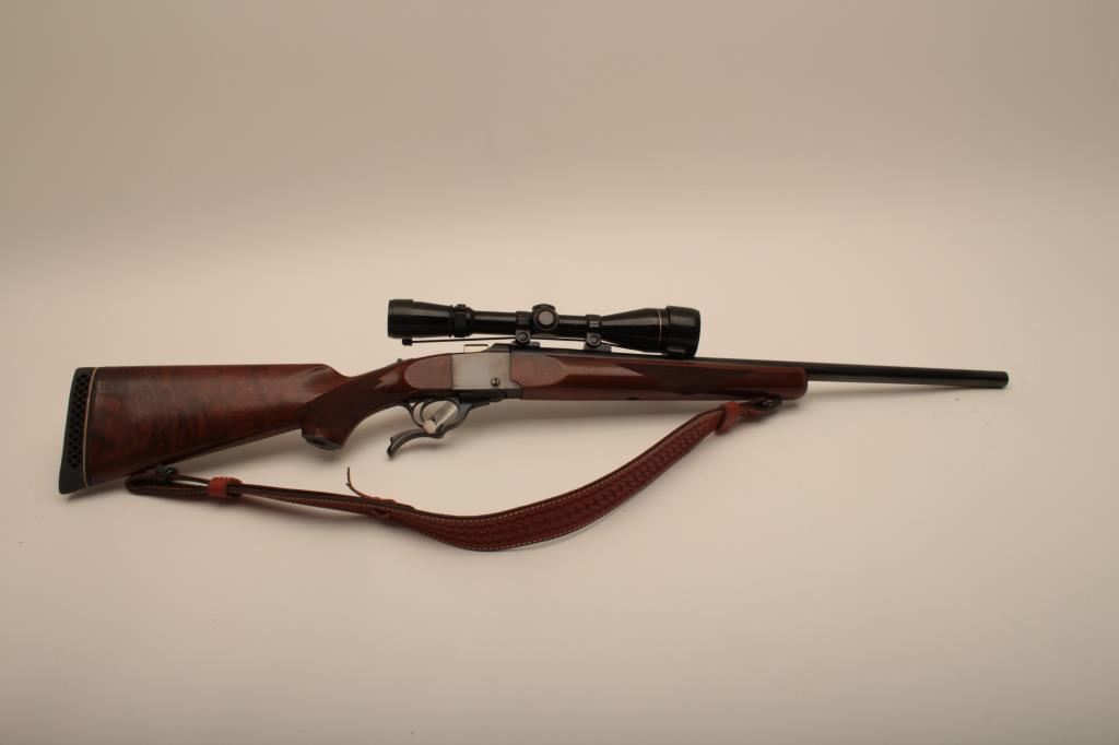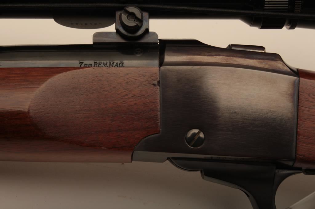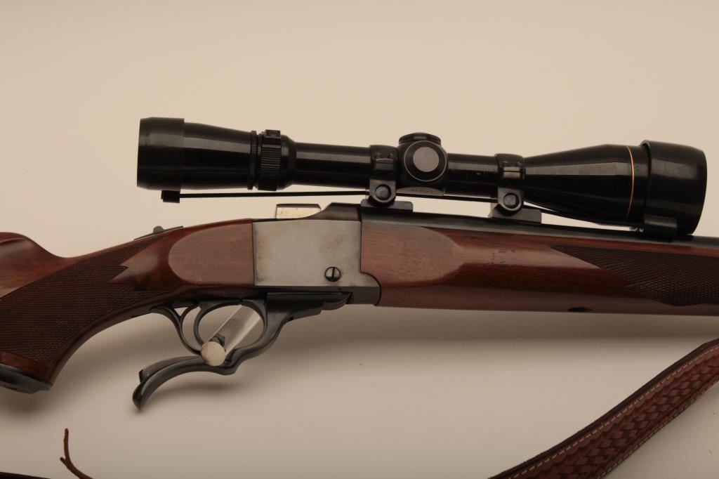 Ruger No 1 single shot rifle, #130-46622, 7mm Rem Mag. cal., 24" barrel, checkered walnut stock with White Line rubber recoil pad, quick detatchable sling swivels and a tooled leather sling. Rifle is in fine condition overall, the bore is mint, the action is very good, the stock is near fine, showing minimal handling marks. Mounted with a Leupold Vari-XIII 3.5-10 scope. (Modern / PPT) Est, $600-1200