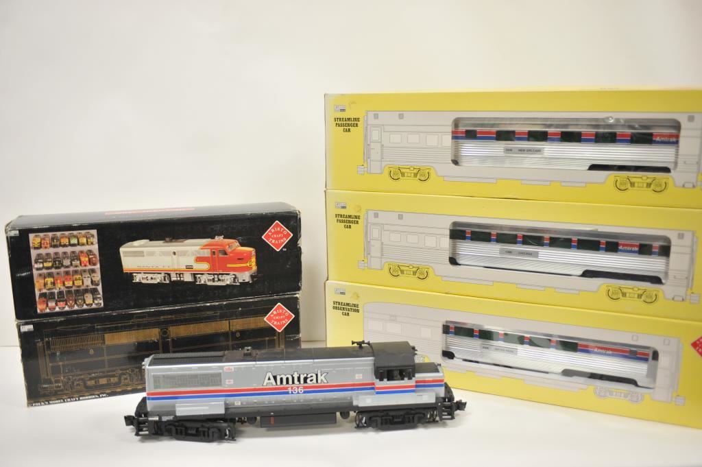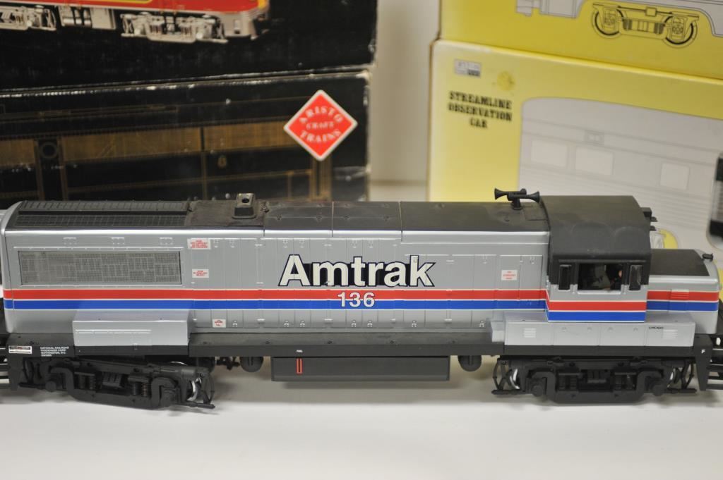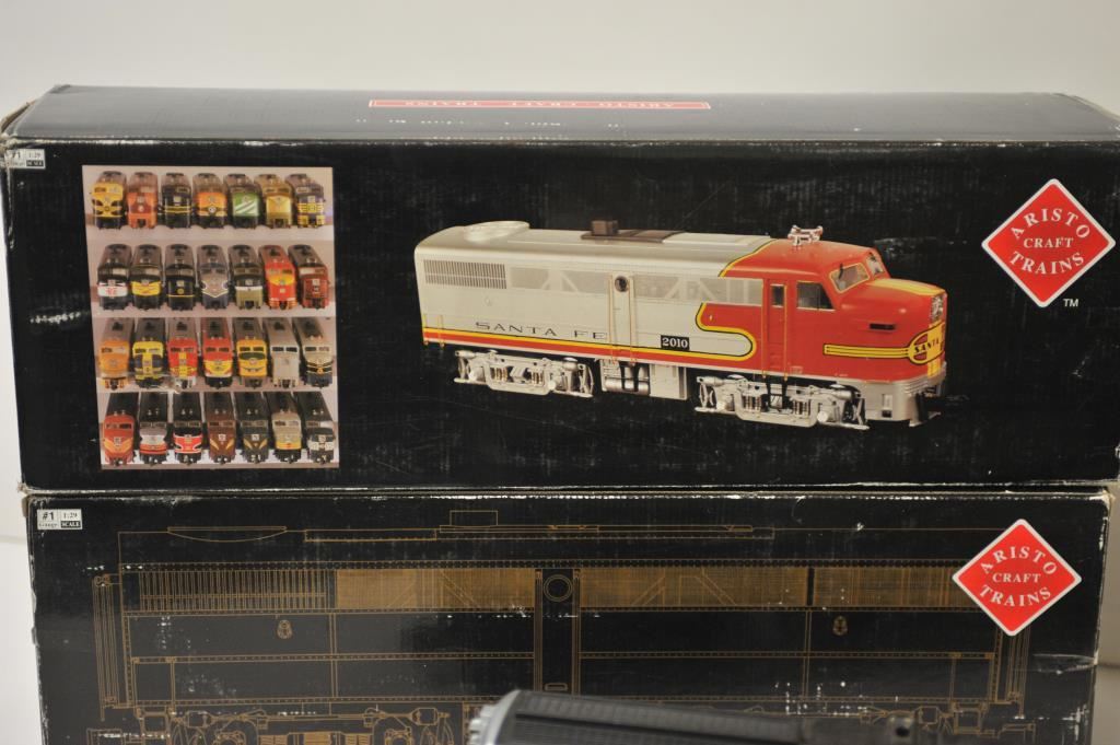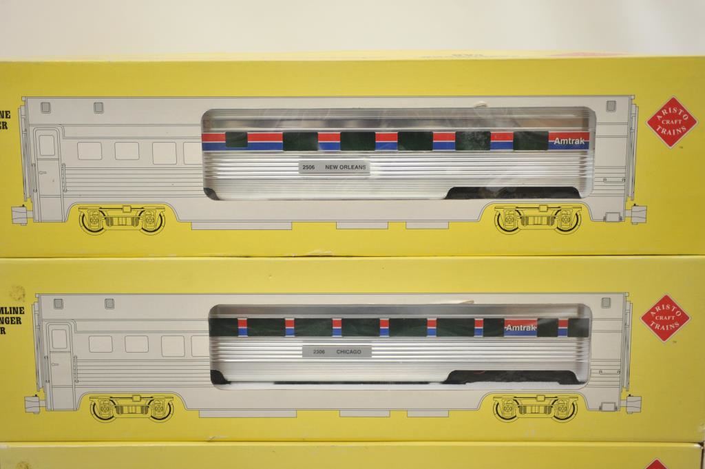 Lot of 6 big boxed Aristo Craft Train cars (#1 gauge/1:29 scale), like new, including an Amtrak Engine, a Coach ATK/AMTRAK car, A Diner AMTRAK car, an Observation AMTRAK car and two additional locomotive engines (one marked Santa Fe). Est.: $400-$800.