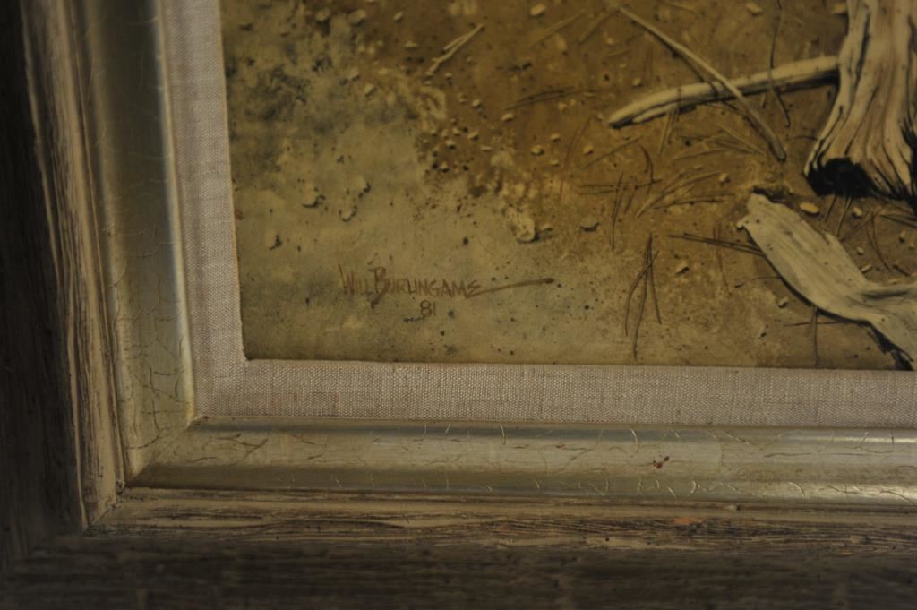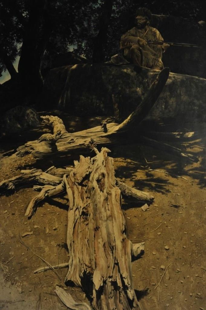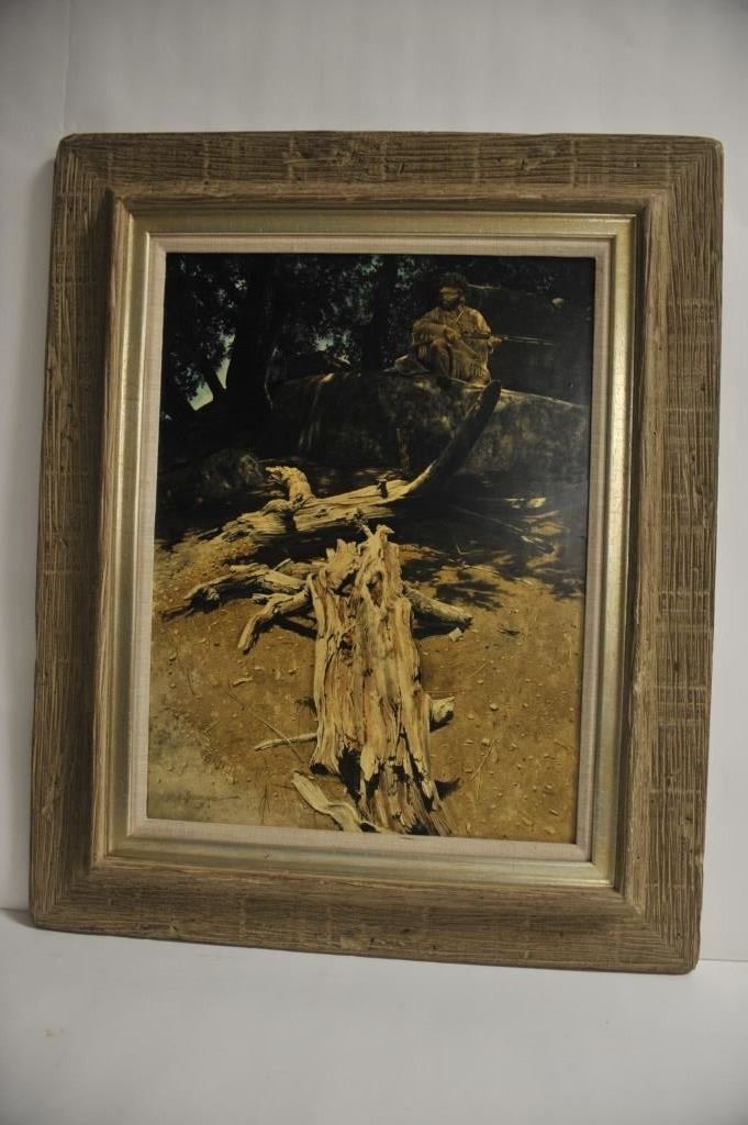 Large framed print on board entitled “With An Ear On The Wind” of hunter in woods by Wil Burlingame; approximately 35” x 28” overall. Est.: $150-$300.