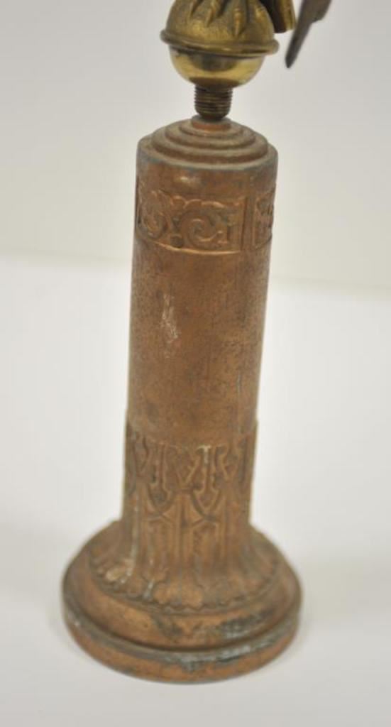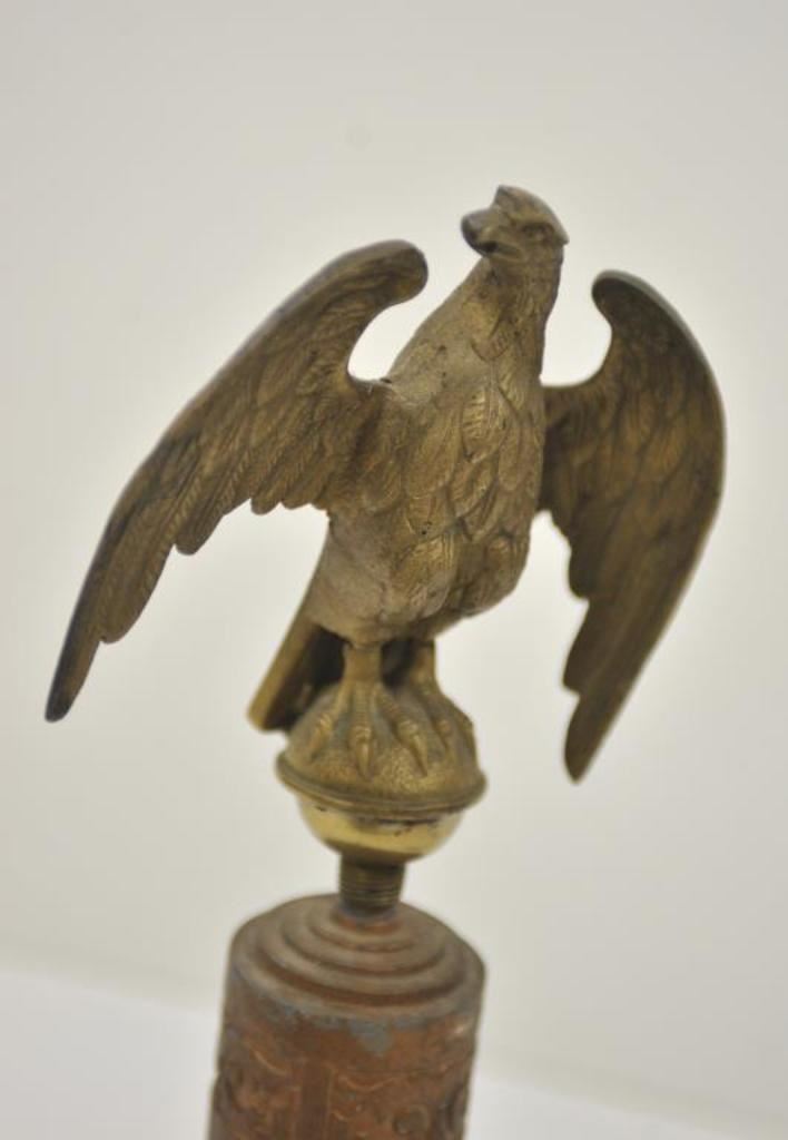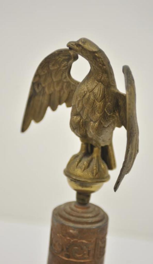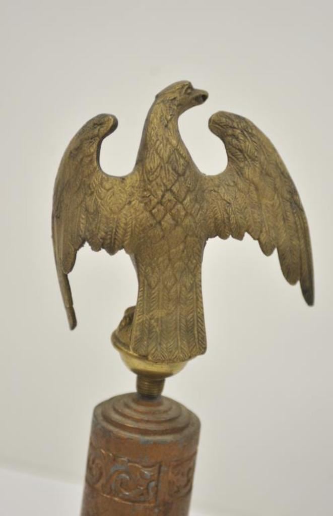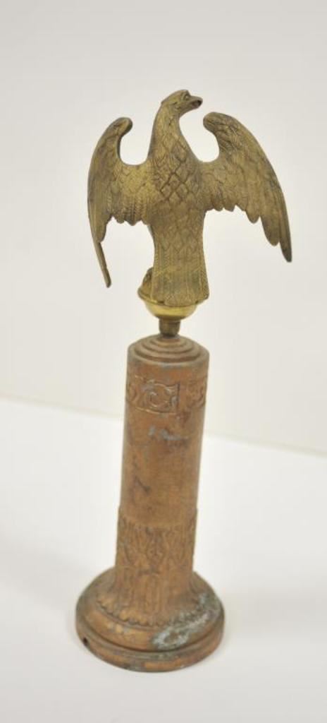 Brass spread eagle, possibly Mexican, for decoration of top of a flag pole; mounted on a fancy cast metal stand; both approximately 16” in height. Est.: $100-$150.