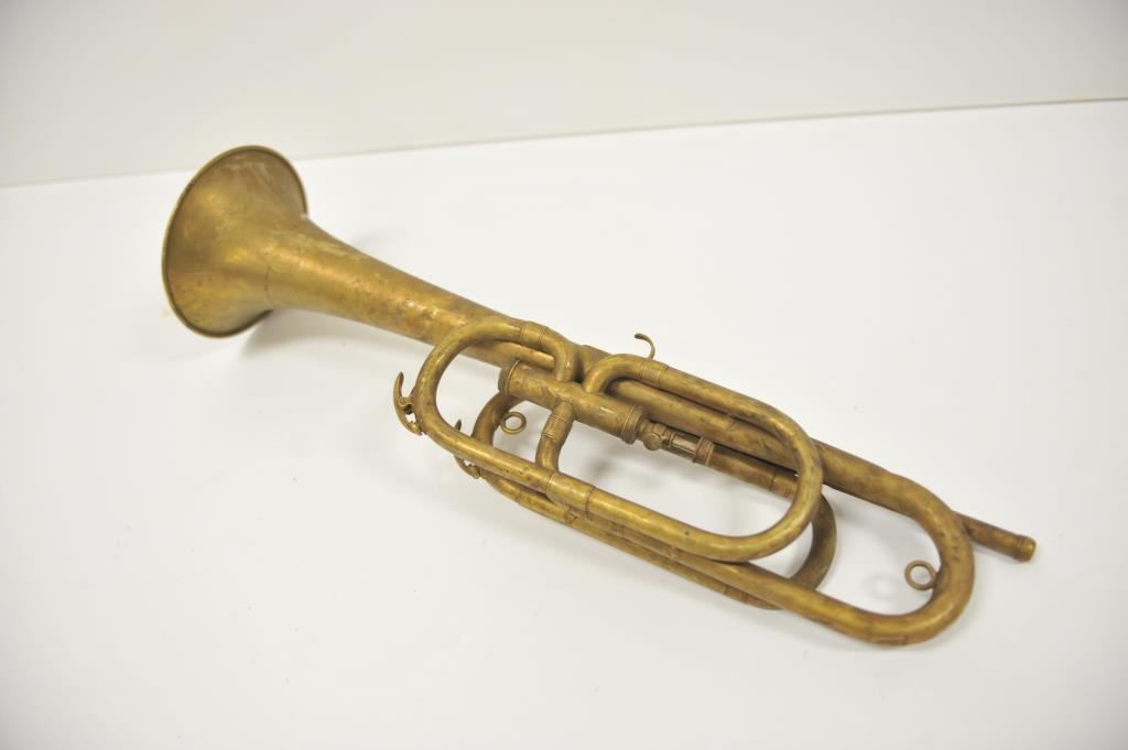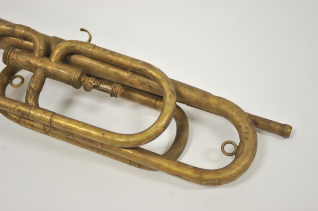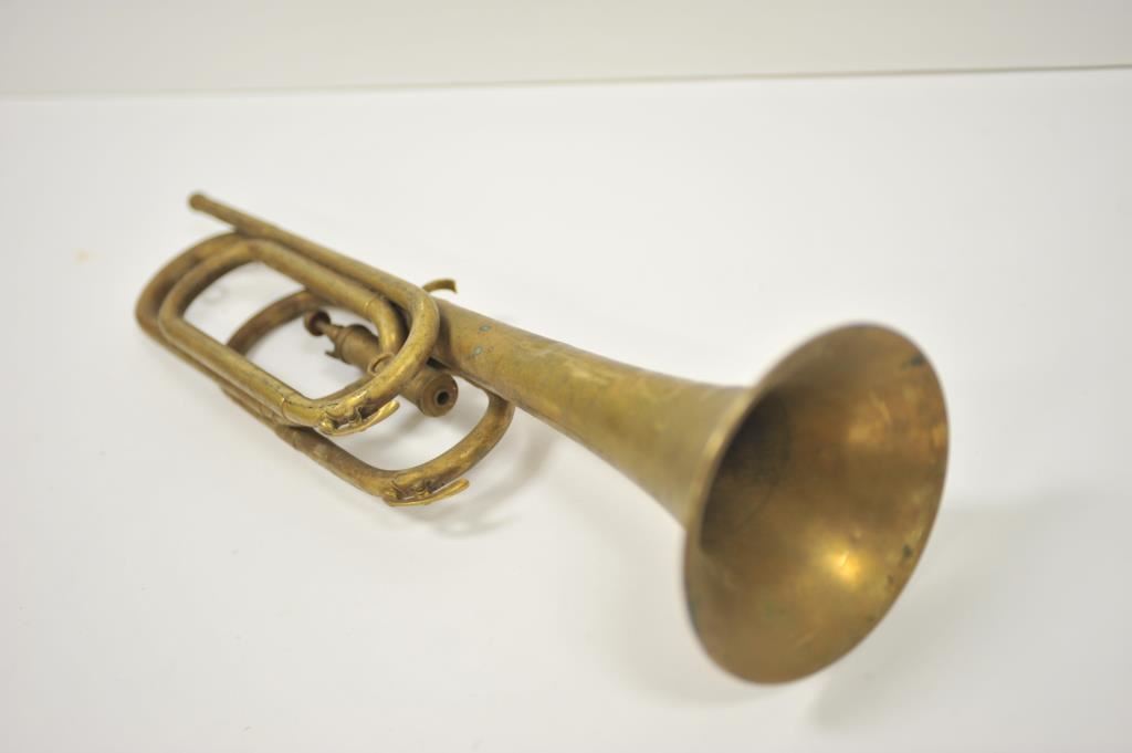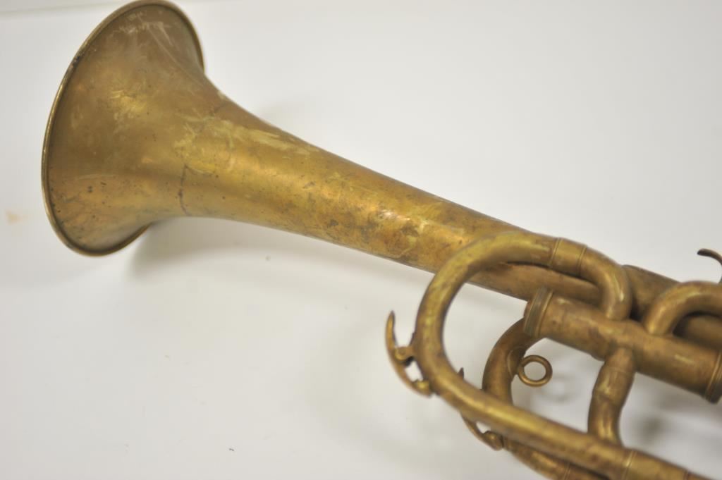 Old brass trumpet, worn condition, missing mouthpiece, nice patina. Est.: $30-$60.