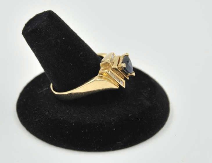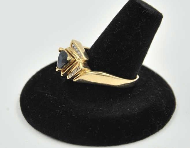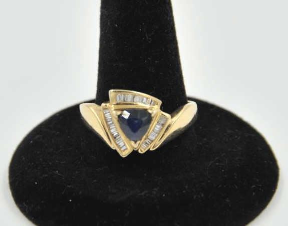 18PRS-15 SAPPHIRE & DIAMOND RINGOne ladies ring in 14k yellow gold set with a trilliant cut sapphire wt approx 1.75 ct and diamond 21 baguettes EST:$ 750-1000One ladies ring in 14k yellow gold set with a trilliant cut sapphire wt approx 1.75 ct and diamond 21 baguettes EST:$ 750-1000