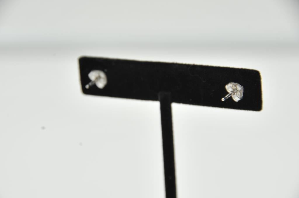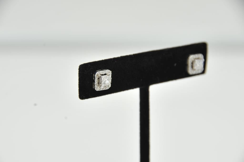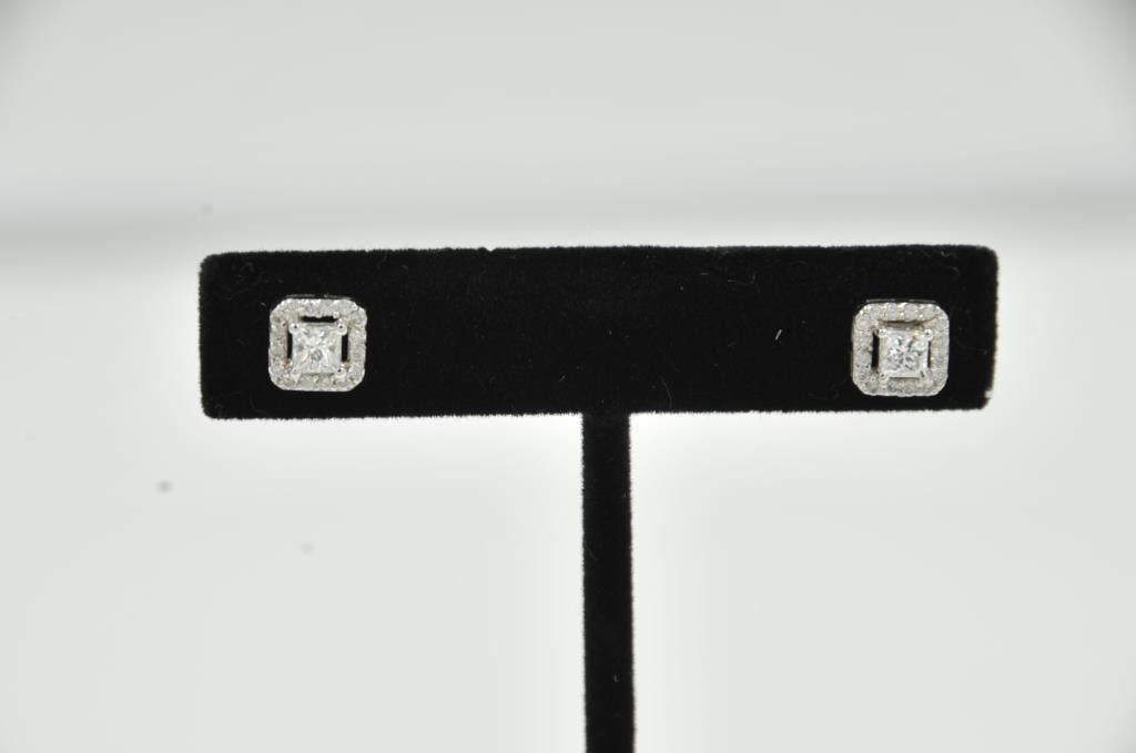18PRS-5 DIAMOND EARRINGSOne pair of earrings set with princess cut diamonds framed by round diamonds weighing approx 1ct in 14k white gold EST:$2000-2500One pair of earrings set with princess cut diamonds framed by round diamonds weighing approx 1ct in 14k white gold EST:$2000-2500