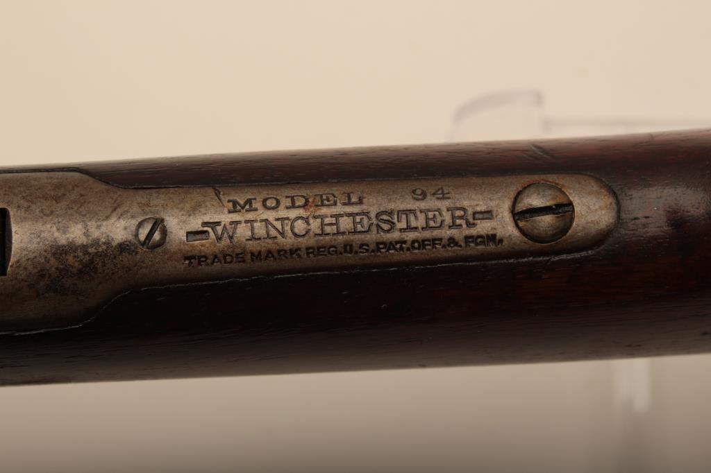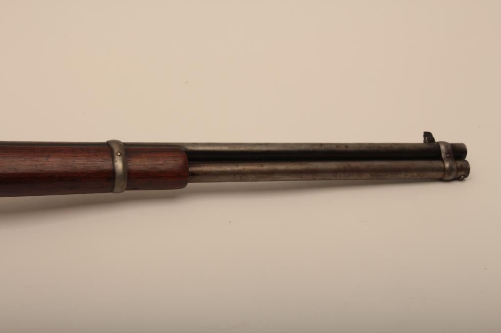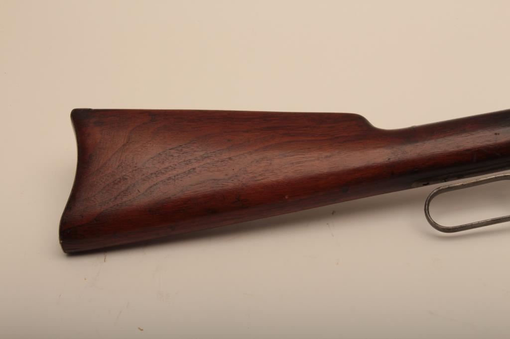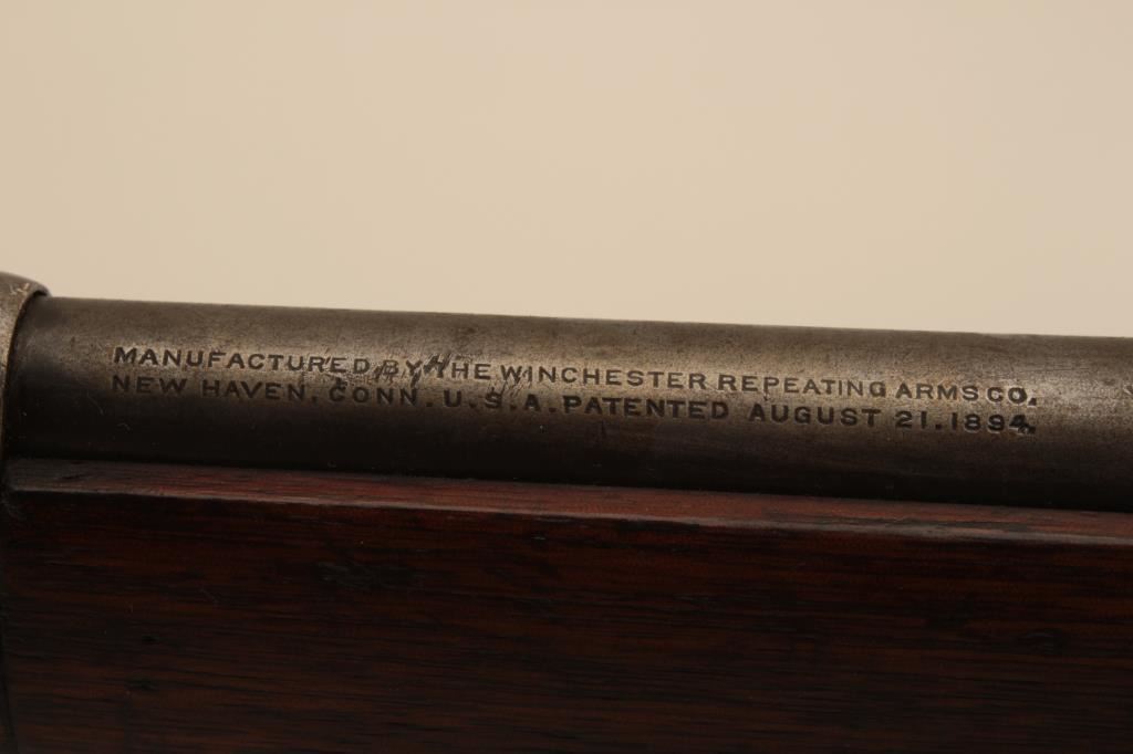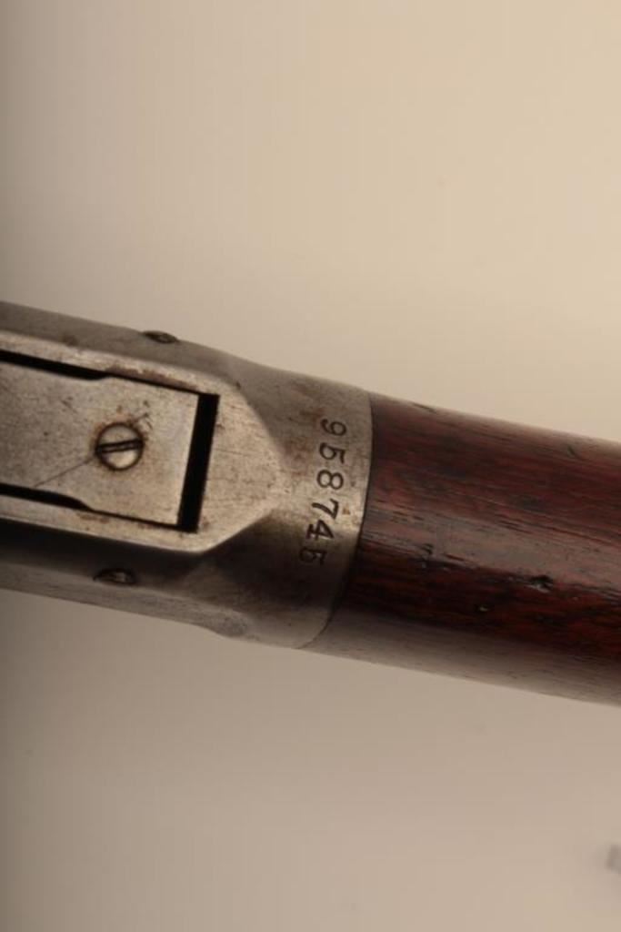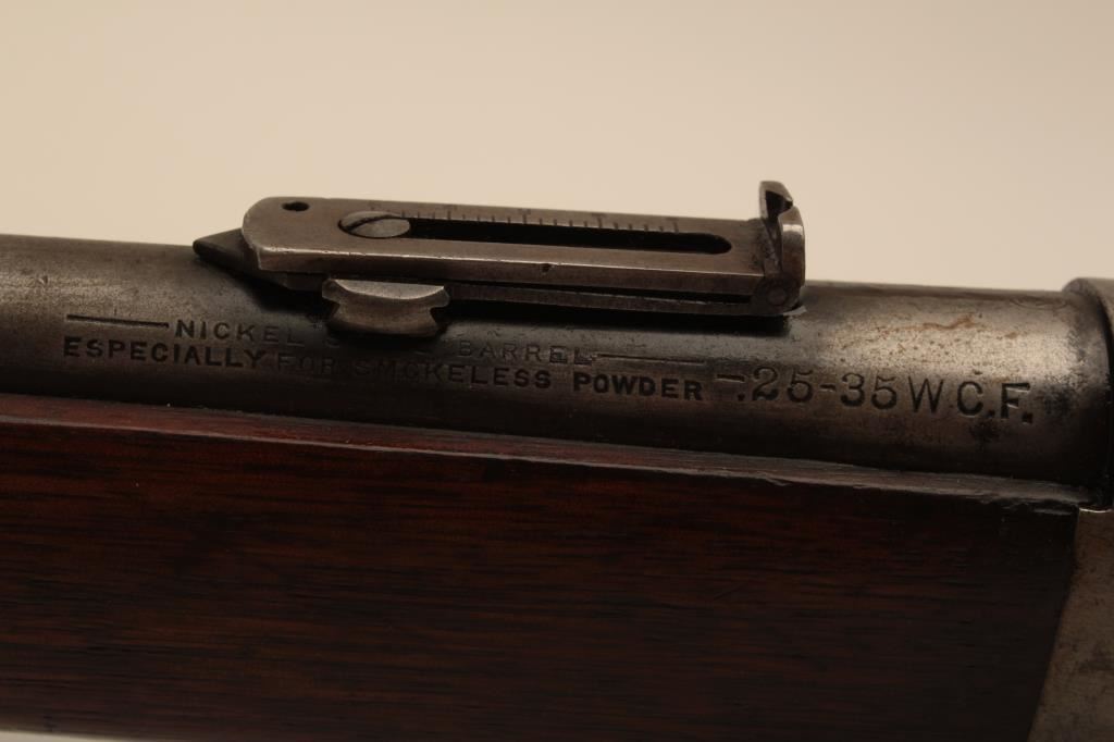 Winchester Model 1894 S.R.C. in .25-35 caliber, S/N 958745. Good overall condition with 10%-20% blue on the barrel where protected. The balance has gone to gray/brown patina with minor pitting and erosion. The stocks are good with coating of varnish or shellac but no sanding with great fit to metal. Correct carbine sight and small parts. Front sight blade is period replaced in original base. The action is tight and the bore is very good plus. Some minor pitting on right side of the frame. (C&R) Est.: $600-$1200