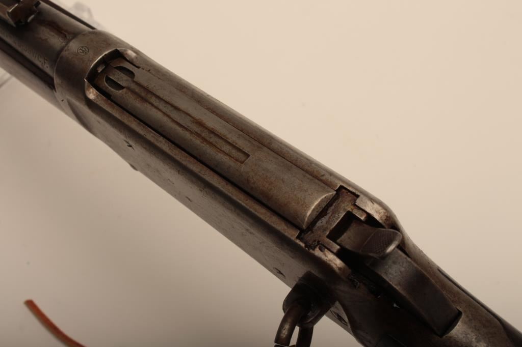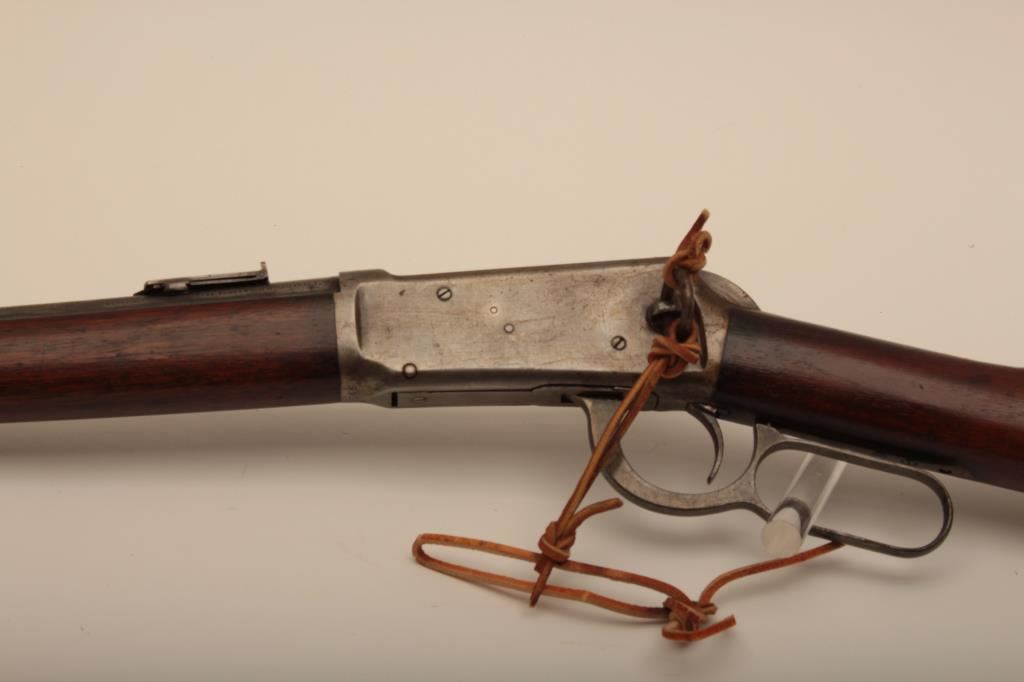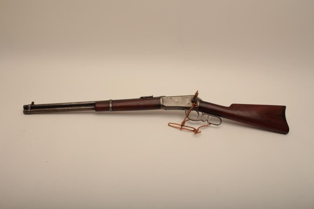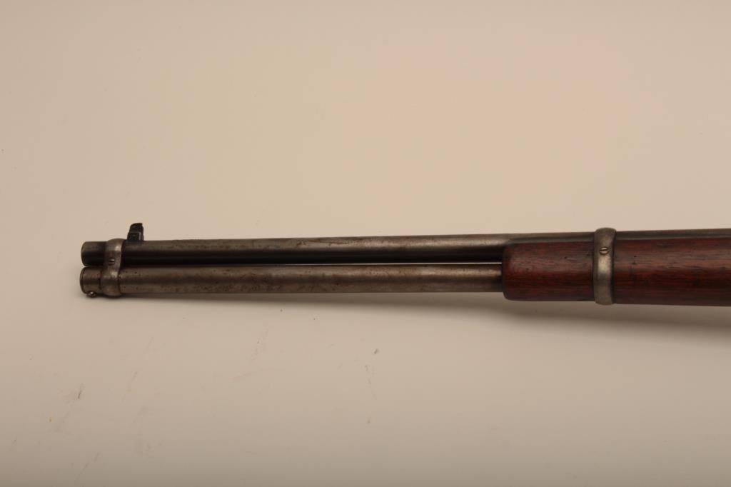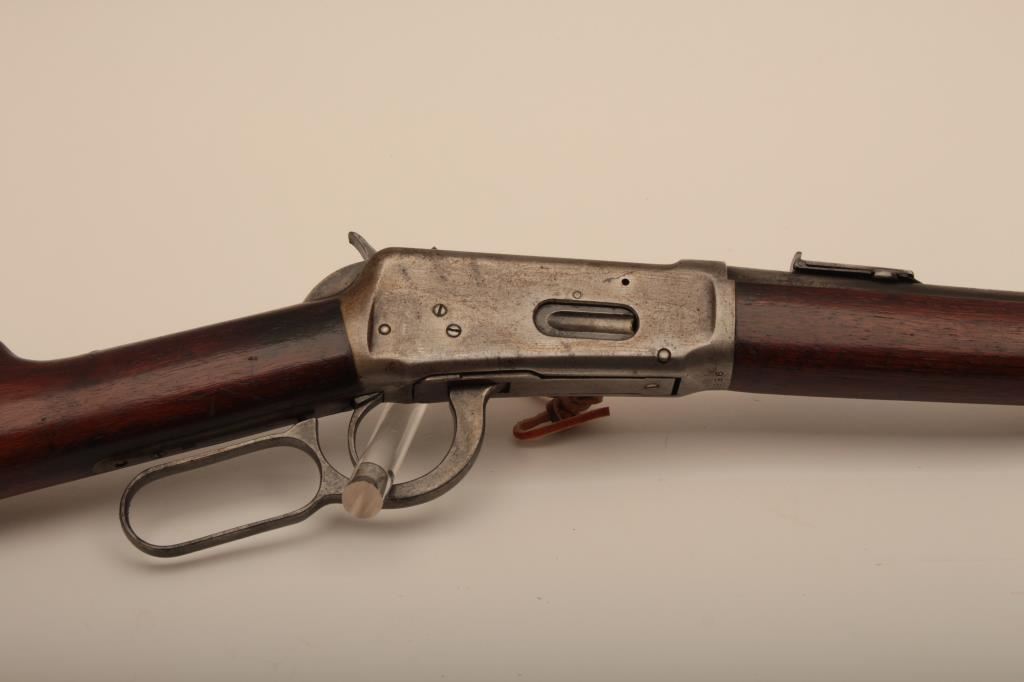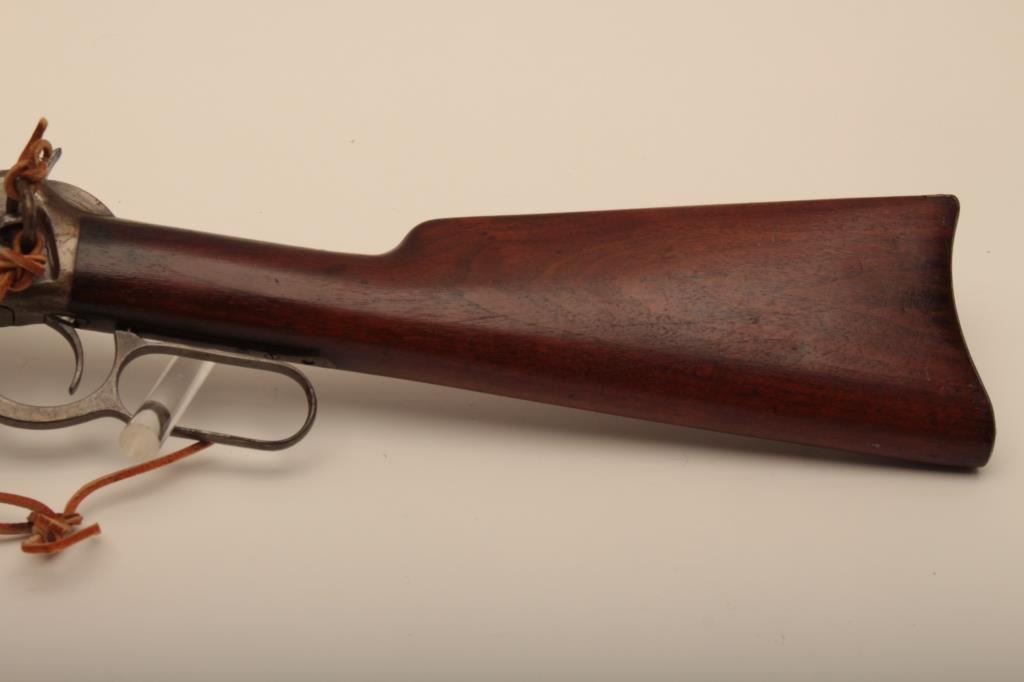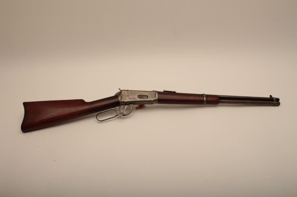Winchester Model 1894 S.R.C. in .25-35 caliber, S/N 958745. Good overall condition with 10%-20% blue on the barrel where protected. The balance has gone to gray/brown patina with minor pitting and erosion. The stocks are good with coating of varnish or shellac but no sanding with great fit to metal. Correct carbine sight and small parts. Front sight blade is period replaced in original base. The action is tight and the bore is very good plus. Some minor pitting on right side of the frame. (C&R) Est.: $600-$1200