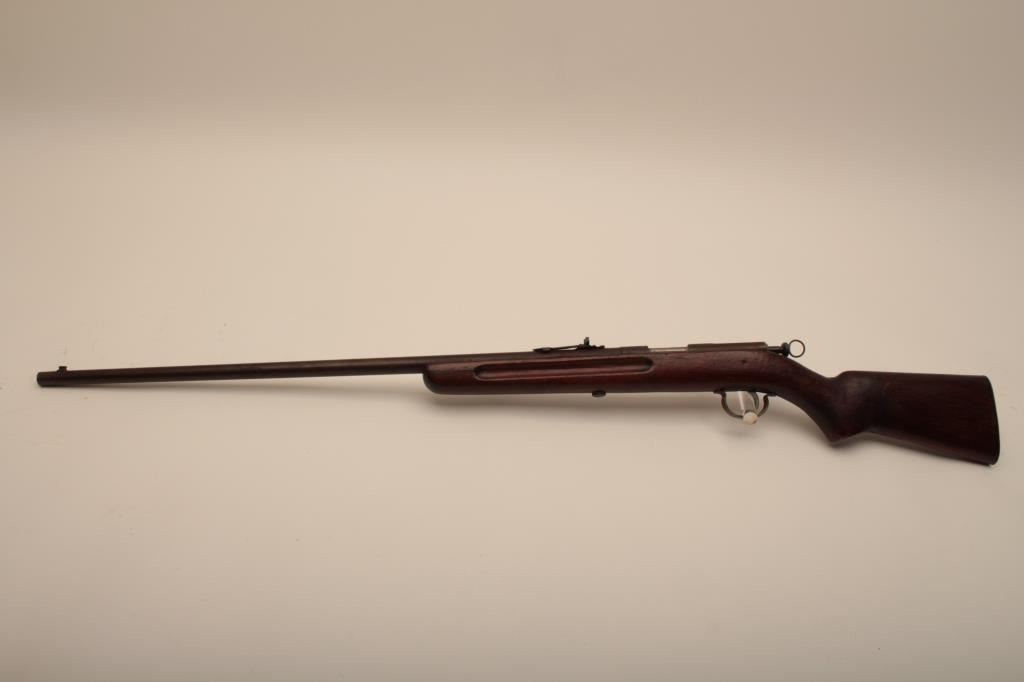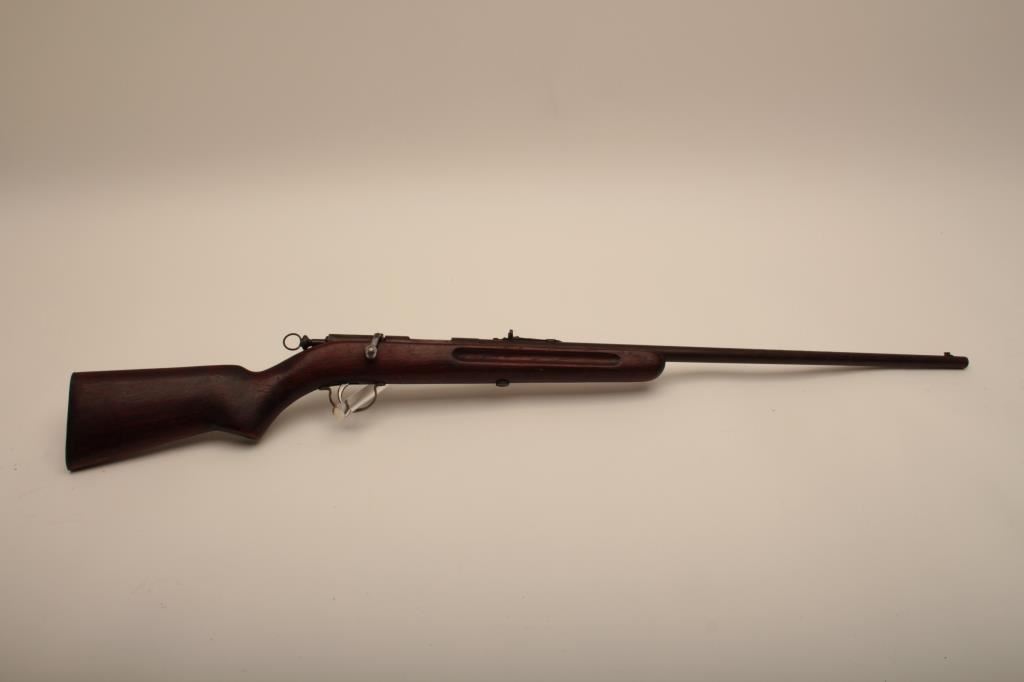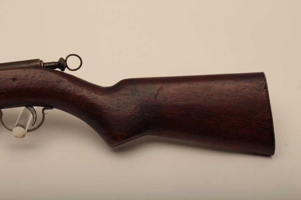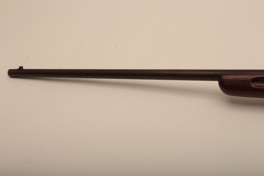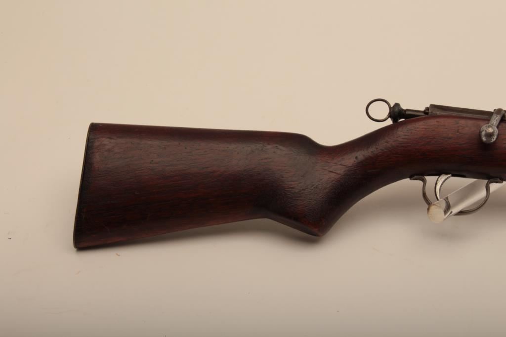 Remington Model 33 Bolt Action Single Shot boys rifle with ring cocking bolt. The stock has been reduced to 10 ½”. Fair to good overall. The bore is dark. A very safe design for beginner’s rifle. (Modern) Est.: $50-$100