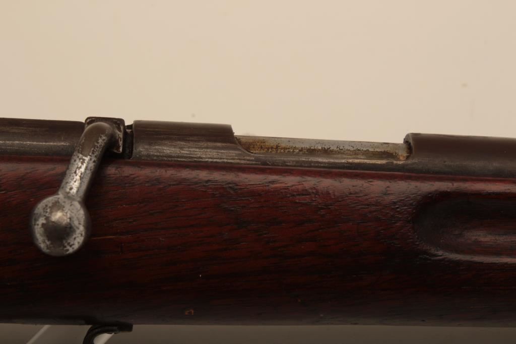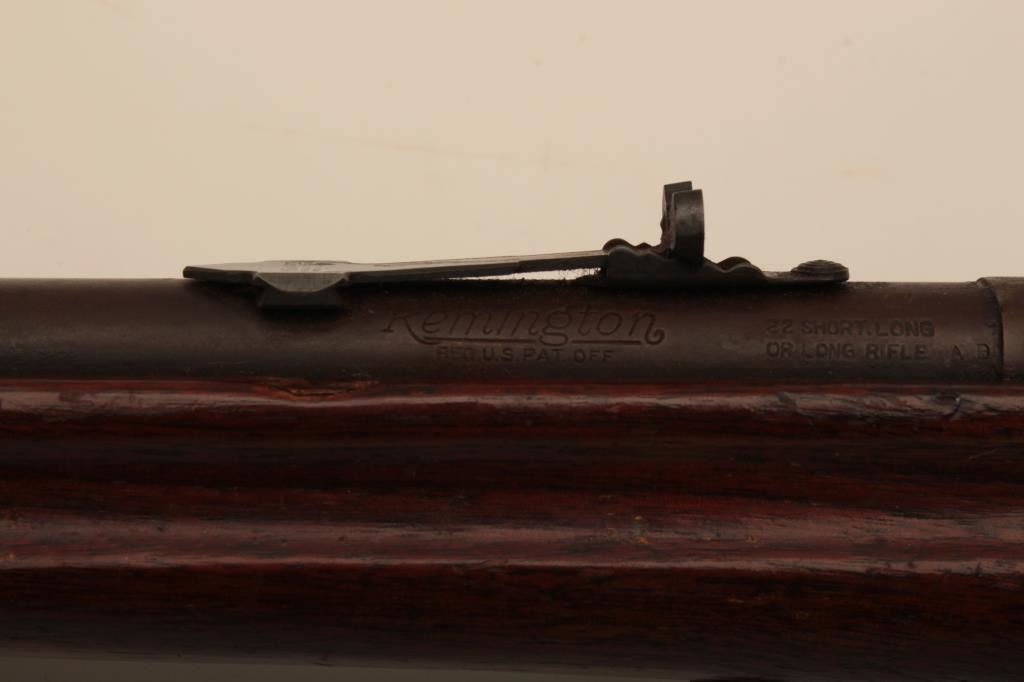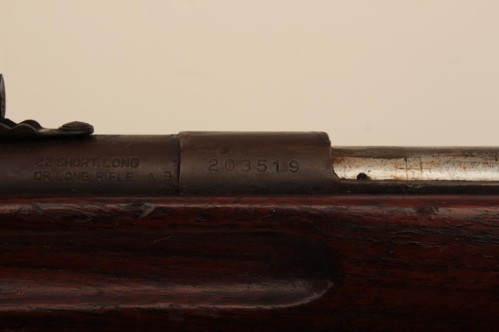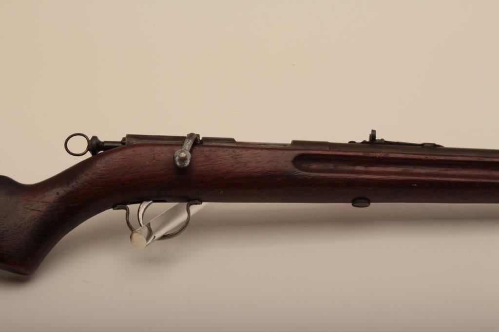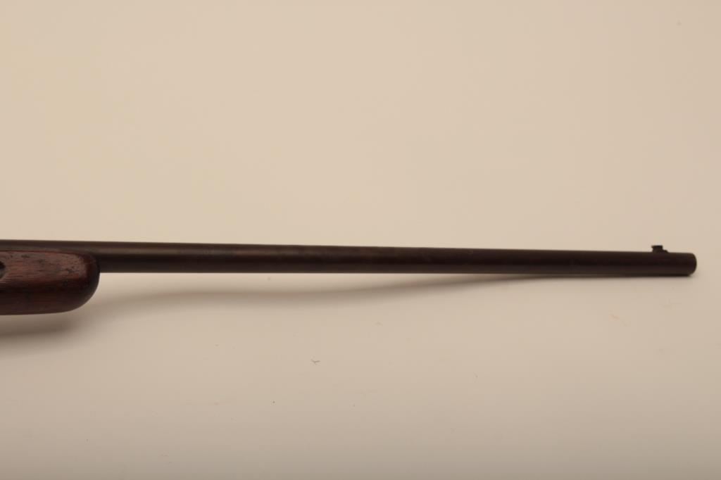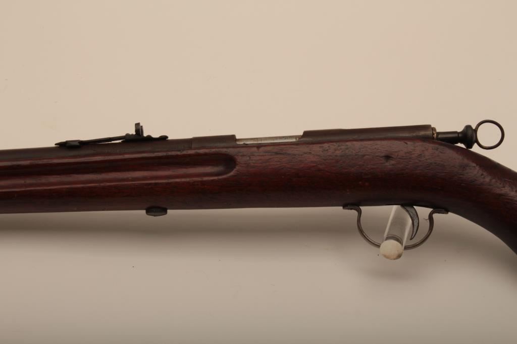 Remington Model 33 Bolt Action Single Shot boys rifle with ring cocking bolt. The stock has been reduced to 10 ½”. Fair to good overall. The bore is dark. A very safe design for beginner’s rifle. (Modern) Est.: $50-$100