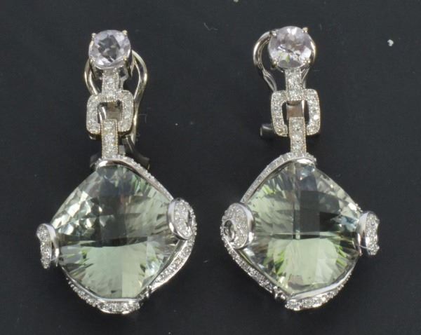 Matching necklace sold in separate lot. With appraisal: "One pair of 18kt white gold green amethyst, white sapphire and diamond earrings. The earrings contain two (2) cushion cut green amethysts, two (2) round white sapphires. The earrings also contain forty-seven (47) round diamonds with an approx. total weight of 0.50 ct. The earrings weigh 62.0 grams. Approx. Appraised value: $2,950."