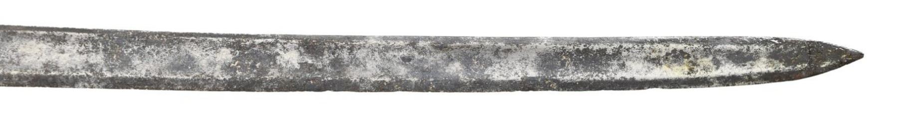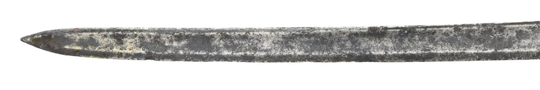 Overall length: 30”. Blade length: 24 1/4". Blade has a single wide fuller with foliate etching as it nears the ricasso. There are the remnants of more engraving that has been obliterated by pitting. Downturned, pierced, foliate embellished guard with a crossguard that has a somewhat horse’s hoof appearance. Brass ferrule & pommel cap. Checkered wood grip. No scabbard. CONDITION: blade has severe pitting and a mottled patina. Hilt has a pleasing patina on the brass. The grip shows some wear and appears to have been coated with a preservative. (02-20016/BF). $350-500.