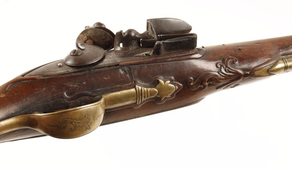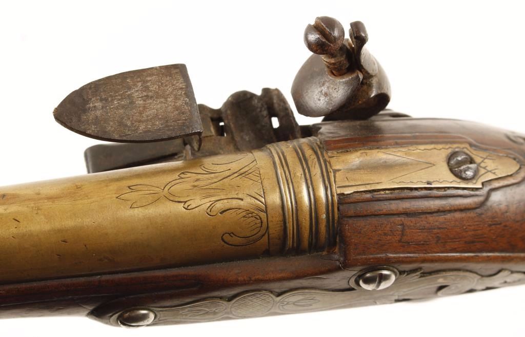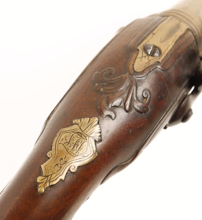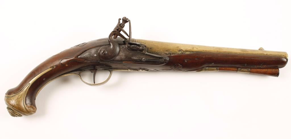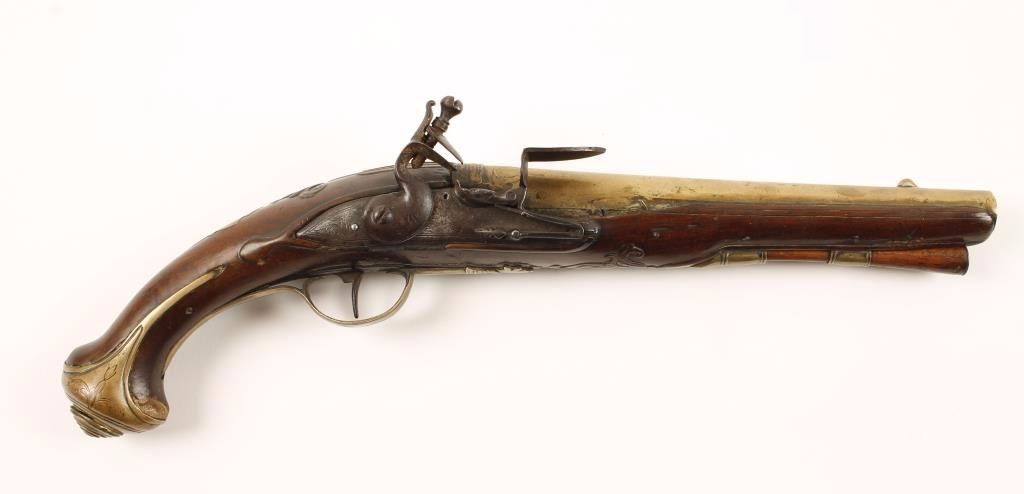 Engraved flintlock pistol circa 1760 - 1780. Original flintlock with correct hammer, trigger, & small parts, most likely French with the initials L.F.D. inscribed on plate in wrist. Features a 9.25" engraved and contoured barrel approx. 60 cal, 16" overall length, engraved brass embellishments, finely contoured wood. Just the type Lafayette and his officers carried during the American Revolution. Shows small losses of wood and normal aging with an exceptional patina with an "Out of the attic look". Condition is very good+ as antique. ***Antique Firearm***