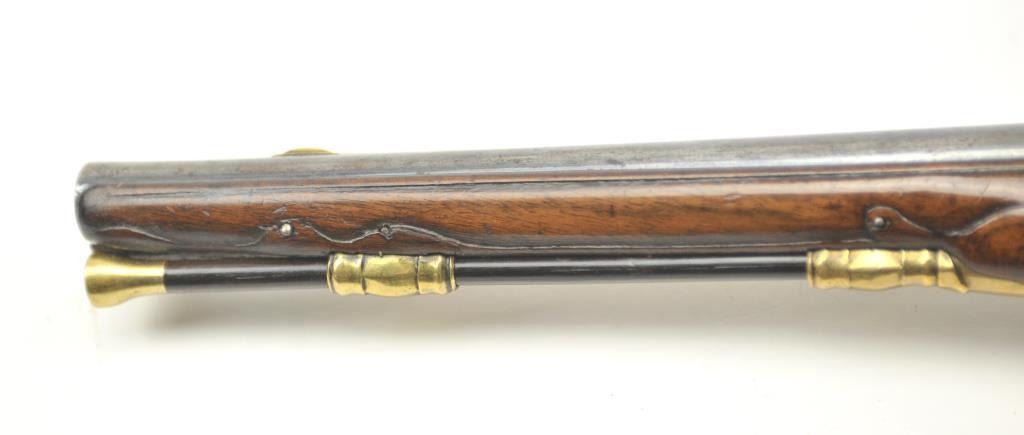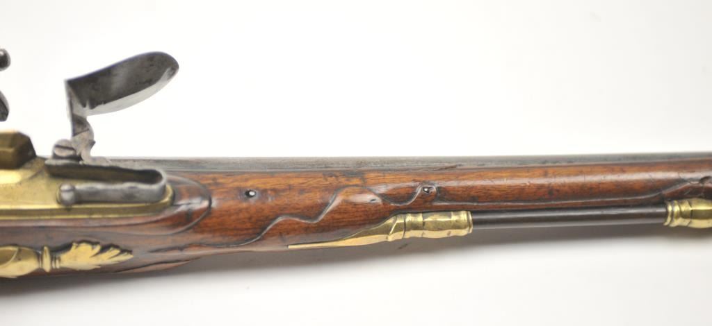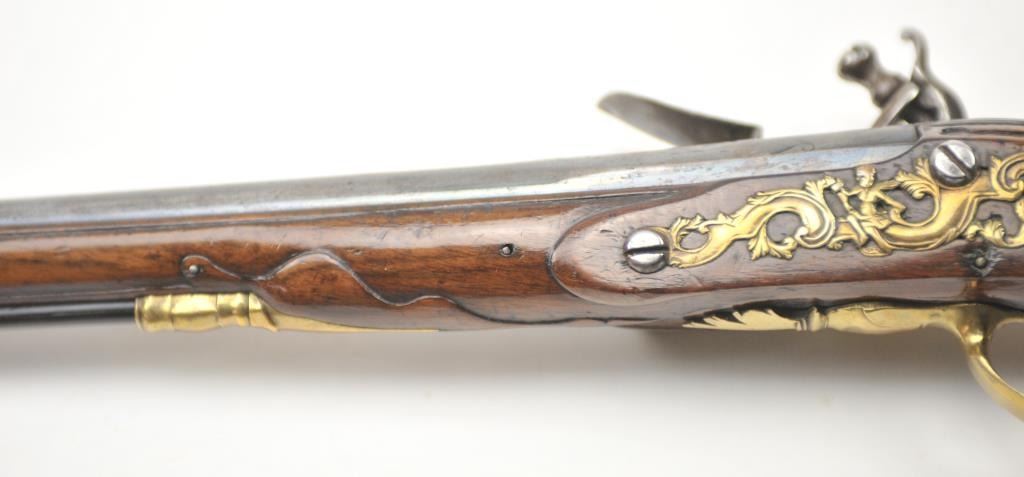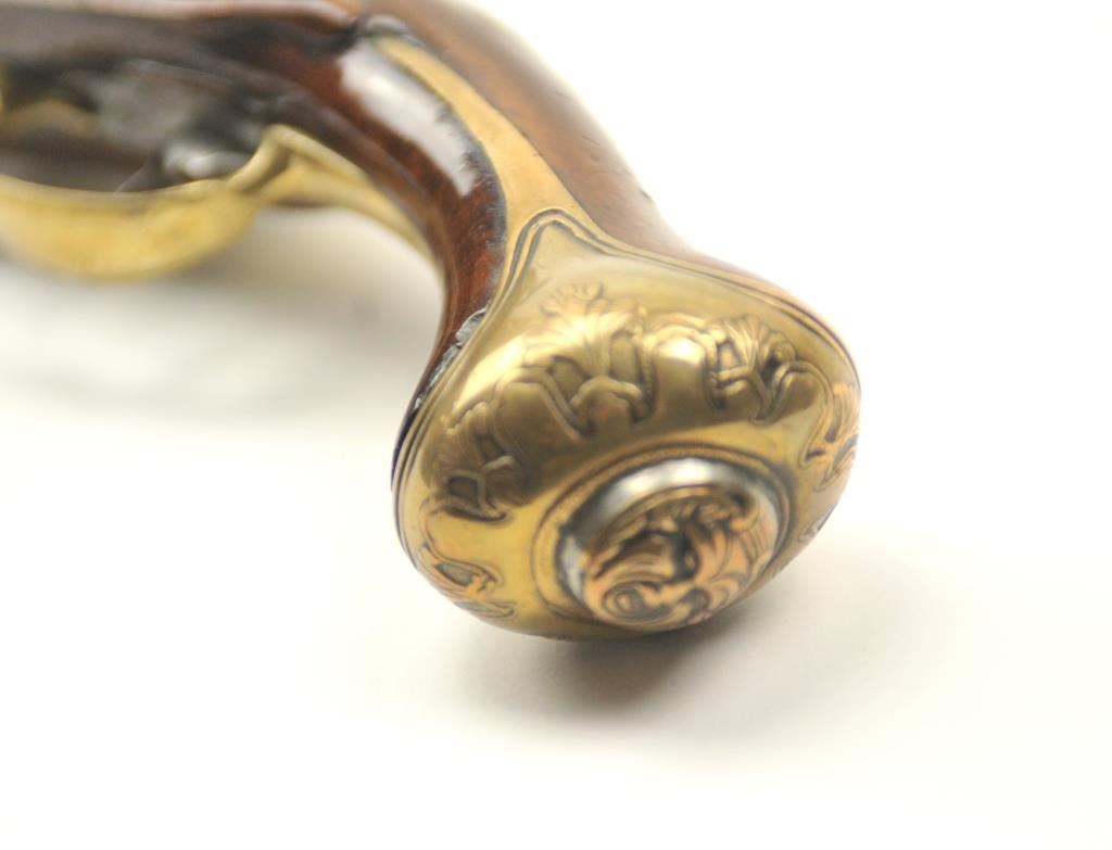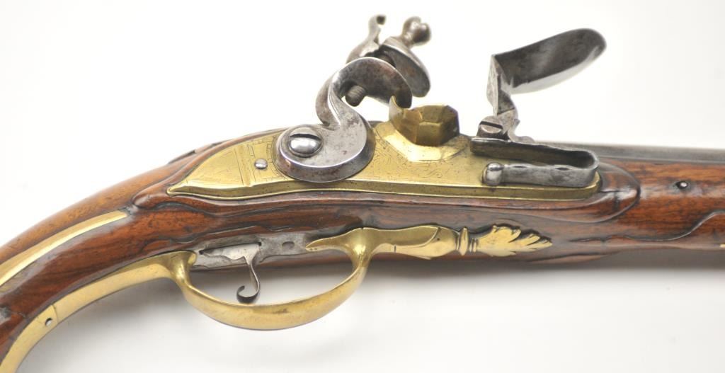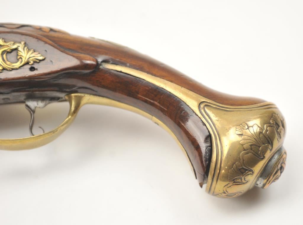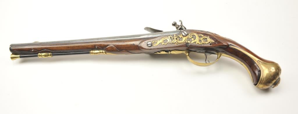 18th century flintlock horseman’s size pistol signed L. Valet on the lock (possibly Laurent Valet of Dunkirk, France circa about 1750). The pistol measures 21” in overall length with a 14” barrel of .60+ calibersmoothbore. The overall condition is very good plus showing original fire blue on the barrel and gold gilt on the brass lock and mounts, pierced side plates with a grotesque mask butt cap. An original flintlock withall correct parts. The stock is good to very good with minor losses and imperfections. The stock also shows top quality carving and molding around the mounts, a brass tipped correct style rod. An impressive pistol from Northern France that could have travelled to America during the French and Indian War or U.S. Revolution. Est.: $2,500-$5,000.
