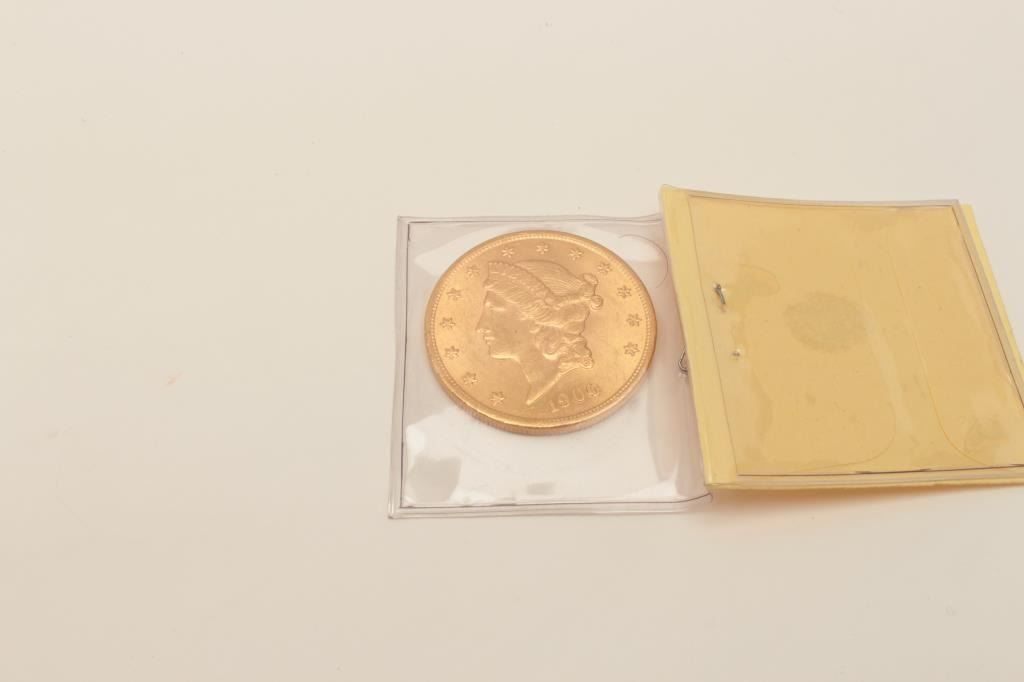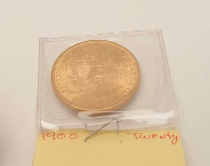 1900 $20 U.S. gold. Not professionally graded. A.U.-Unc. Old collector’s horde. $1200-$1800