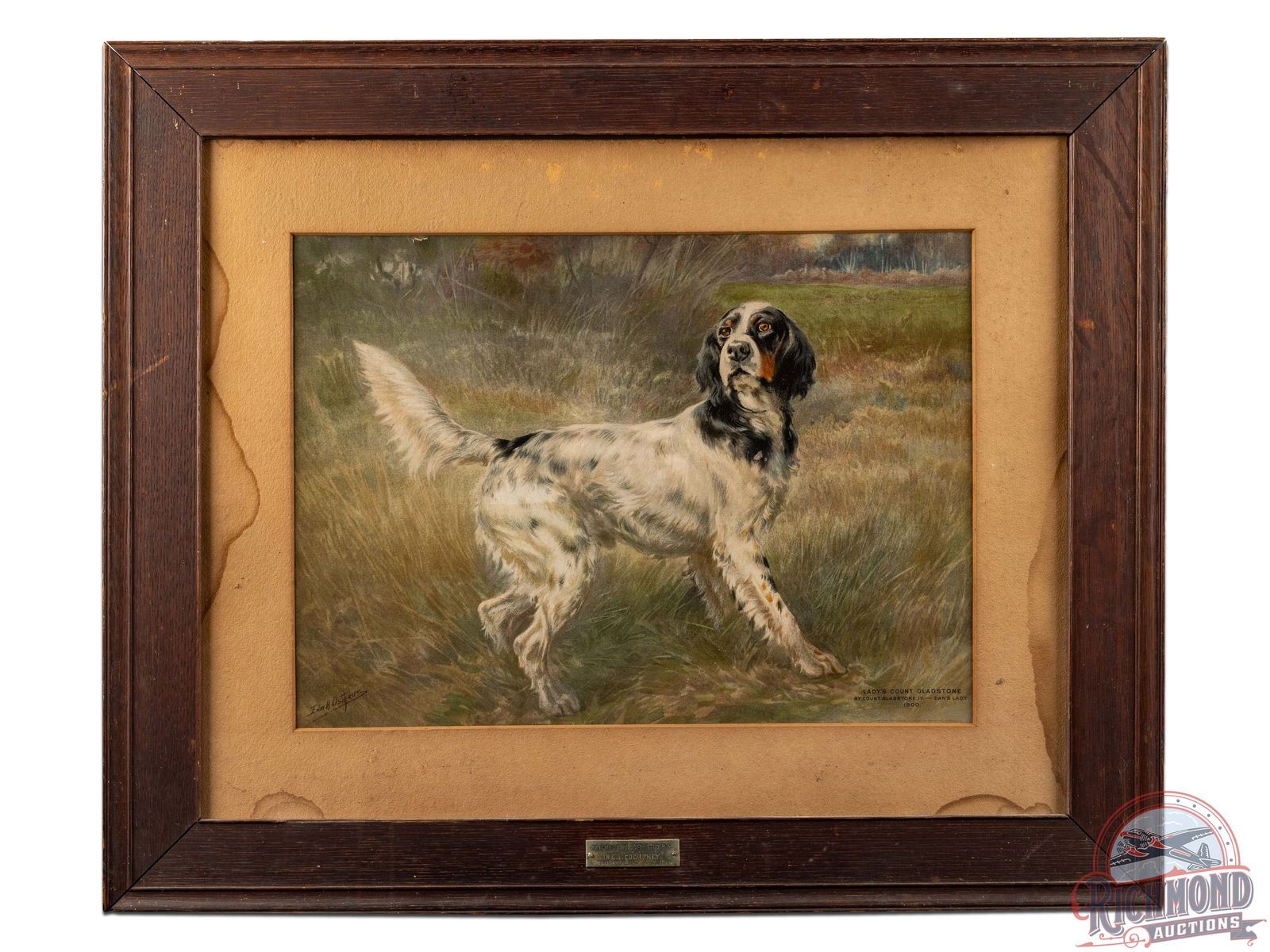 Framed paper lithograph poster featuring "Lady's Count Gladstone," one of a series of thirteen posters depicting the National Field Trial Championship winners from 1896 through 1910. Lithograph based on the original artwork by renowned artist Edmund Henry Osthaus. Reads "By Count Gladstone IV - Dan's Lady, 1900." Exhibits areas of staining along the outer matting, one area of damage along the top edge of the poster and a small area of touch up in the dog's chest. Mounted under glass in believed to be the original wood frame with plaque reading "DuPont 1908 Trophy Won By" and etched with "Chas. A Courtney, Sulligent, Alabama, July 10." 27.75" H x 33.75" W.