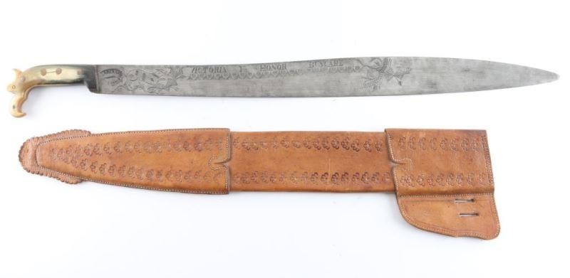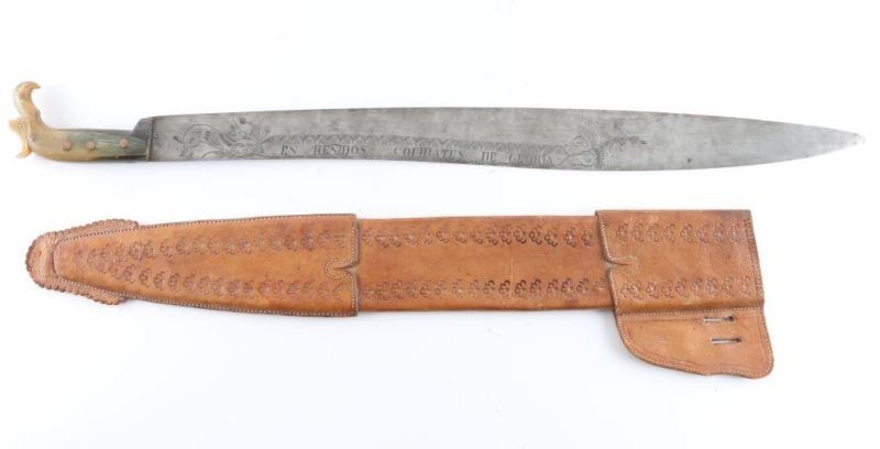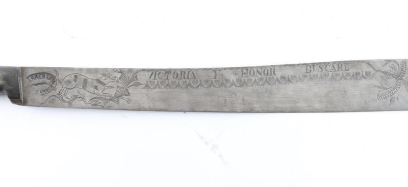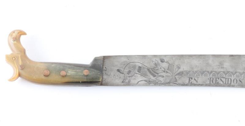 with fancy engraved and maker marked blade. Approx 30.5" overall all in very good to almost fine condition Type carried by Pancho Villa and his men. With horn grip with eagle head.