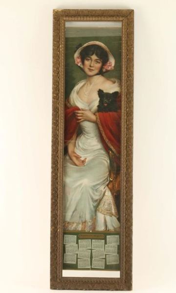 Front depicts a Victorian lady in lovely white dress with her little black dog. Lower half of advertiser reads 'Pompeian Beauty by Carle J Blenner' with calendar months of 1912. Back of advertiser explains the benefits of Pompeian Massage Cream for Her, for Him, and more. Image measures 32"x8". In molded wood frame.
