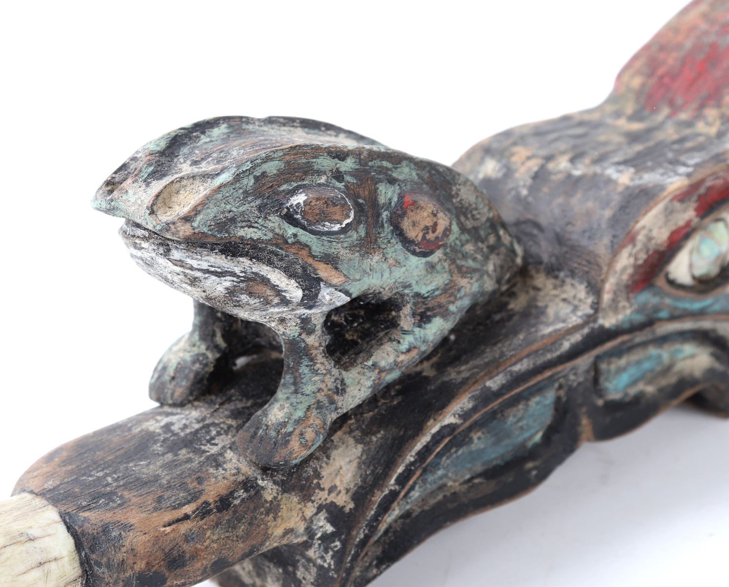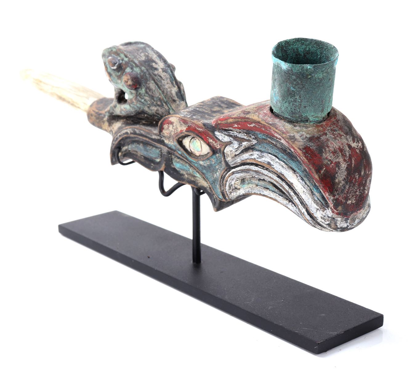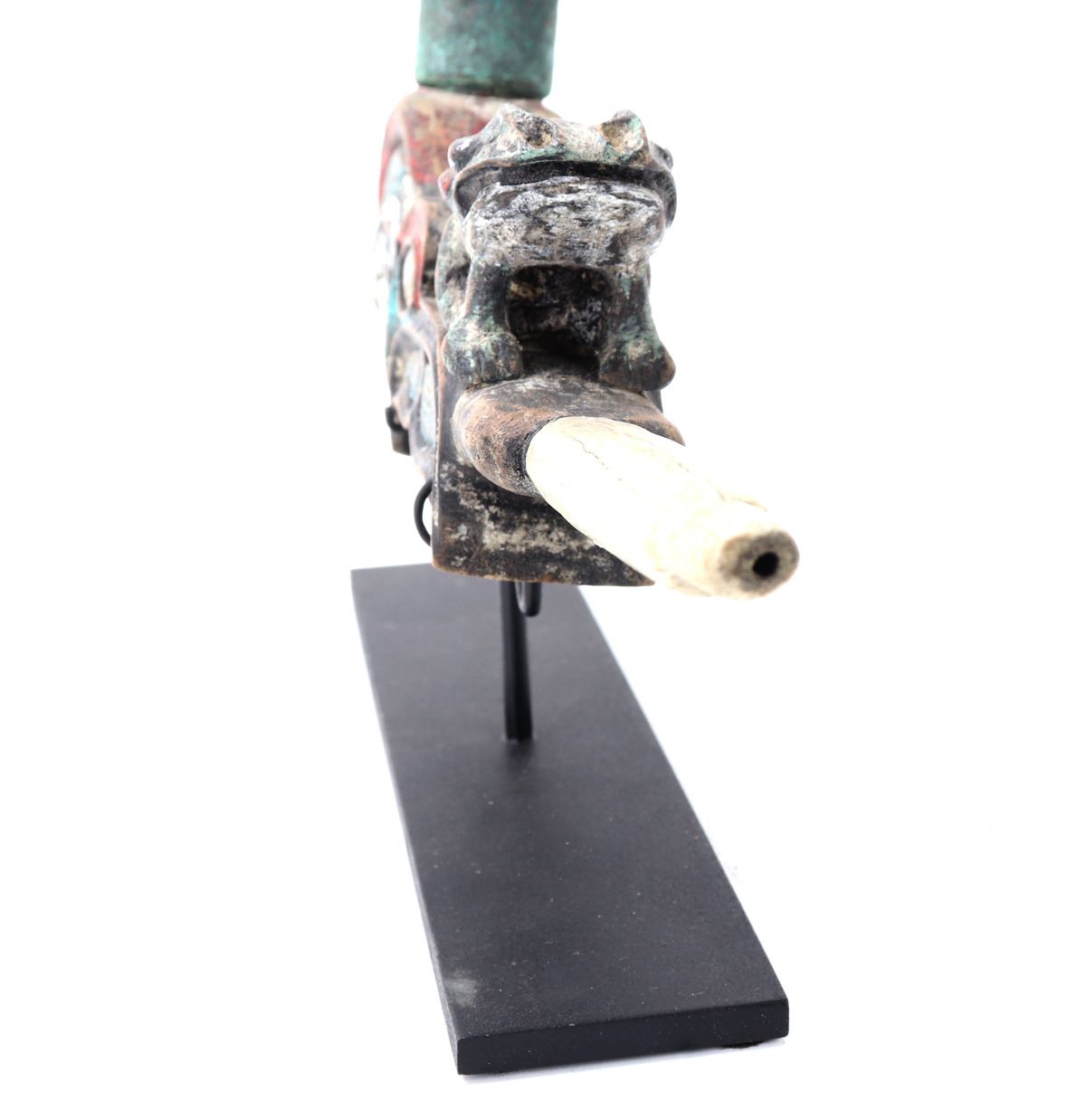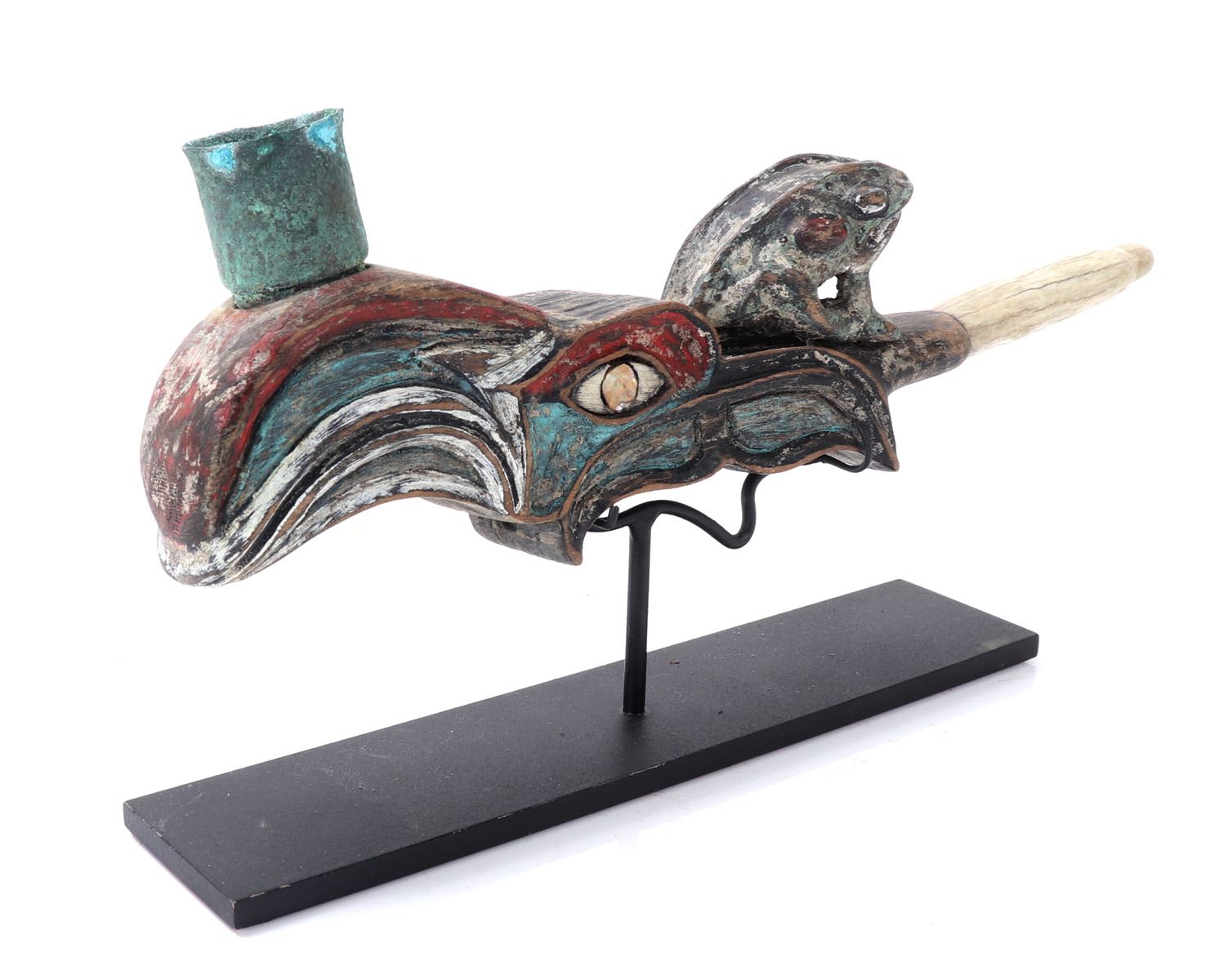 Port Hardy, British Columbia 1920's smoking pipe. Comprised of wood, antler and bone with the body in the shape of a bird with a large beak, mother of pearl inlayed eyes, and a frog facing the opposite way. On the top of the beak is where the tobacco would be placed and the antler acts as the smoking shaft. Size 12" L x 4" W, custom stand included.. Condition: Well preserved condition throughout.