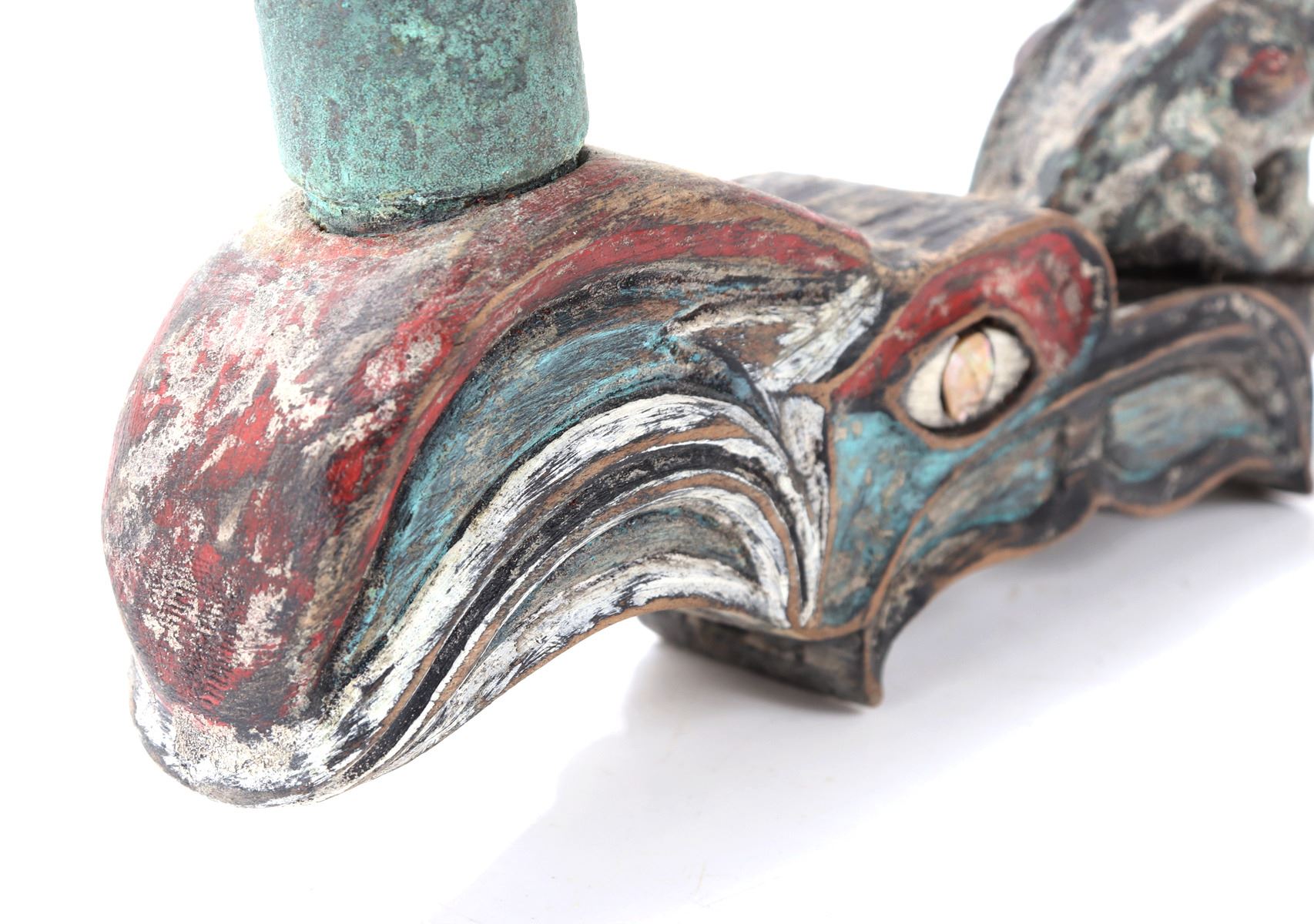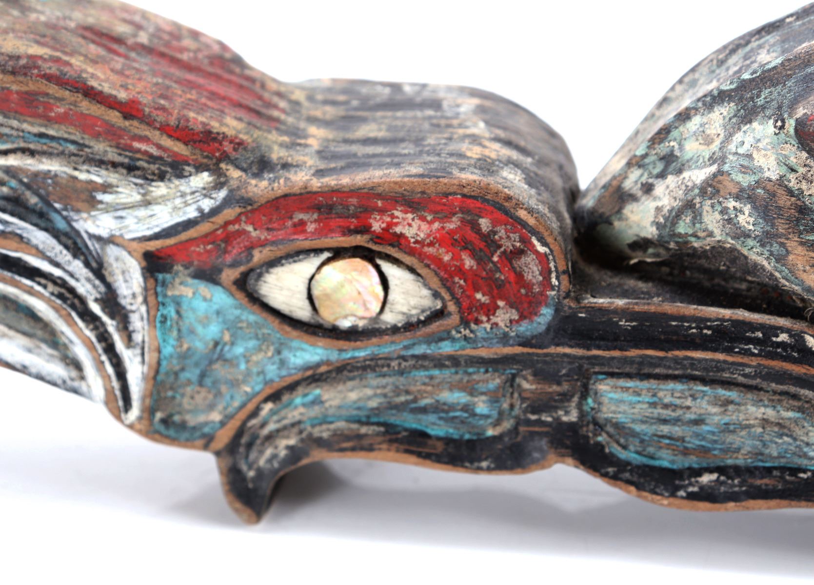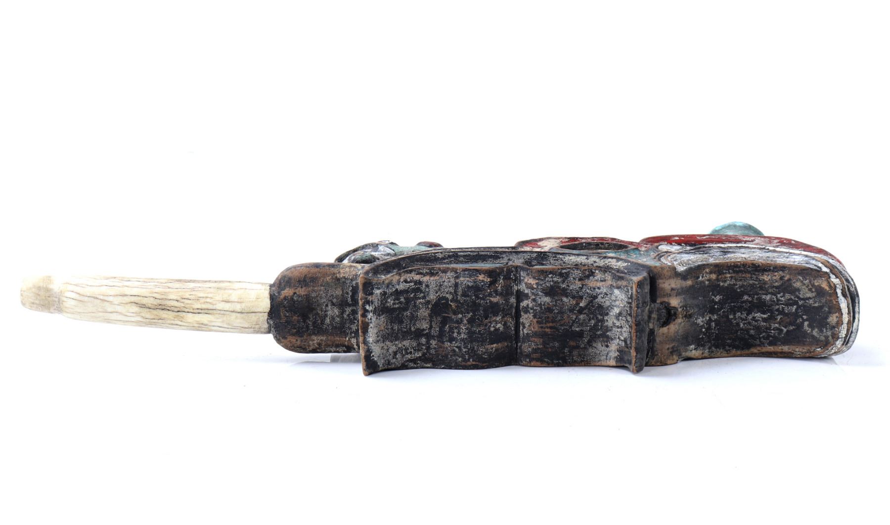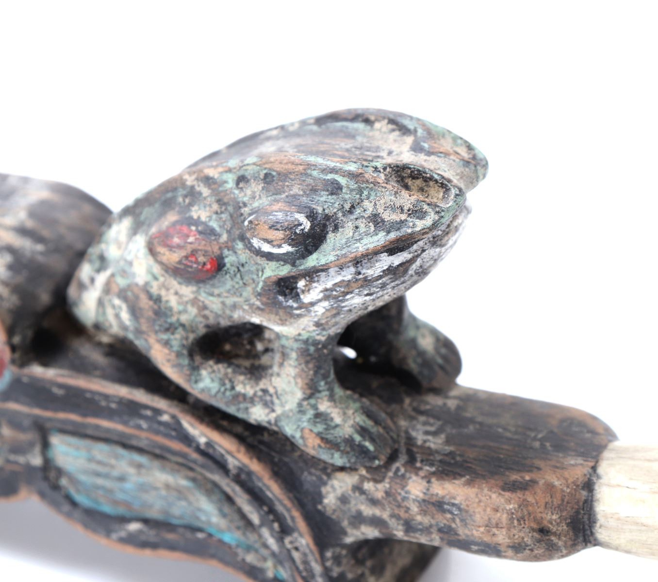 Port Hardy, British Columbia 1920's smoking pipe. Comprised of wood, antler and bone with the body in the shape of a bird with a large beak, mother of pearl inlayed eyes, and a frog facing the opposite way. On the top of the beak is where the tobacco would be placed and the antler acts as the smoking shaft. Size 12" L x 4" W, custom stand included.. Condition: Well preserved condition throughout.
