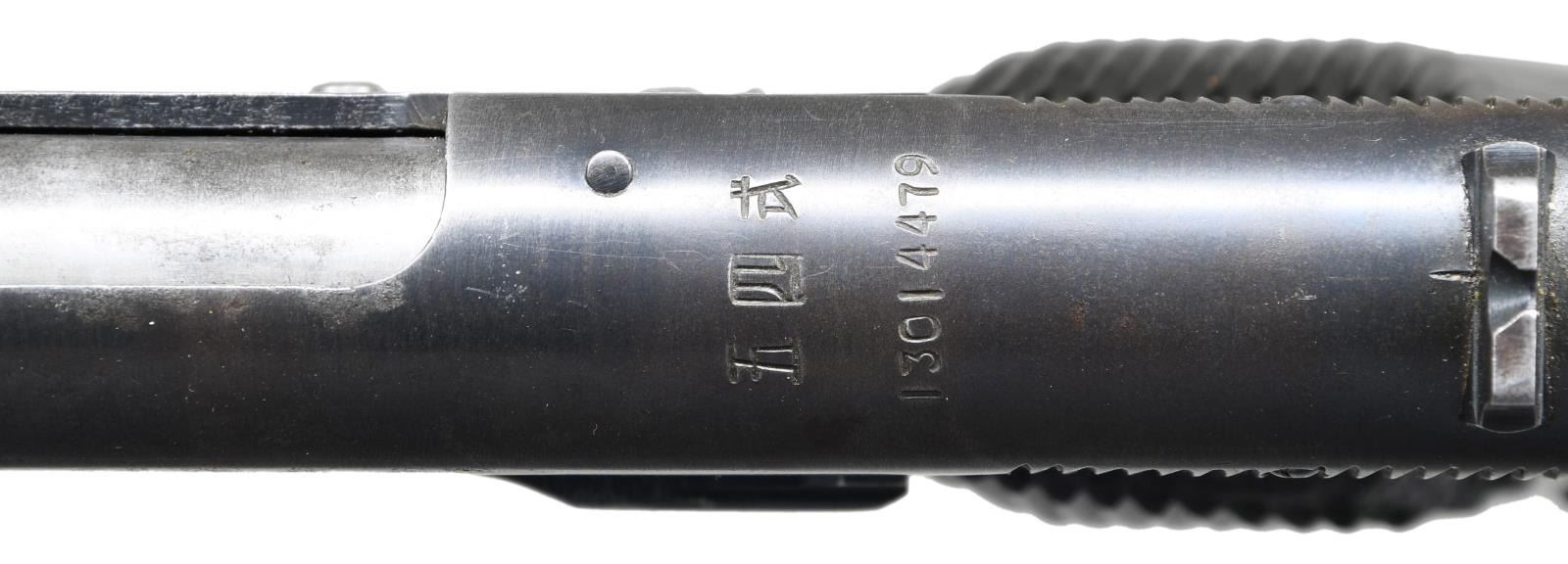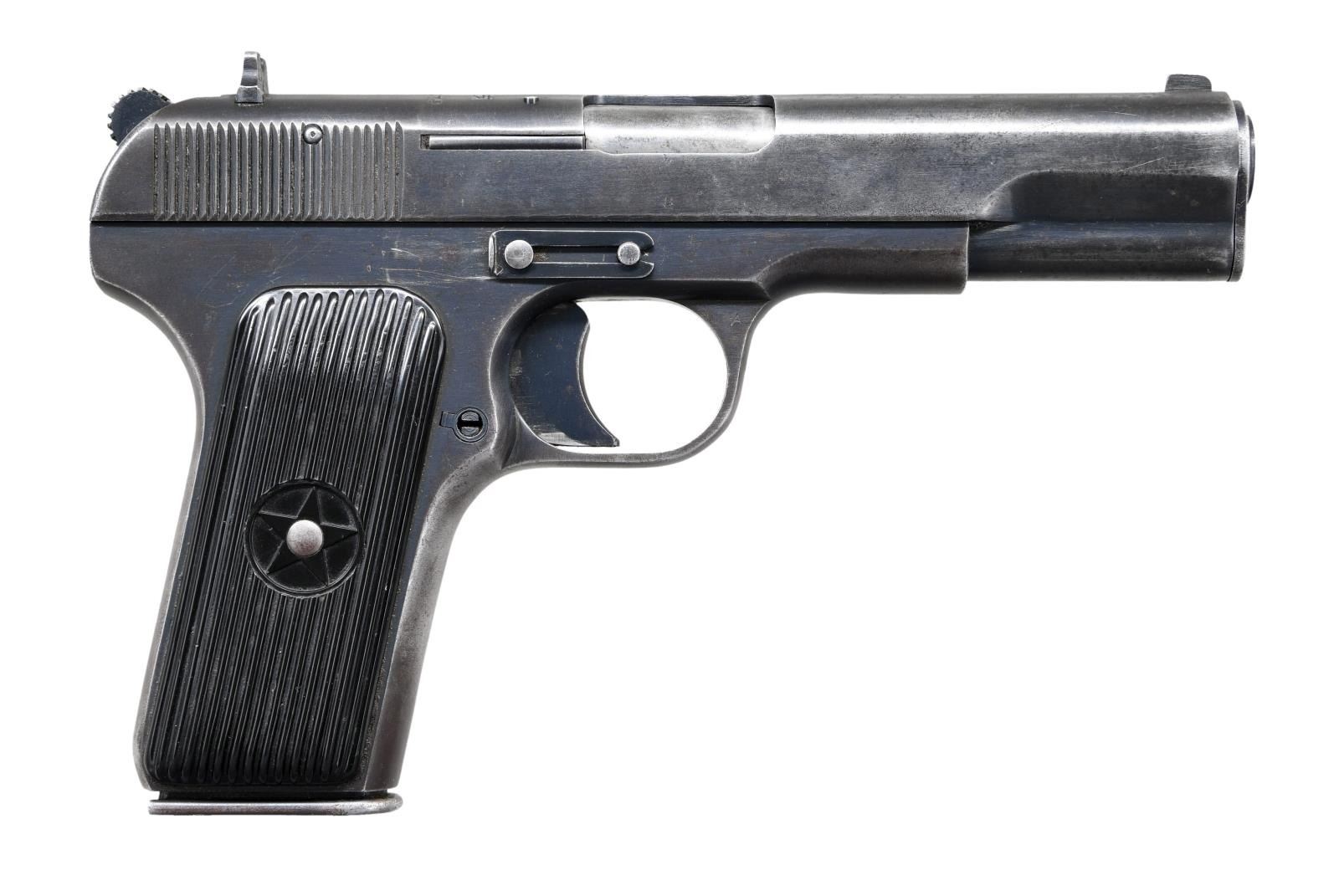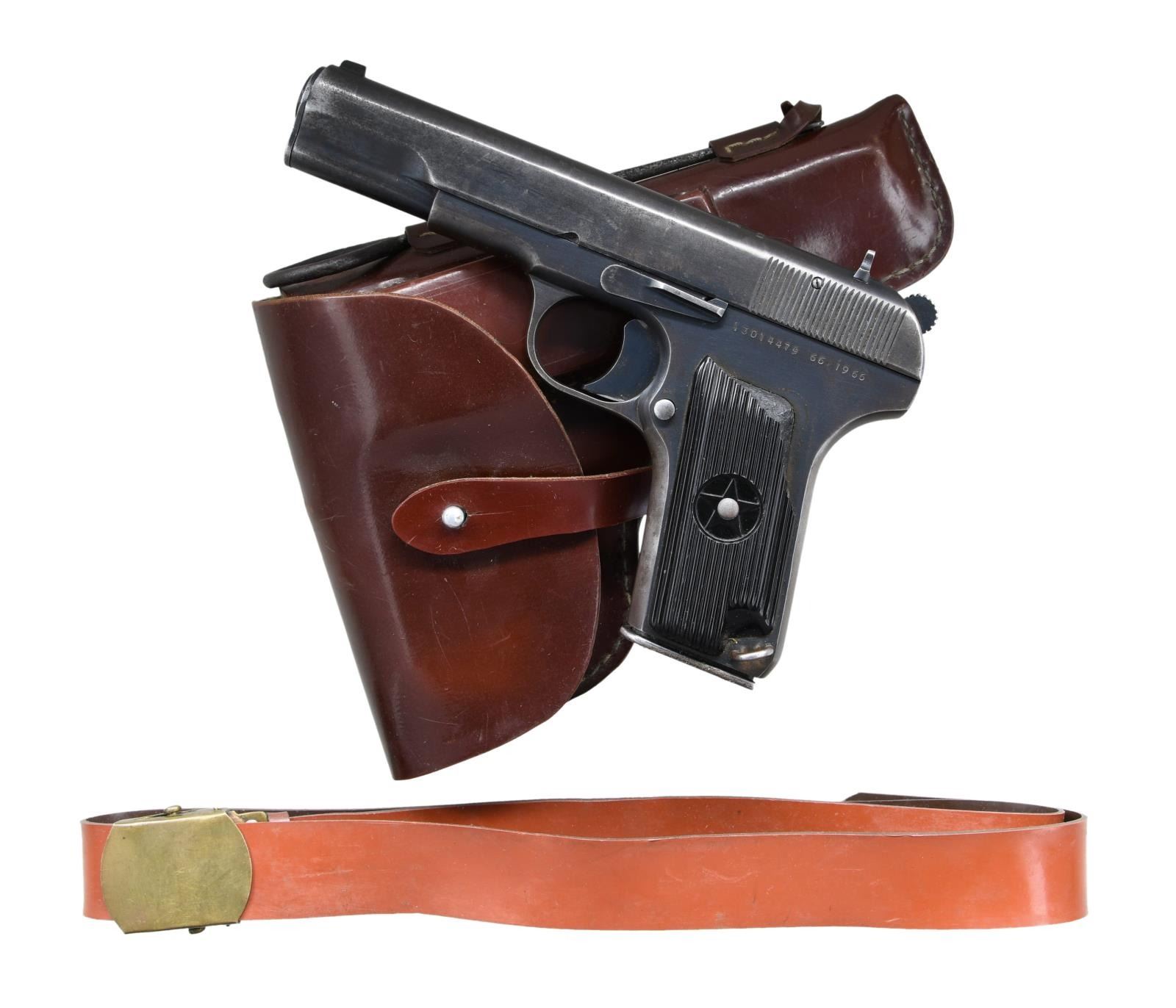 Cal. 7.62x25. S# 13014479. Bbl. 4.5". Mfg. 1966. Matching numbers on slide, bbl. & hammer housing. Left side of frame marked w/ serial number, arsenal 66 marking & 1966 date. Top of slide has serial number & Chinese markings. There are no import markings or added safety present. Given the date & lack of import features it is very possible this pistol was a Vietnam war bringback but there is no documentation to prove it. Grooved black plastic grips w/ Communist star. MAGS: 2 steel. 8 rd. UNATTACHED ACCESSORIES: Brown leather holster & belt, still retaining cleaning rod. CONDITION: Coverage is complete though thin in some areas including high spots & muzzle. Right grip is in nice condition while left grip is missing the top, right portion. Bore is bright retaining strong rifling. PROVENANCE: From the Lifelong Collection of Glen E. Mattox. (23-105/JZ). CURIO. $300-500.