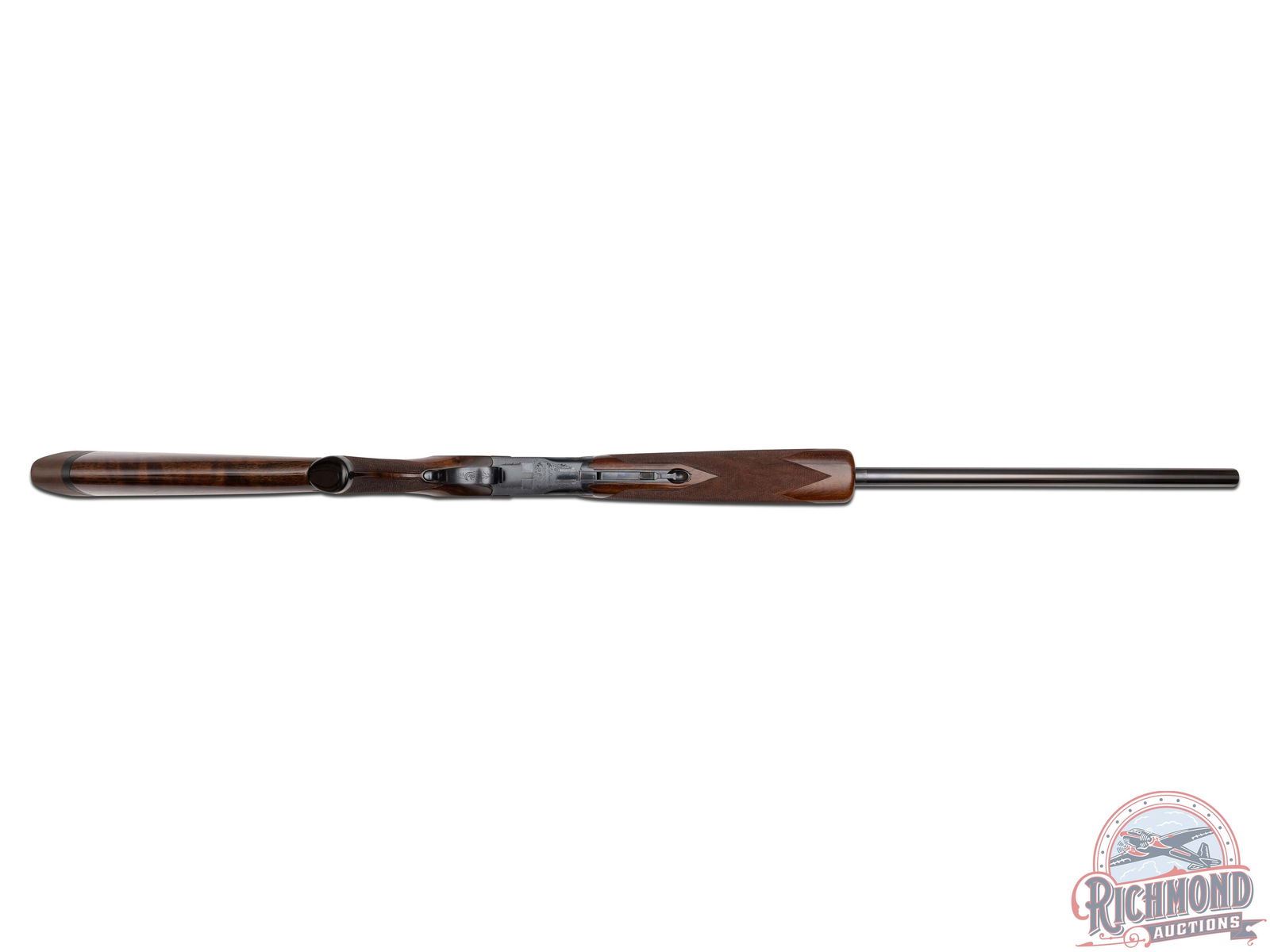 Manufactured in 1970, in Belgium. This Browning Superposed Lightning Broadway is a Grade I. Features 30" blued barrels with factory Broadway wide ventilated rib, chambered for 2-3/4" shells, top choked full and bottom improved modified. White mid-barrel bead sight and red fiber optic front sight. Blued boxlock action features floral scroll engraving on the sides, top, lever and bottom trigger guard. Bottom of the receiver is engraved "Lightning" in script, "BROWNING" and a portrait of John Moses Browning. The action is fitted with a gold washed single selective inertia trigger and a non-automatic safety. Grade 1 quality walnut long tang stock with checkered pistol grip and ebony cap. Semi- beavertail fore-end with matching hand-checkering. Fitted with a Kick-Eez brown rubber butt plate. Comes in a factory Browning factory take-down case. LOP: 14". DAC: 1-1/2". DAH: 2-1/4". CALIBER: 12 GA. S/N: 19633S70. FFL STATUS: Curio & Relic.