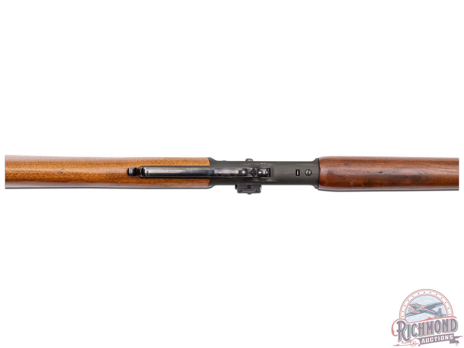 Manufactured circa 1975. This pre-safety model features an 18-1/2" blued round barrel, stamped with the Marlin Firearms Co address and "MOD. 1894-CARBINE MICRO-GROOVE-CAL.357 MAGNUM". "JM" stamped on the left side of the barrel near the receiver. Polished blued and matte finished receiver with Lyman fully adjustable rear peep sight and blade front sight with brass bead. Smooth walnut wood stock and foregrip. Marlin black "bullseye" on the bottom of the stock. Marlin factory white lined synthetic butt stock. Fitted with swivel sling rings. LOP: 13-1/4". CALIBER: 357 MAG. S/N: 20048919. FFL STATUS: Modern.