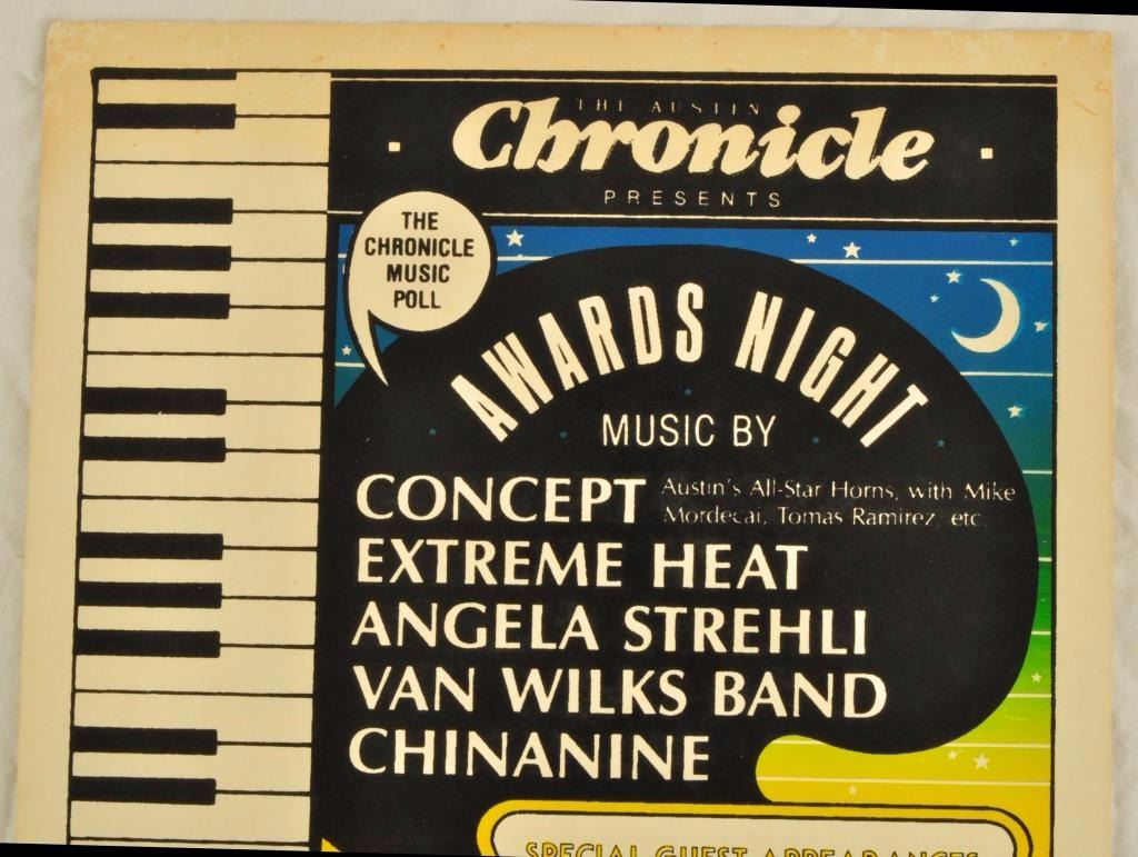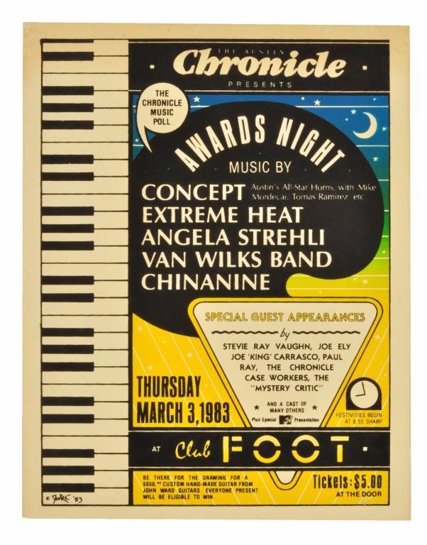 First annual Austin Chronicle Music Awards Poster at Club Foot, Austin, TX. March 3, 1983. Artist: Guy Juke. 11" x 15".