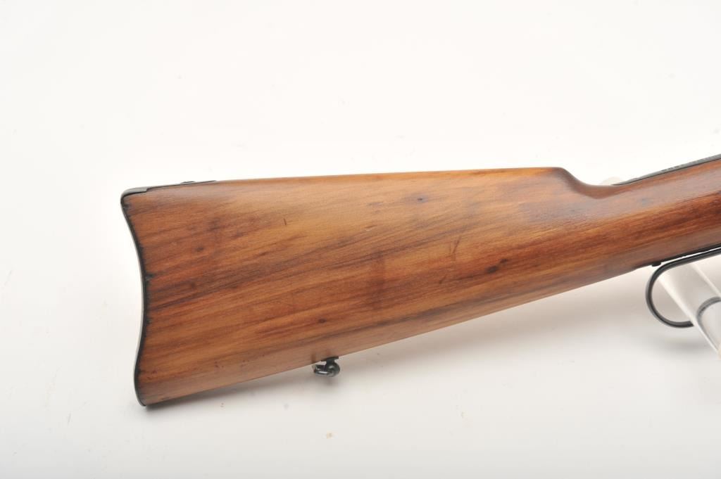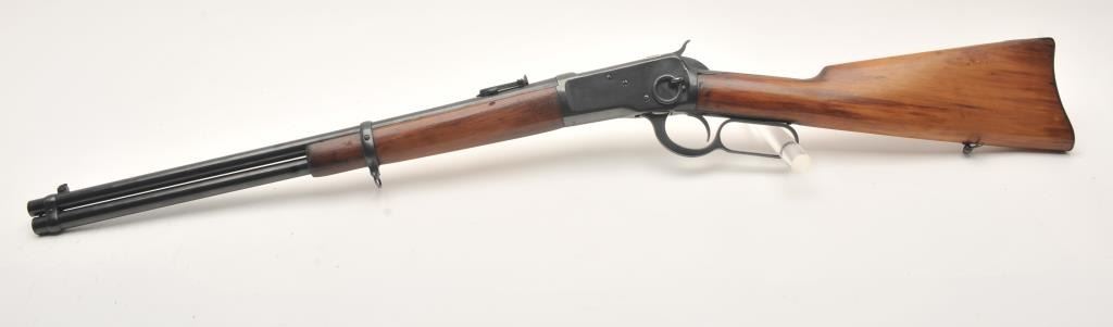 Winchester Model 1892 lever action SRC, .44 WCF caliber, 20” barrel, old re-blued finish, refinished wood stocks, sling swivels, “E” marked on front left side of receiver; crisp action, bright bore, good wood stocks; purchased by our consignor ca. 1968 at Serven’s Santa Ana Gun Room; purportedly the “E” on receiver signifies “Federal Police” out of a Mexican Arsenal. (C&R). Est.: $500-$1,000.