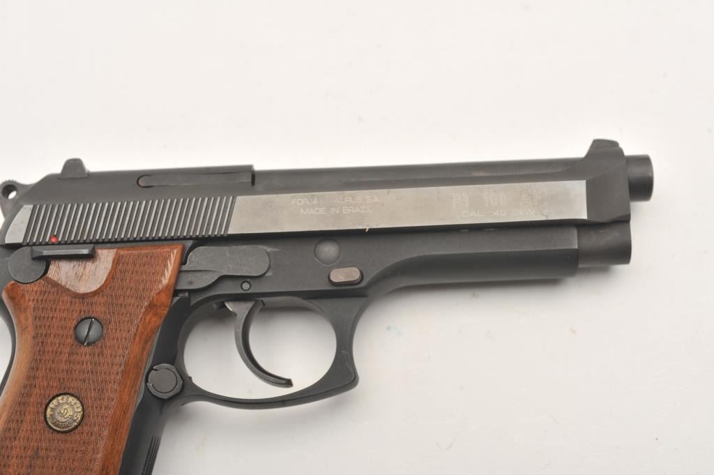 Taurus Model PT100 AF DA semi-automatic pistol, .40 S&W caliber, 4.75” barrel, blued finish, checkered wood medallion grips, no magazine, S/N SNE76472; like new condition with factory cardboard box, instructions and cleaning brush. (Modern/PPT). Est.: $250-$500.