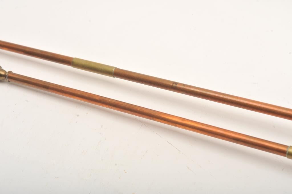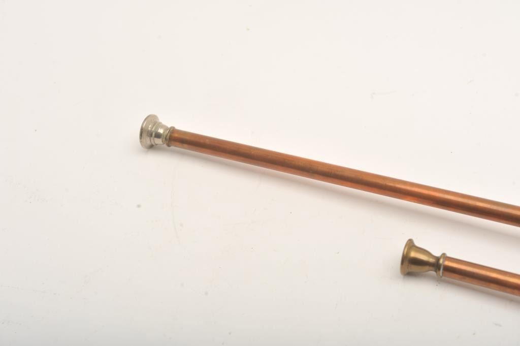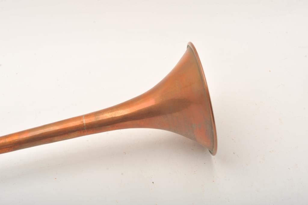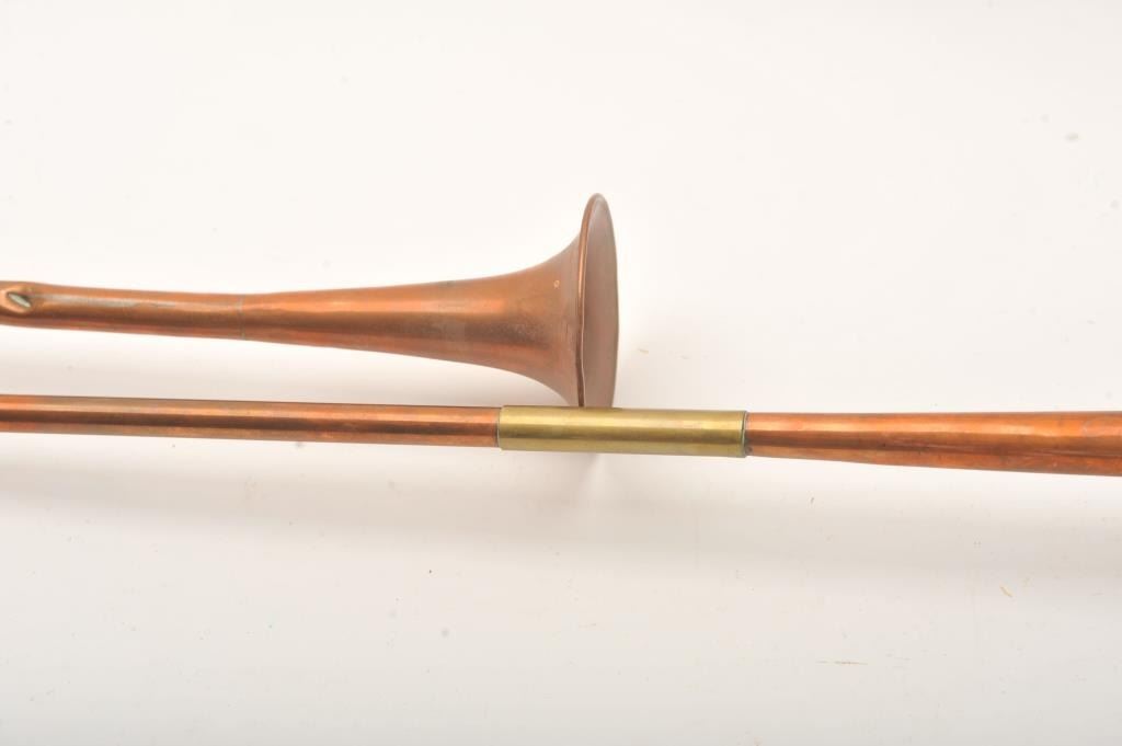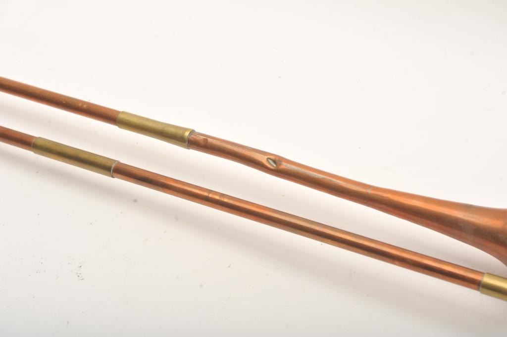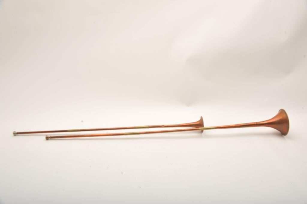 Lot of two copper long stem calling horns, 48” and 39.5” overall with mouthpieces; “tally ho”! Est.: $50-$100.