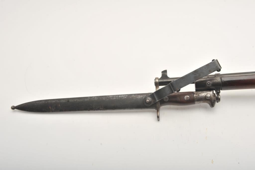 Springfield Krag Model 1898 .30-40 caliber rifle, S/N 261559. Sharp and fully defined cartouche dated 1900. Very good overall condition with most original blue on barrel and toned to brown/gray action with minor erosion and light pitting. The stock is very good plus with minor dings, mars and dents. Sharp markings. Bright bore with brass muzzle cover. From Dr. Cairns collection stored for decades and will clean nicely. (C&R) Est.: $400-$800
