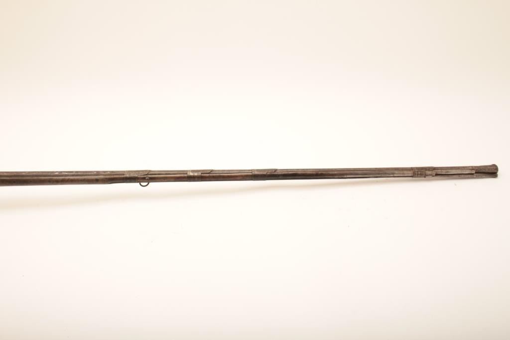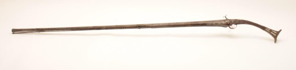 Albanian Miquelet flintlock musket with engraved metal stock and pearl inlay. Good quality with octagon barrel. Ramrod retained. Generally very good overall and better quality than normally found. Measures 66” overall with a 53” barrel of 60 plus smoothbore. (Antique) Est.: $700-$1400