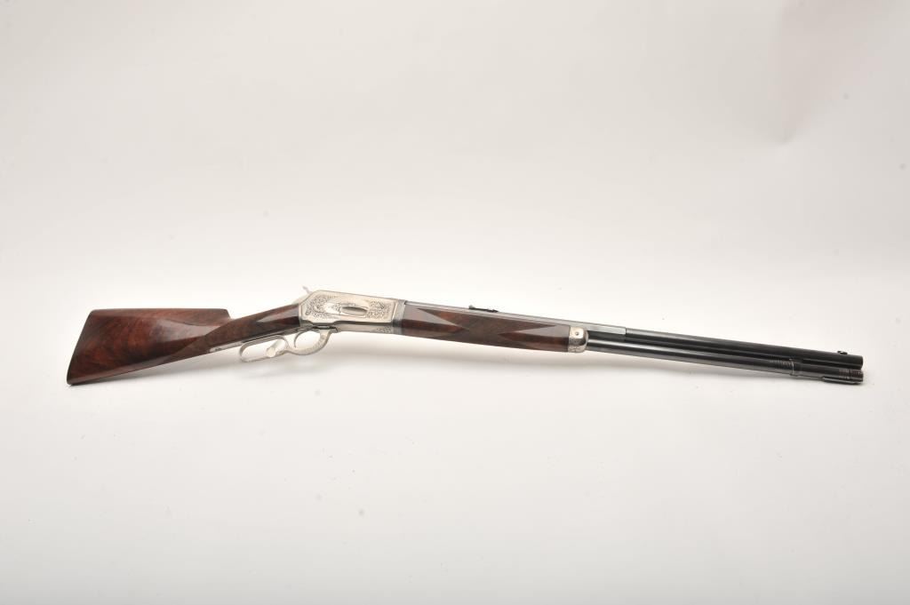 Winchester 1886 rifle in .50 express caliber with 26” half round/half octagon barrel, full mag, take down frame, French dealer marked and proofed with European style vine and leaf engraving. Also deluxe wood restocked in walnut with fine checkering and shotgun style butt with metal butt plate. Satin gray finished frame and soft rust blued barrels. Two leaf folding Winchester rear sight. S/N 139685. The bore is bright. Fine as recondition on special order for French big game hunter. A very attractive 86. (C&R) Est.: $6000-$12,000