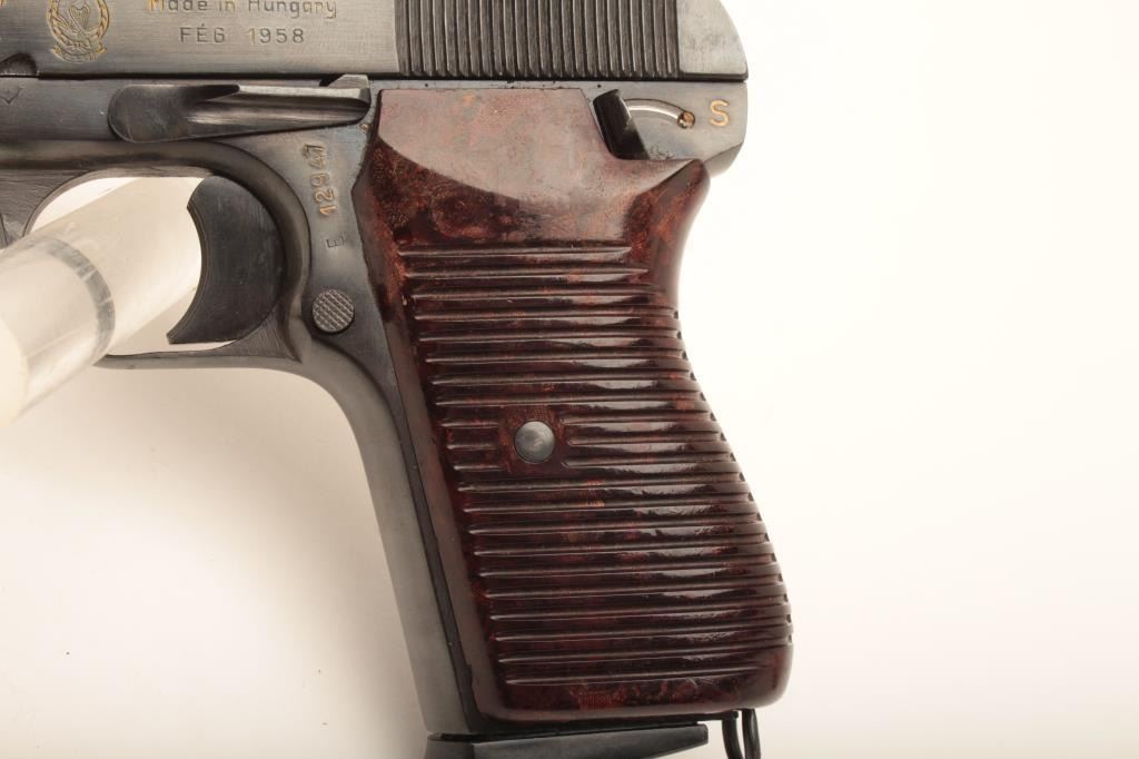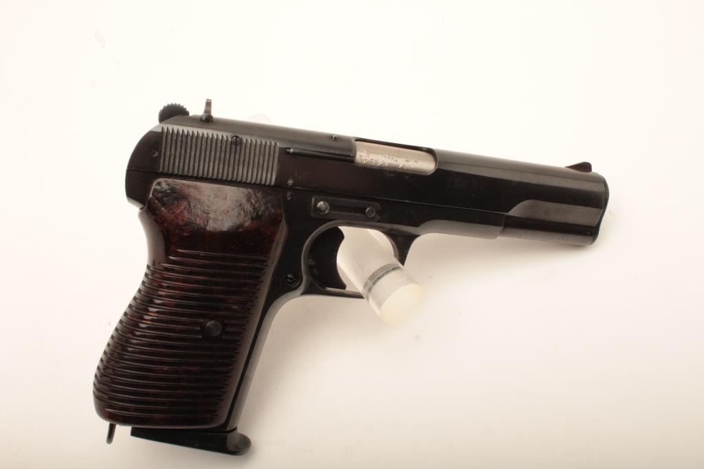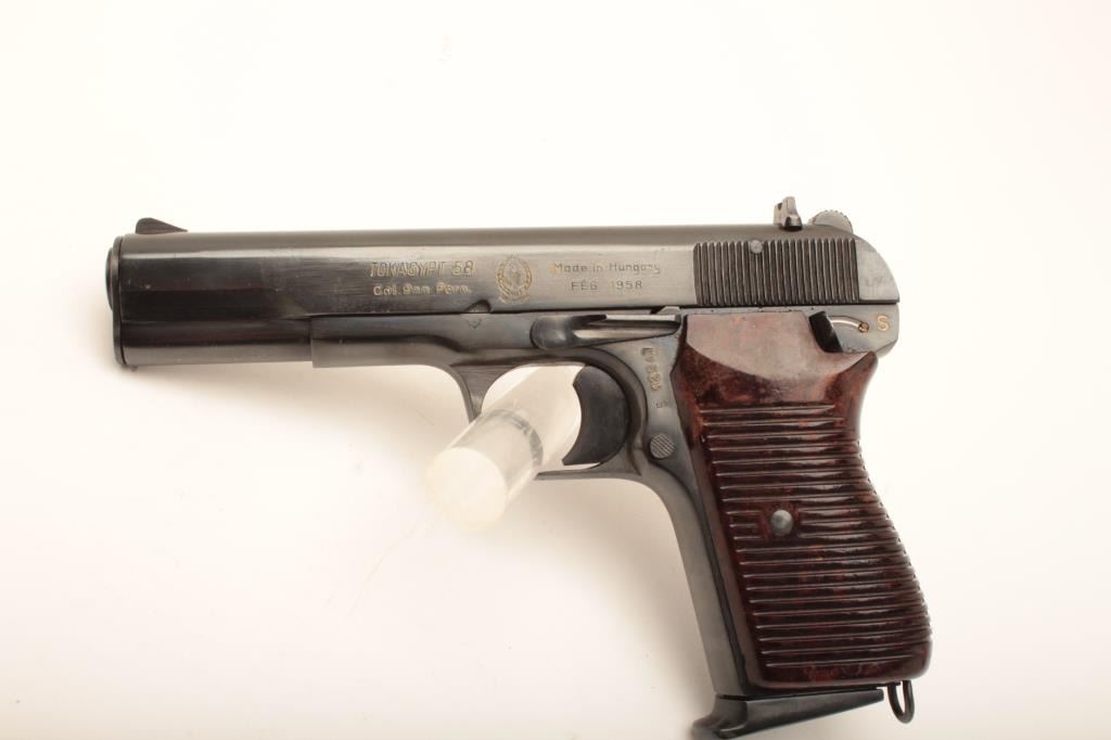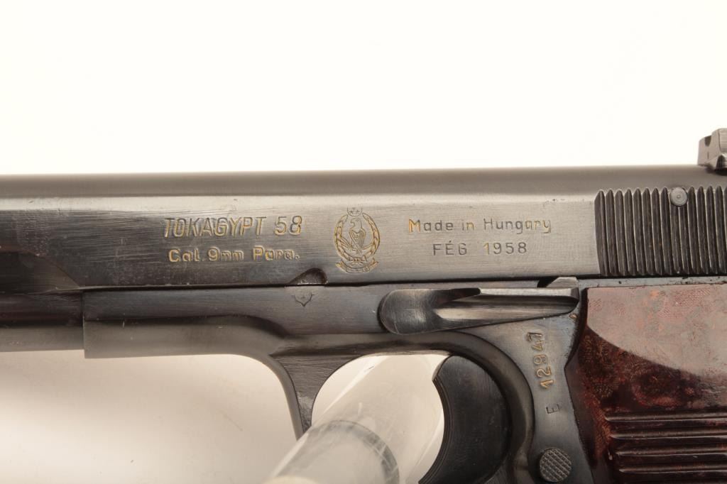 Tokagypt 58, #E12947, 9mm, 4 1/2" barrel, blued finish, fixed sights, bakelite grips. Pistol is in near fine condition overall, with very minor freckling starting on several spots on the slide. Egyptian crest on the left side of the slide. Bore is fine, action is very good, one matching mag. Made in 1958. (C&R/PPT) Est. $400-800